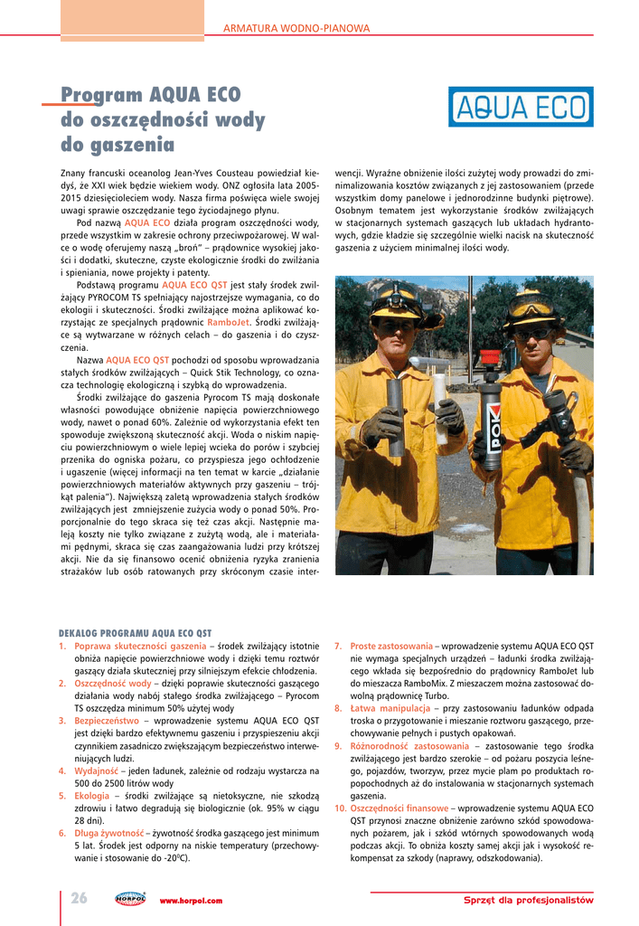 ARMATURA WODNO-PIANOWA Program AQUA ECO do oszczędności wody do gaszenia Znany francuski oceanolog Jean-Yves Cousteau powiedział kiedyś, że XXI wiek będzie wiekiem wody. ONZ ogłosiła lata 20052015 dziesięcioleciem wody. Nasza firma poświęca wiele swojej uwagi sprawie oszczędzanie tego życiodajnego płynu. Pod nazwą AQUA ECO działa program oszczędności wody, przede wszystkim w zakresie ochrony przeciwpożarowej. W walce o wodę oferujemy naszą „broń” – prądownice wysokiej jakości i dodatki, skuteczne, czyste ekologicznie środki do zwilżania i spieniania, nowe projekty i patenty. Podstawą programu AQUA ECO QST jest stały środek zwilżający PYROCOM TS spełniający najostrzejsze wymagania, co do ekologii i skuteczności. Środki zwilżające można aplikować korzystając ze specjalnych prądownic RamboJet. Środki zwilżające są wytwarzane w różnych celach – do gaszenia i do czyszczenia. Nazwa AQUA ECO QST pochodzi od sposobu wprowadzania stałych środków zwilżających – Quick Stik Technology, co oznacza technologię ekologiczną i szybką do wprowadzenia. Środki zwilżające do gaszenia Pyrocom TS mają doskonałe własności powodujące obniżenie napięcia powierzchniowego wody, nawet o ponad 60%. Zależnie od wykorzystania efekt ten spowoduje zwiększoną skuteczność akcji. Woda o niskim napięciu powierzchniowym o wiele lepiej wcieka do porów i szybciej przenika do ogniska pożaru, co przyspiesza jego ochłodzenie i ugaszenie (więcej informacji na ten temat w karcie „działanie powierzchniowych materiałów aktywnych przy gaszeniu – trójkąt palenia”). Największą zaletą wprowadzenia stałych środków zwilżających jest zmniejszenie zużycia wody o ponad 50%. Proporcjonalnie do tego skraca się też czas akcji. Następnie maleją koszty nie tylko związane z zużytą wodą, ale i materiałami pędnymi, skraca się czas zaangażowania ludzi przy krótszej akcji. Nie da się finansowo ocenić obniżenia ryzyka zranienia strażaków lub osób ratowanych przy skróconym czasie inter- wencji. Wyraźne obniżenie ilości zużytej wody prowadzi do zminimalizowania kosztów związanych z jej zastosowaniem (przede wszystkim domy panelowe i jednorodzinne budynki piętrowe). Osobnym tematem jest wykorzystanie środków zwilżających w stacjonarnych systemach gaszących lub układach hydrantowych, gdzie kładzie się szczególnie wielki nacisk na skuteczność gaszenia z użyciem minimalnej ilości wody. DEKALOG PROGRAMU AQUA ECO QST 1. Poprawa skuteczności gaszenia – środek zwilżający istotnie obniża napięcie powierzchniowe wody i dzięki temu roztwór gaszący działa skuteczniej przy silniejszym efekcie chłodzenia. 2. Oszczędność wody – dzięki poprawie skuteczności gaszącego działania wody nabój stałego środka zwilżającego – Pyrocom TS oszczędza minimum 50% użytej wody 3. Bezpieczeństwo – wprowadzenie systemu AQUA ECO QST jest dzięki bardzo efektywnemu gaszeniu i przyspieszeniu akcji czynnikiem zasadniczo zwiększającym bezpieczeństwo interweniujących ludzi. 4. Wydajność – jeden ładunek, zależnie od rodzaju wystarcza na 500 do 2500 litrów wody 5. Ekologia – środki zwilżające są nietoksyczne, nie szkodzą zdrowiu i łatwo degradują się biologicznie (ok. 95% w ciągu 28 dni). 6. Długa żywotność – żywotność środka gaszącego jest minimum 5 lat. Środek jest odporny na niskie temperatury (przechowywanie i stosowanie do -200C). 26 7. Proste zastosowania – wprowadzenie systemu AQUA ECO QST nie wymaga specjalnych urządzeń – ładunki środka zwilżającego wkłada się bezpośrednio do prądownicy RamboJet lub do mieszacza RamboMix. Z mieszaczem można zastosować dowolną prądownicę Turbo. 8. Łatwa manipulacja – przy zastosowaniu ładunków odpada troska o przygotowanie i mieszanie roztworu gaszącego, przechowywanie pełnych i pustych opakowań. 9. Różnorodność zastosowania – zastosowanie tego środka zwilżającego jest bardzo szerokie – od pożaru poszycia leśnego, pojazdów, tworzyw, przez mycie plam po produktach ropopochodnych aż do instalowania w stacjonarnych systemach gaszenia. 10. Oszczędności finansowe – wprowadzenie systemu AQUA ECO QST przynosi znaczne obniżenie zarówno szkód spowodowanych pożarem, jak i szkód wtórnych spowodowanych wodą podczas akcji. To obniża koszty samej akcji jak i wysokość rekompensat za szkody (naprawy, odszkodowania).