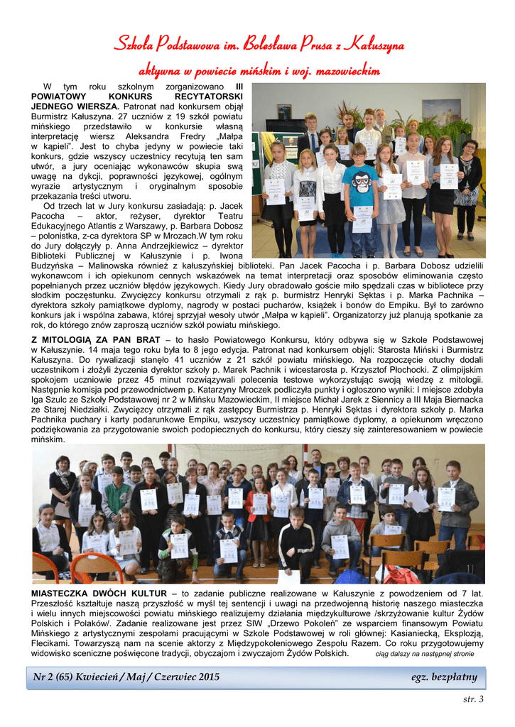 Szkoła Podstawowa im. Bolesława Prusa z Kałuszyna aktywna w powiecie mińskim i woj. mazowieckim W tym roku szkolnym zorganizowano III POWIATOWY KONKURS RECYTATORSKI JEDNEGO WIERSZA. Patronat nad konkursem objął Burmistrz Kałuszyna. 27 uczniów z 19 szkół powiatu mińskiego przedstawiło w konkursie własną interpretację wiersz Aleksandra Fredry „Małpa w kąpieli”. Jest to chyba jedyny w powiecie taki konkurs, gdzie wszyscy uczestnicy recytują ten sam utwór, a jury oceniając wykonawców skupia swą uwagę na dykcji, poprawności językowej, ogólnym wyrazie artystycznym i oryginalnym sposobie przekazania treści utworu. Od trzech lat w Jury konkursu zasiadają: p. Jacek Pacocha – aktor, reżyser, dyrektor Teatru Edukacyjnego Atlantis z Warszawy, p. Barbara Dobosz – polonistka, z-ca dyrektora SP w Mrozach.W tym roku do Jury dołączyły p. Anna Andrzejkiewicz – dyrektor Biblioteki Publicznej w Kałuszynie i p. Iwona Budzyńska – Malinowska również z kałuszyńskiej biblioteki. Pan Jacek Pacocha i p. Barbara Dobosz udzielili wykonawcom i ich opiekunom cennych wskazówek na temat interpretacji oraz sposobów eliminowania często popełnianych przez uczniów błędów językowych. Kiedy Jury obradowało goście miło spędzali czas w bibliotece przy słodkim poczęstunku. Zwycięzcy konkursu otrzymali z rąk p. burmistrz Henryki Sęktas i p. Marka Pachnika – dyrektora szkoły pamiątkowe dyplomy, nagrody w postaci pucharów, książek i bonów do Empiku. Był to zarówno konkurs jak i wspólna zabawa, której sprzyjał wesoły utwór „Małpa w kąpieli”. Organizatorzy już planują spotkanie za rok, do którego znów zaproszą uczniów szkół powiatu mińskiego. Z MITOLOGIĄ ZA PAN BRAT – to hasło Powiatowego Konkursu, który odbywa się w Szkole Podstawowej w Kałuszynie. 14 maja tego roku była to 8 jego edycja. Patronat nad konkursem objęli: Starosta Miński i Burmistrz Kałuszyna. Do rywalizacji stanęło 41 uczniów z 21 szkół powiatu mińskiego. Na rozpoczęcie otuchy dodali uczestnikom i złożyli życzenia dyrektor szkoły p. Marek Pachnik i wicestarosta p. Krzysztof Płochocki. Z olimpijskim spokojem uczniowie przez 45 minut rozwiązywali polecenia testowe wykorzystując swoją wiedzę z mitologii. Następnie komisja pod przewodnictwem p. Katarzyny Mroczek podliczyła punkty i ogłoszono wyniki: I miejsce zdobyła Iga Szulc ze Szkoły Podstawowej nr 2 w Mińsku Mazowieckim, II miejsce Michał Jarek z Siennicy a III Maja Biernacka ze Starej Niedziałki. Zwycięzcy otrzymali z rąk zastępcy Burmistrza p. Henryki Sęktas i dyrektora szkoły p. Marka Pachnika puchary i karty podarunkowe Empiku, wszyscy uczestnicy pamiątkowe dyplomy, a opiekunom wręczono podziękowania za przygotowanie swoich podopiecznych do konkursu, który cieszy się zainteresowaniem w powiecie mińskim. MIASTECZKA DWÓCH KULTUR – to zadanie publiczne realizowane w Kałuszynie z powodzeniem od 7 lat. Przeszłość kształtuje naszą przyszłość w myśl tej sentencji i uwagi na przedwojenną historię naszego miasteczka i wielu innych miejscowości powiatu mińskiego realizujemy działania międzykulturowe /skrzyżowanie kultur Żydów Polskich i Polaków/. Zadanie realizowane jest przez SIW „Drzewo Pokoleń” ze wsparciem finansowym Powiatu Mińskiego z artystycznymi zespołami pracującymi w Szkole Podstawowej w roli głównej: Kasianiecką, Eksplozją, Flecikami. Towarzyszą nam na scenie aktorzy z Międzypokoleniowego Zespołu Razem. Co roku przygotowujemy widowisko sceniczne poświęcone tradycji, obyczajom i zwyczajom Żydów Polskich. ciąg dalszy na następnej stronie Nr 2 (65) Kwiecień / Maj / Czerwiec 2015 egz. bezpłatny str. 3