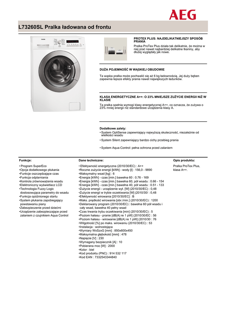 L73260SL Pralka ładowana od frontu PROTEX PLUS: NAJDELIKATNIEJSZY SPOSÓB PRANIA Pralka ProTex Plus działa tak delikatnie, że można w niej prać nawet najbardziej delikatne tkaniny, aby dłużej wyglądały jak nowe. DUŻA POJEMNOŚĆ W WĄSKIEJ OBUDOWIE Ta wąska pralka może pochwalić się aż 6 kg ładownością. Jej duży bęben zapewnia lepsze efekty prania nawet największych ładunków. KLASA ENERGETYCZNE A++: O 23% MNIEJSZE ZUŻYCIE ENERGII NIŻ W KLASIE Ta pralka spełnia wymogi klasy energetycznej A++, co oznacza, że zużywa o 23% mniej energii niż standardowe urządzenia klasy A. Dodatkowe zalety: • System OptiSense zapewniający najwyższą skuteczność, niezależnie od wielkości wsadu • System Silent zapewniający bardzo cichy przebieg prania • System Aqua-Control: pełna ochrona przed zalaniem Funkcje: Dane techniczne: Opis produktu: • Program SuperEco •Opcja dodatkowego płukania •Funkcje oszczędzające czas •Funkcja odplamiania •Kontrola zrównoważenia wsadu •Elektroniczny wyświetlacz LCD •Technologia Fuzzy Logic dostosowująca parametry do wsadu •Funkcja opóźnionego startu •System płukania zapobiegający powstawaniu piany •Zabezpieczenie przed dziećmi •Urządzenie zabezpieczające przed zalaniem z czujnikiem Aqua Control • Efektywność energetyczna (2010/30/EC) : A++ •Roczne zużycie energii [kWh] - wody [l] : 156,0 - 9890 •Maksymalny wsad [kg] : 6 •Energia [kWh] - czas [min.] bawełna 60 : 0.76 - 169 •Energia [kWh] - czas [min.] bawełna 60, pół wsadu : 0.66 - 154 •Energia [kWh] - czas [min.] bawełna 40, pół wsadu : 0.51 - 133 •Zużycie energii - urządzenie wył. [W] (2010/30/EC) : 0,48 •Zużycie energii w trybie oczekiwania [W] (2010/30/ : 0,48 •Efektywność wirowania [2010/30/EC] : B •Maks. prędkość wirowania [obr./min.] (2010/30/EC) : 1200 •Deklarowany program (2010/30/EC) : bawełna 60 pół wsadu i cały wsad, bawełna 40 pełny wsad •Czas trwania trybu oczekiwania [min] (2010/30/EC) : 5 •Poziom hałasu - pranie [dB(A) re 1 pW] (2010/30/EC : 56 •Poziom hałasu - wirowanie [dB(A) re 1 pW] (2010/30 : 76 •Wilgotność [%] po maks. wirowaniu (2010/30/EC) : 53 •Instalacja : wolnostojąca •Wymiary WxSzxG [mm] : 850x600x450 •Maksymalna głębokość [mm] : 478 •Napięcie [V] : 230 •Wymagany bezpiecznik [A] : 10 •Pobierana moc [W] : 2000 •Kolor : biel •Kod produktu (PNC) : 914 532 117 •Kod EAN : 7332543344840 Pralka ProTex Plus, klasa A++.
