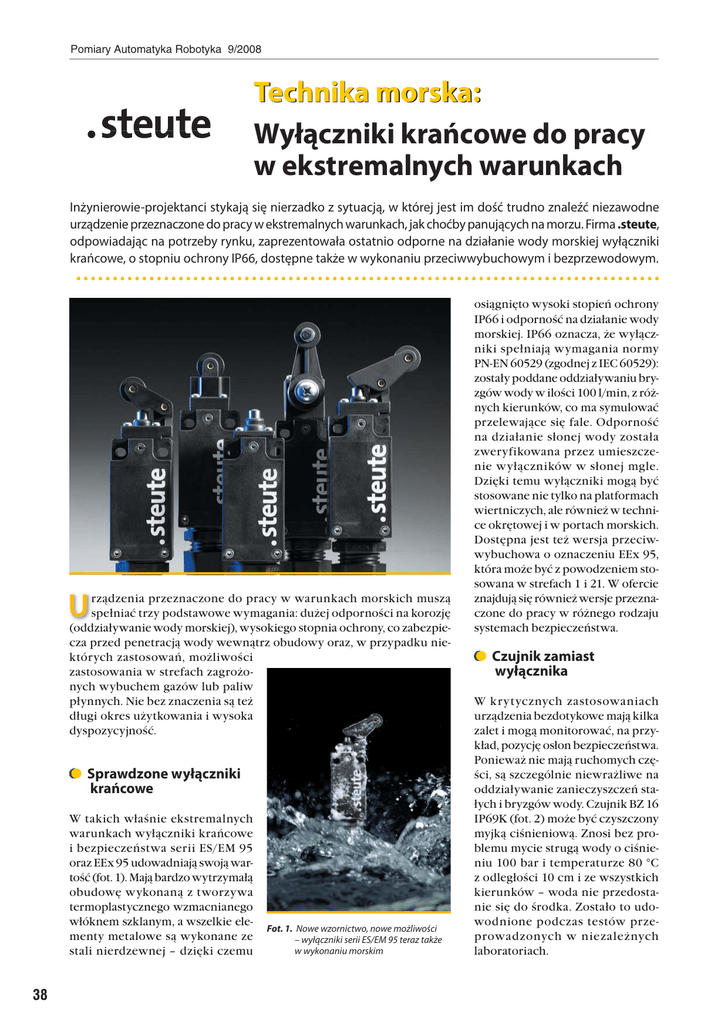 Pomiary Automatyka Robotyka 9/2008 Technika morska: Wyłączniki krańcowe do pracy w ekstremalnych warunkach Inżynierowie-projektanci stykają się nierzadko z sytuacją, w której jest im dość trudno znaleźć niezawodne urządzenie przeznaczone do pracy w ekstremalnych warunkach, jak choćby panujących na morzu. Firma .steute, odpowiadając na potrzeby rynku, zaprezentowała ostatnio odporne na działanie wody morskiej wyłączniki krańcowe, o stopniu ochrony IP66, dostępne także w wykonaniu przeciwwybuchowym i bezprzewodowym. rządzenia przeznaczone do pracy w warunkach morskich muszą spełniać trzy podstawowe wymagania: dużej odporności na korozję (oddziaływanie wody morskiej), wysokiego stopnia ochrony, co zabezpiecza przed penetracją wody wewnątrz obudowy oraz, w przypadku niektórych zastosowań, możliwości zastosowania w strefach zagrożonych wybuchem gazów lub paliw płynnych. Nie bez znaczenia są też długi okres użytkowania i wysoka dyspozycyjność. Sprawdzone wyłączniki krańcowe W takich właśnie ekstremalnych warunkach wyłączniki krańcowe i bezpieczeństwa serii ES/EM 95 oraz EEx 95 udowadniają swoją wartość (fot. 1). Mają bardzo wytrzymałą obudowę wykonaną z tworzywa termoplastycznego wzmacnianego włóknem szklanym, a wszelkie elementy metalowe są wykonane ze stali nierdzewnej – dzięki czemu 38 Fot. 1. Nowe wzornictwo, nowe możliwości – wyłączniki serii ES/EM 95 teraz także w wykonaniu morskim osiągnięto wysoki stopień ochrony IP66 i odporność na działanie wody morskiej. IP66 oznacza, że wyłączniki spełniają wymagania normy PN-EN 60529 (zgodnej z IEC 60529): zostały poddane oddziaływaniu bryzgów wody w ilości 100 l/min, z różnych kierunków, co ma symulować przelewające się fale. Odporność na działanie słonej wody została zweryfikowana przez umieszczenie wyłączników w słonej mgle. Dzięki temu wyłączniki mogą być stosowane nie tylko na platformach wiertniczych, ale również w technice okrętowej i w portach morskich. Dostępna jest też wersja przeciwwybuchowa o oznaczeniu EEx 95, która może być z powodzeniem stosowana w strefach 1 i 21. W ofercie znajdują się również wersje przeznaczone do pracy w różnego rodzaju systemach bezpieczeństwa. Czujnik zamiast wyłącznika W krytycznych zastosowaniach urządzenia bezdotykowe mają kilka zalet i mogą monitorować, na przykład, pozycję osłon bezpieczeństwa. Ponieważ nie mają ruchomych części, są szczególnie niewrażliwe na oddziaływanie zanieczyszczeń stałych i bryzgów wody. Czujnik BZ 16 IP69K (fot. 2) może być czyszczony myjką ciśnieniową. Znosi bez problemu mycie strugą wody o ciśnieniu 100 bar i temperaturze 80 °C z odległości 10 cm i ze wszystkich kierunków – woda nie przedostanie się do środka. Zostało to udowodnione podczas testów przeprowadzonych w niezależnych laboratoriach. Pomiary Automatyka Robotyka 9/2008 Zgodnie z oczekiwaniami klienta: czujnik odporny na wstrząsy W niektórych dziedzinach zastosowań w przemyśle okrętowym odporność na wstrząsy odgrywa ważną rolę. Także i tutaj jesteśmy w stanie zaproponować odpowiednie rozwiązania. Na przykład, specjalnie dla producenta łodzi podwodnych został opracowany czujnik kontrolujący pozycję zaworów, odporny na wstrząsy o sile do 400g. Nowość: samowystarczalny wyłącznik bezprzewodowy dla ekstremalnych zastosowań Fot. 2. Odporne na wilgoć: czujniki BZ 16 IP69K mogą być myte gorącą wodą pod wysokim ciśnieniem Podobnie rzecz się ma z magnetycznym czujnikiem bezpieczeństwa serii EEx RC Si M30 IP69K w obudowie cylindrycznej, wykonanej ze stali nierdzewnej (fot. 3). Ten solidny czujnik jest przeznaczony do Całkowitą nowością wśród urządzeń przeciwwybuchowych przeznaczonych do pracy w warunkach morskich są bezprzewodowe, niewymagające zasilania zewnętrznego wyłączniki serii EExF 95 (fot. 4). Transmitują bezprzewodowo sygnały sterujące, a energię niezbędną do tego celu dostarcza niewielki generator elektrodynamiczny, przetwarzający energię kinetyczną, pochodzącą z napędu wyłącznika, w energię elektryczną. Takie rozwiązanie pozwala uniknąć drogiego i podatnego na uszkodzenie w warunkach morskich okablowania. Kompletny w yłącznik radiow y jest klasyfikowany jako urządzenie Fot. 4. Bezprzewodowe i niewymagające zasilania: wyłączniki EExF 95 przeznaczone iskrobezpieczne. Dla zastosowań do pracy w strefach zagrożonych wybuw strefie 1 (zagrożenie wybuchem chem gazów) jest zaprojektowany zgodnie z normą DIN-EN 60079-11 (i) [polski odpowiednik PN-EN 60079-11 (i)], natomiast wyłączniki przeznaczone dla strefy 21 (zagrożenie wybuchem pyłu) zostały skonstruowane zgodnie z założeniami normy DIN-EN 61241-11 (iD) [polski odpowiednik PN-EN 61241-11 (iD)]. Dostępne są stosowne certyfikaty. Bogata oferta napędów pozwala na precyzyjne dostosowanie wyłącznika do konkretnej aplikacji. W ofercie firmy znajdują się także różnego rodzaju odbiorniki radiowe. .e-mail: [email protected] www.steute.pl steute: wyłączniki do złożonych zastosowań Fot. 3. Zamknięty w obudowie ze stali nierdzewnej: magnetyczny czujnik bezpieczeństwa RC Si M30 pracy w strefach zagrożonych wybuchem i zapewnia jednocześnie wysoki poziom bezpieczeństwa, ponieważ zastosowany magnes jest kodowany: czujnik nie reaguje na pole magnetyczne konwencjonalnych magnesów. Duża odległość przełączania, wynosząca 8 mm, pozwala na montaż urządzenia ukryty za niemagnetycznymi osłonami. Firma steute Schaltgeräte GmbH & Co. KG, mieszcząca się w miejscowości Löhne w Niemczech, wyspecjalizowała się w projektowaniu i produkcji bezpiecznego osprzętu łączeniowego do złożonych i krytycznych zastosowań, koncentrując się na trzech głównych dziedzinach: technice sterowania, ochronie przeciwwybuchowej oraz technice medycznej. Oferta obejmuje m.in. wyłączniki krańcowe, wyłączniki bezpieczeństwa, syst