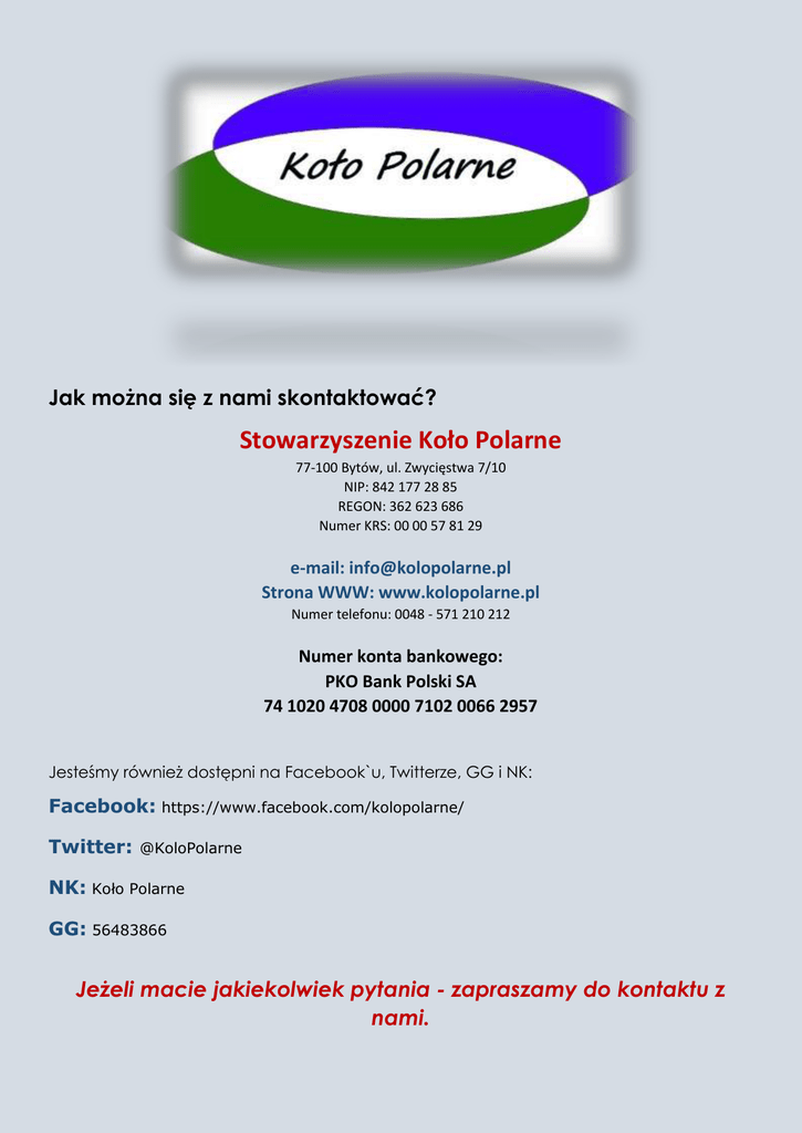 Jak można się z nami skontaktować? Stowarzyszenie Koło Polarne 77-100 Bytów, ul. Zwycięstwa 7/10 NIP: 842 177 28 85 REGON: 362 623 686 Numer KRS: 00 00 57 81 29 e-mail: [email protected] Strona WWW: www.kolopolarne.pl Numer telefonu: 0048 - 571 210 212 Numer konta bankowego: PKO Bank Polski SA 74 1020 4708 0000 7102 0066 2957 Jesteśmy również dostępni na Facebook`u, Twitterze, GG i NK: Facebook: https://www.facebook.com/kolopolarne/ Twitter: @KoloPolarne NK: Koło Polarne GG: 56483866 Jeżeli macie jakiekolwiek pytania - zapraszamy do kontaktu z nami.