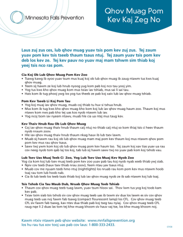 Qhov Muag Pom Kev Kaj Zeg No Laus zuj zus ces, lub qhov muag yuav tsis pom kev zuj zus. Tej zaum yuav pom kev tsis tseeb thaum tsaus ntuj. Tej zaum yuav tsis pom kev deb los kev ze. Tej kev pauv no yuav maj mam tshwm sim thiab koj yeej tsis nco ras pom. Cia Koj Ob Lub Qhov Muag Pom Kev Zoo • Tsawg kawg ib xyoo yuav tsum mus kuaj koj ob lub qhov muag ib zaug ntawm tus kws kuaj qhov muag. • Teem sij hawm ze koj lub hnub nyoog yug kom pab koj nco tau yooj yim. • Yog tus kws kho qhov muag kom mus txiav iav tshiab, mus sai li sai tau. • Hais kom ib tug phooj ywg los yog tus theeb ze pab koj xaiv lub iav qhov muag tshiab. Pom Kev Tseeb Li Koj Pom Tau • Yog koj muaj iav qhov muag, muab coj thiab tu huv si txhua hnub. • Mus kom ib tug kws kho qhov muag kho kom koj lub iav qhov muag haum zoo. Thaum koj mus ntawv kom nws pab kho tej uas kos nyob ntawm lub iav. • Yog ncoj tsom iav nyeem ntawv, muab hle cia ua ntej mus taug kev. Kev Thaiv Hnub Rau Ob Lub Qhov Muag • Coj iav qhov muag thaiv hnub thaum caij ntuj no thiab caij ntuj so kom thiaj tsis ci heev thaum nyob nraum zoov. • Hle iav qhov muag thaiv hnub thaum nkag hauv ib lub tsev lawm. • Muab sij hawm rau koj ob lub qhov muag mam maj pom kev thaum koj mus ntawm qhov pom pom kev mus rau qhov tsaus. • Sawv twj ywm kom koj ob lub qhov muag pom kev haum tso. Tej zaum koj xav tias yuav ua rau cov neeg nyob tom qab laj tos koj, tab lub sij hawm sawv twj no yuav pab kom koj txhob vau. Lub Tsev Uas Muaj Teeb Ci Zoo, Yog Lub Tsev Uas Muaj Kev Nyob Zoo Yog cia kom koj lub tsev muaj teeb pom kev zoo yuav pab tau koj nyob nyab xeeb thiab ywj siab. • Npiv cov teeb (hauv tsev thiab nrau zoov), feem ntau yav tsaus ntuj. • Muab cov me nyuam teeb hmo ntuj (nightlights) los nruab rau kom pom kev mus ntawm hoob txaj rau tom lub hoob nab. • Cia ib lub teeb los teeb txais thiab koj lub iav qhov muag nyob ze ib sab ntawm koj lub txaj. Tsis Txhob Cia Tau Maub Dub, Nruab Qhov Muag Teeb Tshiab • Thaum cov qhov muag teeb tuag lawm, yuav tsum hloov sai. Thov lwm tus yog koj toob kam kev pab. • Txiav txim siab tsis txhob siv cov qhov muag teeb uas ib txwm siv dua los lawm es siv cov qhov muag teeb uas noj fawm fab tsawg (compact flourescent lamp) los CFL. Cov qhov muag teeb CFL siv fawm fab tsawg, kav ntev dua thiab pab koj tseg tau nyiaj. Cov qhov muag teeb CFL raug nqe li 2 duas las tom tej khw muag khoom siv hauv vaj tse, los khw muag khoom noj. Kawm ntxiv ntawm peb qhov website: www.mnfallsprevention.org los hu rau tus xov tooj uas pab cov laus: 1-800-333-2433. 07/08