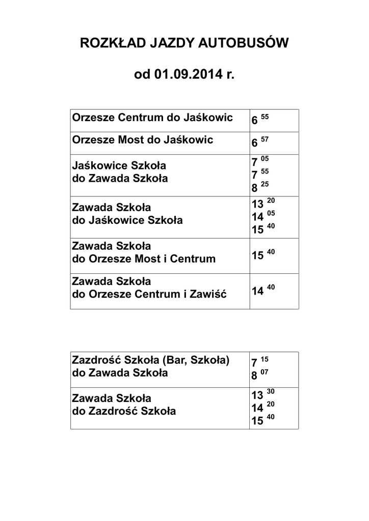 ROZKŁAD JAZDY AUTOBUSÓW od 01.09.2014 r. Orzesze Centrum do Jaśkowic 6 55 Orzesze Most do Jaśkowic 6 57 Jaśkowice Szkoła do Zawada Szkoła 7 05 7 55 8 25 13 20 14 05 15 40 Zawada Szkoła do Jaśkowice Szkoła Zawada Szkoła do Orzesze Most i Centrum 15 40 Zawada Szkoła do Orzesze Centrum i Zawiść 14 40 Zazdrość Szkoła (Bar, Szkoła) do Zawada Szkoła 7 15 8 07 Zawada Szkoła do Zazdrość Szkoła 13 30 14 20 15 40