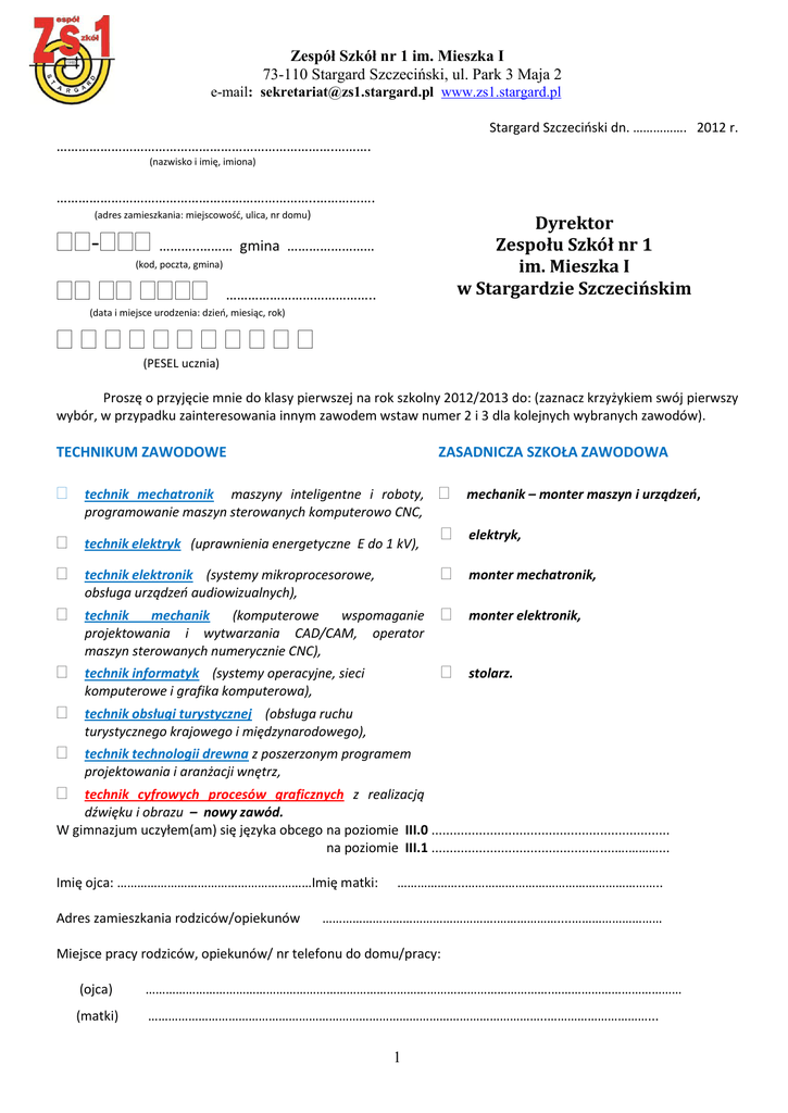 Zespół Szkół nr 1 im. Mieszka I 73-110 Stargard Szczeciński, ul. Park 3 Maja 2 e-mail: [email protected] www.zs1.stargard.pl Stargard Szczeciński dn. ……………. 2012 r. ………………………………………………………………….………. (nazwisko i imię, imiona) ……………………………………………………………..……………. (adres zamieszkania: miejscowość, ulica, nr domu) Dyrektor Zespołu Szkół nr 1 im. Mieszka I w Stargardzie Szczecińskim - ………..……… gmina …………………… (kod, poczta, gmina) ………………………………….. (data i miejsce urodzenia: dzień, miesiąc, rok) (PESEL ucznia) Proszę o przyjęcie mnie do klasy pierwszej na rok szkolny 2012/2013 do: (zaznacz krzyżykiem swój pierwszy wybór, w przypadku zainteresowania innym zawodem wstaw numer 2 i 3 dla kolejnych wybranych zawodów). TECHNIKUM ZAWODOWE ZASADNICZA SZKOŁA ZAWODOWA mechanik – monter maszyn i urządzeń, elektryk, monter mechatronik, monter elektronik, stolarz. technik mechatronik maszyny inteligentne i roboty, programowanie maszyn sterowanych komputerowo CNC, technik elektryk (uprawnienia energetyczne E do 1 kV), technik elektronik (systemy mikroprocesorowe, obsługa urządzeń audiowizualnych), technik mechanik (komputerowe wspomaganie projektowania i wytwarzania CAD/CAM, operator maszyn sterowanych numerycznie CNC), technik informatyk (systemy operacyjne, sieci komputerowe i grafika komputerowa), technik obsługi turystycznej (obsługa ruchu turystycznego krajowego i międzynarodowego), technik technologii drewna z poszerzonym programem projektowania i aranżacji wnętrz, technik cyfrowych procesów graficznych z realizacją dźwięku i obrazu – nowy zawód. W gimnazjum uczyłem(am) się języka obcego na poziomie III.0 ................................................................. na poziomie III.1 ..................................................….………... Imię ojca: ………………………………………….………Imię matki: Adres zamieszkania rodziców/opiekunów ………………..………………………………………………….. …………………………………………….………………....……………………… Miejsce pracy rodziców, opiekunów/ nr telefonu do domu/pracy: (ojca) ………………………………………………………………………………………………………….………………………………… (matki) ………………………………………………………………………………………………………..…………………………... 1 Zespół Szkół nr 1 im. Mieszka I 73-110 Stargard Szczeciński, ul. Park 3 Maja 2 e-mail: [email protected] www.zs1.stargard.pl Udział w olimpiadach, konkursach i zawodach: ………………………………………………………………………………………………………………………………………………………………………………… ………………………………………………………………………………………………………………………………………………………………………………… ………………………………………………………………………………………………………………………………………………………………………………… ……………………………………………………………………………………………………………………………………………………………………………….. Uwagi wychowawcy o uczniu i jego sytuacji rodzinnej i materialnej: ………………………………………………………………………………………………………………………………………………………………………………… ………………………………………………………………………………………………………………………………………………………………………………… ……………………………………………………………………………………………………………………………………………………………………………..…… ………………………………………………………………………………………………………………………………………………………………………………….. ………………………..………………… ……………………………….………… (pieczątka szkoły) (podpis wychowawcy) Wyrażam zgodę na uczęszczanie mojego syna/córki do Zespołu Szkół nr 1 w Stargardzie Szczecińskim. ……………………………………… (podpis rodzica) "Wyrażam zgodę na przetwarzanie moich danych osobowych zawartych w aplikacji dla potrzeb niezbędnych do realizacji procesu rekrutacji zgodnie z ustawą z dn. 29.08.1997r o ochronie danych osobowych (Dz.U. nr 133, poz. 883)." …………………………………… (podpis ucznia) Wymagane dokumenty: świadectwo ukończenia szkoły gimnazjalnej – kopia/oryginał; karta zdrowia, dwie fotografie o wymiarach 30x42 mm, podpisane; zaświadczenie o wynikach egzaminu gimnazjalnego – kopia/oryginał; zaświadczenie lekarskie (badania profilaktyczne) oceniające wskazania i przeciwwskazania do dalszego kształcenia i nauki zawodu dla ubiegających się o przyjęcie do klas zasadniczych i technikum ( skierowanie należy pobrać w sekretariacie szkoły – pok. Nr 2); kandydaci z wadami słuchu, wzroku, narządu ruchu itp. załączają orzeczenia kwalifikacyjne poradni pedagogicznej; finaliści, laureaci konkursów przedmiotowych stopnia wojewódzkiego załączają zaświadczenia komisji konkursowej; skrócony odpis aktu urodzenia 2