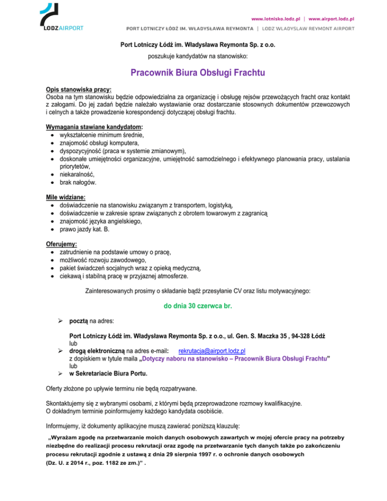 Port Lotniczy Łódź im. Władysława Reymonta Sp. z o.o. poszukuje kandydatów na stanowisko: Pracownik Biura Obsługi Frachtu Opis stanowiska pracy: Osoba na tym stanowisku będzie odpowiedzialna za organizację i obsługę rejsów przewoŜących fracht oraz kontakt z załogami. Do jej zadań będzie naleŜało wystawianie oraz dostarczanie stosownych dokumentów przewozowych i celnych a takŜe prowadzenie korespondencji dotyczącej obsługi frachtu. Wymagania stawiane kandydatom: • wykształcenie minimum średnie, • znajomość obsługi komputera, • dyspozycyjność (praca w systemie zmianowym), • doskonałe umiejętności organizacyjne, umiejętność samodzielnego i efektywnego planowania pracy, ustalania priorytetów, • niekaralność, • brak nałogów. Mile widziane: • doświadczenie na stanowisku związanym z transportem, logistyką, • doświadczenie w zakresie spraw związanych z obrotem towarowym z zagranicą • znajomość języka angielskiego, • prawo jazdy kat. B. Oferujemy: • zatrudnienie na podstawie umowy o pracę, • moŜliwość rozwoju zawodowego, • pakiet świadczeń socjalnych wraz z opieką medyczną, • ciekawą i stabilną pracę w przyjaznej atmosferze. Zainteresowanych prosimy o składanie bądź przesyłanie CV oraz listu motywacyjnego: do dnia 30 czerwca br. pocztą na adres: Port Lotniczy Łódź im. Władysława Reymonta Sp. z o.o., ul. Gen. S. Maczka 35 , 94-328 Łódź lub drogą elektroniczną na adres e-mail: [email protected] z dopiskiem w tytule maila „Dotyczy naboru na stanowisko – Pracownik Biura Obsługi Frachtu” lub w Sekretariacie Biura Portu. Oferty złoŜone po upływie terminu nie będą rozpatrywane. Skontaktujemy się z wybranymi osobami, z którymi będą przeprowadzone rozmowy kwalifikacyjne. O dokładnym terminie poinformujemy kaŜdego kandydata osobiście. Informujemy, iŜ dokumenty aplikacyjne muszą zawierać poniŜszą klauzulę: „Wyrażam zgodę na przetwarzanie moich danych osobowych zawartych w mojej ofercie pracy na potrzeby niezbędne do realizacji procesu rekrutacji oraz zgodę na przetwarzanie tych danych także po zakończeniu procesu rekrutacji zgodnie z ustawą z dnia 29 sierpnia 1997 r. o ochronie danych osobowych (Dz. U. z 2014 r., poz. 1182 ze zm.)” .