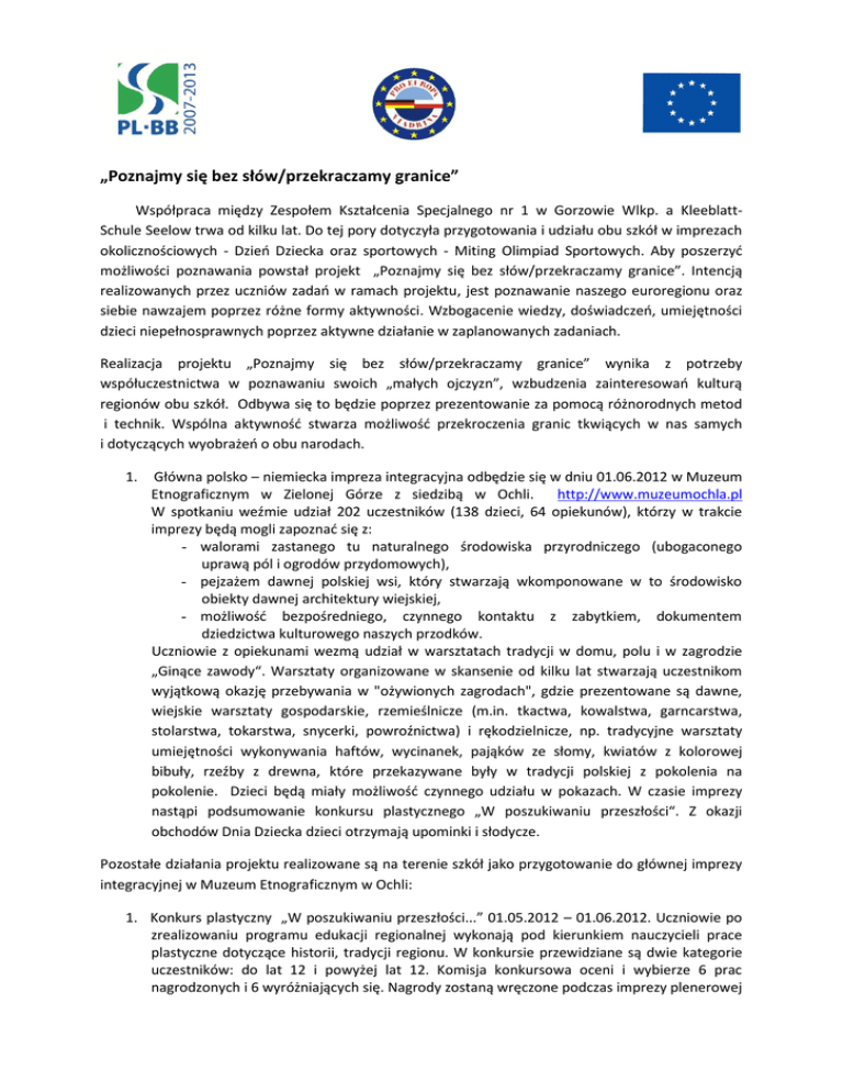 „Poznajmy się bez słów/przekraczamy granice” Współpraca między Zespołem Kształcenia Specjalnego nr 1 w Gorzowie Wlkp. a KleeblattSchule Seelow trwa od kilku lat. Do tej pory dotyczyła przygotowania i udziału obu szkół w imprezach okolicznościowych - Dzień Dziecka oraz sportowych - Miting Olimpiad Sportowych. Aby poszerzyć możliwości poznawania powstał projekt „Poznajmy się bez słów/przekraczamy granice”. Intencją realizowanych przez uczniów zadań w ramach projektu, jest poznawanie naszego euroregionu oraz siebie nawzajem poprzez różne formy aktywności. Wzbogacenie wiedzy, doświadczeń, umiejętności dzieci niepełnosprawnych poprzez aktywne działanie w zaplanowanych zadaniach. Realizacja projektu „Poznajmy się bez słów/przekraczamy granice” wynika z potrzeby współuczestnictwa w poznawaniu swoich „małych ojczyzn”, wzbudzenia zainteresowań kulturą regionów obu szkół. Odbywa się to będzie poprzez prezentowanie za pomocą różnorodnych metod i technik. Wspólna aktywność stwarza możliwość przekroczenia granic tkwiących w nas samych i dotyczących wyobrażeń o obu narodach. 1. Główna polsko – niemiecka impreza integracyjna odbędzie się w dniu 01.06.2012 w Muzeum Etnograficznym w Zielonej Górze z siedzibą w Ochli. http://www.muzeumochla.pl W spotkaniu weźmie udział 202 uczestników (138 dzieci, 64 opiekunów), którzy w trakcie imprezy będą mogli zapoznać się z: - walorami zastanego tu naturalnego środowiska przyrodniczego (ubogaconego uprawą pól i ogrodów przydomowych), - pejzażem dawnej polskiej wsi, który stwarzają wkomponowane w to środowisko obiekty dawnej architektury wiejskiej, - możliwość bezpośredniego, czynnego kontaktu z zabytkiem, dokumentem dziedzictwa kulturowego naszych przodków. Uczniowie z opiekunami wezmą udział w warsztatach tradycji w domu, polu i w zagrodzie „Ginące zawody“. Warsztaty organizowane w skansenie od kilku lat stwarzają uczestnikom wyjątkową okazję przebywania w "ożywionych zagrodach", gdzie prezentowane są dawne, wiejskie warsztaty gospodarskie, rzemieślnicze (m.in. tkactwa, kowalstwa, garncarstwa, stolarstwa, tokarstwa, snycerki, powroźnictwa) i rękodzielnicze, np. tradycyjne warsztaty umiejętności wykonywania haftów, wycinanek, pająków ze słomy, kwiatów z kolorowej bibuły, rzeźby z drewna, które przekazywane były w tradycji polskiej z pokolenia na pokolenie. Dzieci będą miały możliwość czynnego udziału w pokazach. W czasie imprezy nastąpi podsumowanie konkursu plastycznego „W poszukiwaniu przeszłości“. Z okazji obchodów Dnia Dziecka dzieci otrzymają upominki i słodycze. Pozostałe działania projektu realizowane są na terenie szkół jako przygotowanie do głównej imprezy integracyjnej w Muzeum Etnograficznym w Ochli: 1. Konkurs plastyczny „W poszukiwaniu przeszłości...” 01.05.2012 – 01.06.2012. Uczniowie po zrealizowaniu programu edukacji regionalnej wykonają pod kierunkiem nauczycieli prace plastyczne dotyczące historii, tradycji regionu. W konkursie przewidziane są dwie kategorie uczestników: do lat 12 i powyżej lat 12. Komisja konkursowa oceni i wybierze 6 prac nagrodzonych i 6 wyróżniających się. Nagrody zostaną wręczone podczas imprezy plenerowej w Ochli, gdzie będzie można także zobaczyć wystawę pokonkursową. Do jej organizacji zostaną wykorzystane, zakupione w ramach projektu sztalugi i tablice korkowe. 2. Program edukacji regionalnej, 01.05.2012 – 01.06.2012 Program zostanie opracowany w każdej szkole przez nauczycieli kolejnych etapów nauczania i dostosowany do możliwości uczniów. Będą go realizować wszyscy wychowankowie. Zostaną w nim ujęte treści, cele kształcenia i zakładane umiejętności jakie uczniowie będą posiadać po zakończeniu jego realizacji. 3. Warsztaty kulinarne dla dzieci „Dawne gotowanie - smaków poznawanie”, 14.05.2012 – 25.05.2012. Uczniowie podczas zajęć na terenie partnerskich szkół będą wspólnie z nauczycielami przygotowywać potrawy według przepisów Dziadków, tradycji regionalnych. Zapoznają się z dawnymi metodami wytwarzania żywności: upieką chleb, zrobią ser i masło. 4. Wystawa etnograficzna na terenie partnerskich szkół „Życie dawnej wsi. Zawody naszych dziadków”. 14.05.2012 – 25.05.2012. Pokaz eksponatów zostanie zorganizowany przy współpracy z rodzicami i przedstawicielami społeczności lokalnej, którzy odszukają na swoich posesjach dawne przedmioty dnia codziennego. Uczniowie pod kierunkiem nauczycieli przygotują prezentację, spróbują skatalogować zebrane rekwizyty i zorganizują uroczystość otwarcia wystawy. 5. Po zakończeniu projektu powstanie fotoalbum, które będą dokumentować działania szkół podjęte w ramach przedsięwzięcia. Umieszczone w nich zostaną informacje na temat podjętej współpracy polsko – niemieckiej. „Projekt współfinansowany jest ze środków Europejskiego Funduszu Rozwoju Regionalnego w ramach Programu Operacyjnego Współpracy Transgranicznej Polska (Województwo Lubuskie) – Brandenburgia 2007-2013, Fundusz Małych Projektów i Projekty Sieciowe Euroregionu „Pro Europa Viadrina” oraz budżetu państwa”. „Pokonywać granice poprzez wspólne inwestowanie w przyszłość” „Grenzen überwinden durch gemeinsame Investition in die Zukunft”