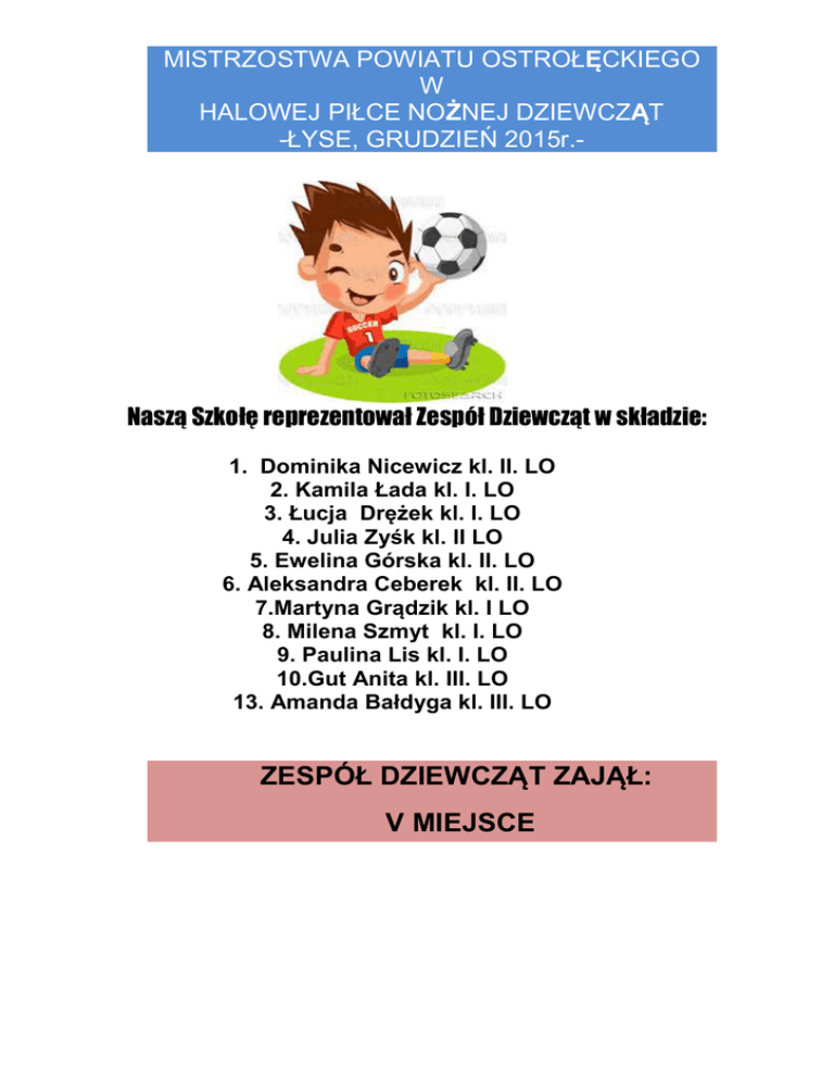 MISTRZOSTWA POWIATU OSTROŁĘCKIEGO W HALOWEJ PIŁCE NOŻNEJ DZIEWCZĄT -ŁYSE, GRUDZIEŃ 2015r.- Naszą Szkołę reprezentował Zespół Dziewcząt w składzie: 1. Dominika Nicewicz kl. II. LO 2. Kamila Łada kl. I. LO 3. Łucja Drężek kl. I. LO 4. Julia Zyśk kl. II LO 5. Ewelina Górska kl. II. LO 6. Aleksandra Ceberek kl. II. LO 7.Martyna Grądzik kl. I LO 8. Milena Szmyt kl. I. LO 9. Paulina Lis kl. I. LO 10.Gut Anita kl. III. LO 13. Amanda Bałdyga kl. III. LO ZESPÓŁ DZIEWCZĄT ZAJĄŁ: V MIEJSCE
