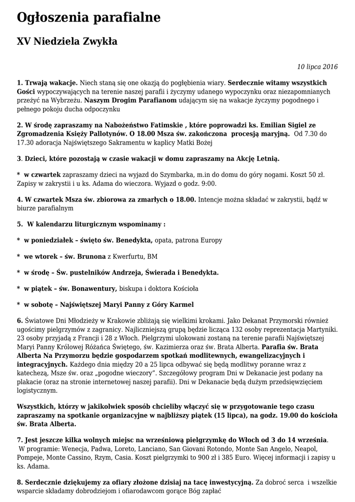 Ogłoszenia parafialne XV Niedziela Zwykła 10 lipca 2016 1. Trwają wakacje. Niech staną się one okazją do pogłębienia wiary. Serdecznie witamy wszystkich Gości wypoczywających na terenie naszej parafii i życzymy udanego wypoczynku oraz niezapomnianych przeżyć na Wybrzeżu. Naszym Drogim Parafianom udającym się na wakacje życzymy pogodnego i pełnego pokoju ducha odpoczynku 2. W środę zapraszamy na Nabożeństwo Fatimskie , które poprowadzi ks. Emilian Sigiel ze Zgromadzenia Księży Pallotynów. O 18.00 Msza św. zakończona procesją maryjną. Od 7.30 do 17.30 adoracja Najświętszego Sakramentu w kaplicy Matki Bożej 3. Dzieci, które pozostają w czasie wakacji w domu zapraszamy na Akcję Letnią. * w czwartek zapraszamy dzieci na wyjazd do Szymbarka, m.in do domu do góry nogami. Koszt 50 zł. Zapisy w zakrystii i u ks. Adama do wieczora. Wyjazd o godz. 9:00. 4. W czwartek Msza św. zbiorowa za zmarłych o 18.00. Intencje można składać w zakrystii, bądź w biurze parafialnym 5. W kalendarzu liturgicznym wspominamy : * w poniedziałek – święto św. Benedykta, opata, patrona Europy * we wtorek – św. Brunona z Kwerfurtu, BM * w środę – Św. pustelników Andrzeja, Świerada i Benedykta. * w piątek – św. Bonawentury, biskupa i doktora Kościoła * w sobotę – Najświętszej Maryi Panny z Góry Karmel 6. Światowe Dni Młodzieży w Krakowie zbliżają się wielkimi krokami. Jako Dekanat Przymorski również ugościmy pielgrzymów z zagranicy. Najliczniejszą grupą będzie licząca 132 osoby reprezentacja Martyniki. 23 osoby przyjadą z Francji i 28 z Włoch. Pielgrzymi ulokowani zostaną na terenie parafii Najświętszej Maryi Panny Królowej Różańca Świętego, św. Kazimierza oraz św. Brata Alberta. Parafia św. Brata Alberta Na Przymorzu będzie gospodarzem spotkań modlitewnych, ewangelizacyjnych i integracyjnych. Każdego dnia między 20 a 25 lipca odbywać się będą modlitwy poranne wraz z katechezą, Msze św. oraz „pogodne wieczory”. Szczegółowy program Dni w Dekanacie jest podany na plakacie (oraz na stronie internetowej naszej parafii). Dni w Dekanacie będą dużym przedsięwzięciem logistycznym. Wszystkich, którzy w jakikolwiek sposób chcieliby włączyć się w przygotowanie tego czasu zapraszamy na spotkanie organizacyjne w najbliższy piątek (15 lipca), na godz. 19.00 do kościoła św. Brata Alberta. 7. Jest jeszcze kilka wolnych miejsc na wrześniową pielgrzymkę do Włoch od 3 do 14 września. W programie: Wenecja, Padwa, Loreto, Lanciano, San Giovani Rotondo, Monte San Angelo, Neapol, Pompeje, Monte Cassino, Rzym, Casia. Koszt pielgrzymki to 900 zł i 385 Euro. Więcej informacji i zapisy u ks. Adama. 8. Serdecznie dziękujemy za ofiary złożone dzisiaj na tacę inwestycyjną. Za dobroć serca i wszelkie wsparcie składamy dobrodziejom i ofiarodawcom gorące Bóg zapłać 9. Po Mszy św. do nabycia prasa katolicka 10. Naszych zmarłych, Ks. Jerzego, budowniczych i dobrodziejów naszego kościoła polećmy teraz Bożemu miłosierdziu: wieczny odpoczynek racz im dać Panie.