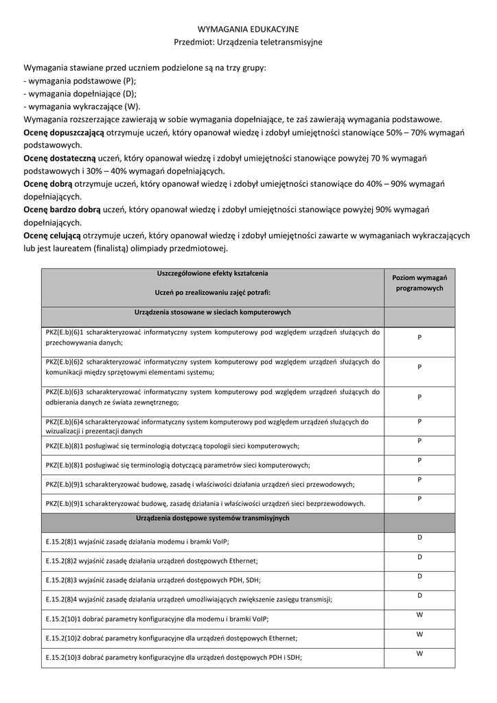 WYMAGANIA EDUKACYJNE Przedmiot: Urządzenia teletransmisyjne Wymagania stawiane przed uczniem podzielone są na trzy grupy: - wymagania podstawowe (P); - wymagania dopełniające (D); - wymagania wykraczające (W). Wymagania rozszerzające zawierają w sobie wymagania dopełniające, te zaś zawierają wymagania podstawowe. Ocenę dopuszczającą otrzymuje uczeń, który opanował wiedzę i zdobył umiejętności stanowiące 50% – 70% wymagań podstawowych. Ocenę dostateczną uczeń, który opanował wiedzę i zdobył umiejętności stanowiące powyżej 70 % wymagań podstawowych i 30% – 40% wymagań dopełniających. Ocenę dobrą otrzymuje uczeń, który opanował wiedzę i zdobył umiejętności stanowiące do 40% – 90% wymagań dopełniających. Ocenę bardzo dobrą uczeń, który opanował wiedzę i zdobył umiejętności stanowiące powyżej 90% wymagań dopełniających. Ocenę celującą otrzymuje uczeń, który opanował wiedzę i zdobył umiejętności zawarte w wymaganiach wykraczających lub jest laureatem (finalistą) olimpiady przedmiotowej. Uszczegółowione efekty kształcenia Uczeń po zrealizowaniu zajęć potrafi: Poziom wymagań programowych Urządzenia stosowane w sieciach komputerowych PKZ(E.b)(6)1 scharakteryzować informatyczny system komputerowy pod względem urządzeń służących do przechowywania danych; P PKZ(E.b)(6)2 scharakteryzować informatyczny system komputerowy pod względem urządzeń służących do komunikacji między sprzętowymi elementami systemu; P PKZ(E.b)(6)3 scharakteryzować informatyczny system komputerowy pod względem urządzeń służących do odbierania danych ze świata zewnętrznego; P PKZ(E.b)(6)4 scharakteryzować informatyczny system komputerowy pod względem urządzeń służących do wizualizacji i prezentacji danych PKZ(E.b)(8)1 posługiwać się terminologią dotyczącą topologii sieci komputerowych; PKZ(E.b)(8)1 posługiwać się terminologią dotyczącą parametrów sieci komputerowych; PKZ(E.b)(9)1 scharakteryzować budowę, zasadę i właściwości działania urządzeń sieci przewodowych; PKZ(E.b)(9)1 scharakteryzować budowę, zasadę działania i właściwości urządzeń sieci bezprzewodowych. P P P P P Urządzenia dostępowe systemów transmisyjnych E.15.2(8)1 wyjaśnić zasadę działania modemu i bramki VoIP; E.15.2(8)2 wyjaśnić zasadę działania urządzeń dostępowych Ethernet; E.15.2(8)3 wyjaśnić zasadę działania urządzeń dostępowych PDH, SDH; E.15.2(8)4 wyjaśnić zasadę działania urządzeń umożliwiających zwiększenie zasięgu transmisji; E.15.2(10)1 dobrać parametry konfiguracyjne dla modemu i bramki VoIP; E.15.2(10)2 dobrać parametry konfiguracyjne dla urządzeń dostępowych Ethernet; E.15.2(10)3 dobrać parametry konfiguracyjne dla urządzeń dostępowych PDH i SDH; D D D D W W W E.15.2(10)1 posługiwać się terminologią dotyczącą instalacji, uruchamiania oraz utrzymania modemów i bramek VoIP; E.15.2(10)2 posługiwać się terminologią dotyczącą instalacji, uruchamiania oraz utrzymania urządzeń dostępowych Ethernet; E.15.2(10)3 posługiwać się terminologią dotyczącą instalacji, uruchamiania oraz utrzymania urządzeń dostępowych PDH i SDH; E.15.2(13)1 odczytywać schematy blokowe i montażowe modemów i bramek VoIP; E.15.2(13)2 odczytywać schematy blokowe i montażowe urządzeń dostępowych Ethernet; E.15.2(13)3 odczytywać schematy blokowe i montażowe urządzeń dostępowych PDH i SDH; E.15.2(14)1 posługiwać się instrukcjami, zaleceniami i dokumentacją techniczną modemów i bramek VoIP; P P P D D W D E.15.2(14)2 posługiwać się instrukcjami, zaleceniami i dokumentacją techniczną urządzeń dostępowych Ethernet; E.15.2(14)2 posługiwać się instrukcjami, zaleceniami i dokumentacją techniczną urządzeń dostępowych PDH i SDH. Urządzenia abonenckie sieci komutacyjnych W E.15.3(2)1 rozpoznać elementy aparatu telefonicznego i telefaksu na podstawie charakterystyk, symboli graficznych, oznaczeń; P E.15.3(2)2 rozpoznać elementy centrali na podstawie charakterystyk, symboli graficznych, oznaczeń; E.15.3(7)1 odczytać schematy blokowe i montażowe, instrukcje, zalecenia, dokumentację techniczną, dotyczące aparatów telefonicznych i telefaksów; E.15.3(7)2 odczytać schematy blokowe i montażowe, instrukcje, zalecenia, dokumentację techniczną, dotyczące central; E.15.3(9)1 zidentyfikować parametry aparatów telefonicznych i telefaksów; E.15.3(9)2 zidentyfikować parametry central abonenckich; E.15.3(3)1 dobrać parametry konfiguracyjne aparatów telefonicznych i telefaksów; E.15.3(3)2 dobrać parametry konfiguracyjne central abonenckich; E.15.3(16) skonfigurować i utrzymać modemy i terminale cyfrowych sieci komutacyjnych. W P W W D D D D W Pomiary urządzeń teletransmisyjnych E.15.2(17)1 wykonać pomiary i testy routerów Ethernet; E.15.2(17)2 wykonać pomiary i testy krotnic PDH i SDH; E.15.2(17)3 wykonać pomiary i testy regeneratorów i wzmacniaczy; E.15.2(18)1 ocenić jakość działania routerów Ethernet na podstawie wyników testów i pomiarów; E.15.2(18)2 ocenić jakość działania krotnic PDH i SDH na podstawie wyników testów i pomiarów; E.15.2(18)2 ocenić jakość działania regeneratorów i wzmacniaczy na podstawie wyników testów i pomiarów; E.15.3(12)1 wykonać pomiary uruchomieniowe oraz testy okresowe cyfrowych centralek abonenckich; E.15.3(12)2 wykonać pomiary uruchomieniowe oraz testy okresowe modemów cyfrowych; E.15.3(13)1 oceniać jakość działania cyfrowych centralek abonenckich na podstawie wyników testów E.15.3(13)2 oceniać jakość działania modemów cyfrowych na podstawie wyników testów; E.15.3(17)1 zlokalizować i usunąć uszkodzenia w miedzianych liniach abonenckich na podstawie pomiarów i wyników testów; E.15.3(17)2 zlokalizować i usunąć uszkodzenia w światłowodowych liniach abonenckich na podstawie pomiarów i wyników testów; W W W W W W W W W W W W E.15.3(17)3 zlokalizować i usunąć