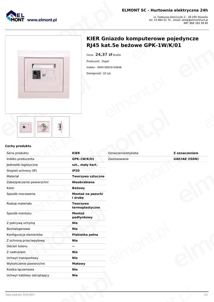 ELMONT SC - Hurtownia elektryczna 24h ul. Tadeusza Kościuszki 2 , 28-200 Staszów tel: 15 864 51 75 , email: [email protected] NIP: 866 165 58 60 KIER Gniazdo komputerowe pojedyncze RJ45 kat.5e beżowe GPK-1W/K/01 Cena: 24,37 zł brutto Producent: Ospel Indeks: 0004-00010-03648 Dostępność: 10 szt. Cechy produktu Seria produktu KIER Oznaczenie/etykieta Z oznaczeniem Indeks producenta GPK-1W/K/01 Zastosowanie UAE/IAE (ISDN) Jednostki logistyczne szt., mały kart. Stopień ochrony (IP) IP20 Materiał Tworzywo sztuczne Zabezpieczenie powierzchni Nieobrabiana Kolor Beżowy Sposób mocowania Montaż na pazurki i śrubę Rodzaj materiału Tworzywo termoplastyczne Sposób montażu Montaż podtynkowy Z pokrywą uchylną Nie Bezhalogenowe Nie Konfiguracja elementów Plakietka pełna Z ochroną przeciwpyłową Nie Odcień koloru -- Z nadrukiem Nie Uchwyt transportowy Nie Wykończenie powierzchni Matowy Kostka łączeniowa Nie Uchwyt kablowy odciążający Nie Data wydruku: 8-03-2017 1/1