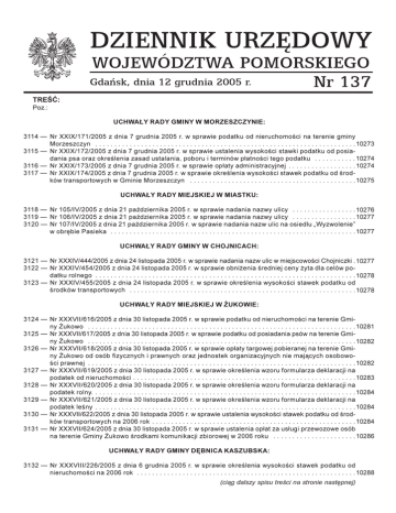 DZIENNIK URZÊDOWY WOJEWÓDZTWA POMORSKIEGO Gdañsk, dnia 12 grudnia 2005 r. Nr 137 TREŒÆ: Poz.: UCHWA£Y RADY GMINY W MORZESZCZYNIE: 3114 — Nr XXIX/171/2005 z dnia 7 grudnia 2005 r. w sprawie podatku od nieruchomoœci na terenie gminy Morzeszczyn . . . . . . . . . . . . . . . . . . . . . . . . . . . . . . . . . . . . . . . . . . . . . . . . . . . . . . . . . . . . . . . . . . . . . 10273 3115 — Nr XXIX/172/2005 z dnia 7 grudnia 2005 r. w sprawie ustalenia wysokoœci stawki podatku od posiadania psa oraz okreœlenia zasad ustalania, poboru i terminów p³atnoœci tego podatku . . . . . . . . . . . 10274 3116 — Nr XXIX/173/2005 z dnia 7 grudnia 2005 r. w sprawie op³aty administracyjnej . . . . . . . . . . . . . . . . . . 10274 3117 — Nr XXIX/174/2005 z dnia 7 grudnia 2005 r. w sprawie okreœlenia wysokoœci stawek podatku od œrodków transportowych w Gminie Morzeszczyn . . . . . . . . . . . . . . . . . . . . . . . . . . . . . . . . . . . . . . . . . . . . 10275 UCHWA£Y RADY MIEJSKIEJ W MIASTKU: 3118 — Nr 105/IV/2005 z dnia 21 paŸdziernika 2005 r. w sprawie nadania nazwy ulicy . . . . . . . . . . . . . . . . . 10276 3119 — Nr 106/IV/2005 z dnia 21 paŸdziernika 2005 r. w sprawie nadania nazwy ulicy . . . . . . . . . . . . . . . . . 10277 3120 — Nr 107/IV/2005 z dnia 21 paŸdziernika 2005 r. w sprawie nadania nazw ulic na osiedlu „Wyzwolenie” w obrêbie Pasieka . . . . . . . . . . . . . . . . . . . . . . . . . . . . . . . . . . . . . . . . . . . . . . . . . . . . . . . . . . . . . . . . . 10277 UCHWA£Y RADY GMINY W CHOJNICACH: 3121 — Nr XXXIV/444/2005 z dnia 24 listopada 2005 r. w sprawie nadania nazw ulic w miejscowoœci Chojniczki . 10277 3122 — Nr XXXIV/454/2005 z dnia 24 listopada 2005 r. w sprawie obni¿enia œredniej ceny ¿yta dla celów podatku rolnego . . . . . . . . . . . . . . . . . . . . . . . . . . . . . . . . . . . . . . . . . . . . . . . . . . . . . . . . . . . . . . . . . . . . . 10278 3123 — Nr XXXIV/455/2005 z dnia 24 listopada 2005 r. w sprawie okreœlenia wysokoœci stawek podatku od œrodków transportowych . . . . . . . . . . . . . . . . . . . . . . . . . . . . . . . . . . . . . . . . . . . . . . . . . . . . . . . . . . . . 10278 UCHWA£Y RADY MIEJSKIEJ W ¯UKOWIE: 3124 — Nr XXXVII/616/2005 z dnia 30 listopada 2005 r. w sprawie podatku od nieruchomoœci na terenie Gminy ¯ukowo . . . . . . . . . . . . . . . . . . . . . . . . . . . . . . . . . . . . . . . . . . . . . . . . . . . . . . . . . . . . . . . . . . . . . . . 10281 3125 — Nr XXXVII/617/2005 z dnia 30 listopada 2005 r. w sprawie podatku od posiadania psów na terenie Gminy ¯ukowo . . . . . . . . . . . . . . . . . . . . . . . . . . . . . . . . . . . . . . . . . . . . . . . . . . . . . . . . . . . . . . . . . . . . . . . 10282 3126 — Nr XXXVII/618/2005 z dnia 30 listopada 2005 r. w sprawie op³aty targowej pobieranej na terenie Gminy ¯ukowo od osób fizycznych i prawnych oraz jednostek organizacyjnych nie maj¹cych osobowoœci prawnej . . . . . . . . . . . . . . . . . . . . . . . . . . . . . . . . . . . . . . . . . . . . . . . . . . . . . . . . . . . . . . . . . . . . . . . 10282 3127 — Nr XXXVII/619/2005 z dnia 30 listopada 2005 r. w sprawie okreœlenia wzoru formularza deklaracji na podatek od nieruchomoœci . . . . . . . . . . . . . . . . . . . . . . . . . . . . . . . . . . . . . . . . . . . . . . . . . . . . . . . . . . . 10283 3128 — Nr XXXVII/620/2005 z dnia 30 listopada 2005 r. w sprawie okreœlenia wzoru formularza deklaracji na podatek rolny. . . . . . . . . . . . . . . . . . . . . . . . . . . . . . . . . . . . . . . . . . . . . . . . . . . . . . . . . . . . . . . . . . . . . . 10284 3129 — Nr XXXVII/621/2005 z dnia 30 listopada 2005 r. w sprawie okreœlenia wzoru formularza deklaracji na podatek leœny . . . . . . . . . . . . . . . . . . . . . . . . . . . . . . . . . . . . . . . . . . . . . . . . . . . . . . . . . . . . . . . . . . . . . 10284 3130 — Nr XXXVII/622/2005 z dnia 30 listopada 2005 r. w sprawie ustalenia wysokoœci stawek podatku od œrodków transportowych na 2006 rok . . . . . . . . . . . . . . . . . . . . . . . . . . . . . . . . . . . . . . . . . . . . . . . . . . . . . . 10284 3131 — Nr XXXVII/624/2005 z dnia 30 listopada 2005 r. w sprawie ustalenia op³at za us³ugi przewozowe osób na terenie Gminy ¯ukowo œrodkami komunikacji zbiorowej w 2006 roku . . . . . . . . . . . . . . . . . . . . . . 10286 UCHWA£Y RADY GMINY DÊBNICA KASZUBSKA: 3132 — Nr XXXVIII/226/2005 z dnia 6 grudnia 2005 r. w sprawie okreœlenia wysokoœci stawek podatku od nieruchomoœci na 2006 rok . . . . . . . . . . . . . . . . . . . . . . . . . . . . . . . . . . . . . . . . . . . . . . . . . . . . . . . . . . 10288 (ci¹g dalszy spisu treœci na stronie nastêpnej) Dziennik Urzêdowy Województwa Pomorskiego Nr 137 — 10272 — 3133 — Nr XXXVIII/228/2005 z dnia 6 grudnia 2005 r. w sprawie okreœlenia wysokoœci stawek op³aty miejscowej na 2006 rok . . . . . . . . . . . . . . . . . . . . . . . . . . . . . . . . . . . . . . . . . . . . . . . . . . . . . . . . . . . . . . . . . . .10288 3134 — Nr XXXVIII/229/2005 z dnia 6 grudnia 2005 r. w sprawie okreœlenia wysokoœci stawek podatku od œrodków transportowych na 2006 rok . . . . . . . . . . . . . . . . . . . . . . . . . . . . . . . . . . . . . . . . . . . . . . . . . .10289 3135 — Nr XXXVIII/230/2005 z dnia 6 grudnia 2005 r. w sprawie podatku od posiadania psów na 2006 rok . 10290 3136 — Nr XXXVIII/231/2005 z dnia 6 grudnia 2005 r. w sprawie okreœlenia wzorów formularzy na podatek od nieruchomoœci, rolny, leœny . . . . . . . . . . . . . . . . . . . . . . . . . . . . . . . . . . . . . . . . . . . . . . . . . . . . . . . . . .10290 UCHWA£Y RADY MIASTA PRUSZCZ GDAÑSKI: 3137 — Nr XXXVIII/381/2005 z dnia 7 grudnia 2005 r. w sprawie ustalenia wysokoœci stawek podatku od nieruchomoœci, podatku od posiadania psów i op³aty administracyjnej oraz uregulowania niektórych innych spraw zwi¹zanych z ich pob