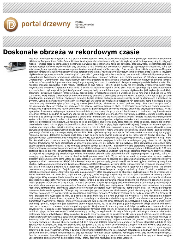 Doskonałe obrzeża w rekordowym czasie Idea maksymalnego wykorzystania czasu pracy w nowoczesnym zakładzie stolarskim przyświecała w pierwszym rzędzie konstruktorom okleiniarek Tempora firmy Felder Group. Uznano, że oklejanie obrzeżami może odbywać się szybciej, prościej i wydajniej. Aby to osiągnąć, modele Tempora łączą w kompaktowej konstrukcji najważniejsze oczekiwania, takie jak szybkość, produktywność, wszechstronność oraz komfort obsługi. Końcowe wyniki obróbki przy obrzeżach z rolki i doklejkach drewnianych przekonują najwyższymi standardami, które pod każdym względem spełniają rosnące wymagania stawiane kompleksowej obróbce obrzeży. Dwa modele i trzy pakiety wyposażenia Masywne agregaty obróbcze oraz zoptymalizowany korpus obrabiarki gwarantują, również przy najszybszym tempie obróbki, dużą stabilność. Przyjazne użytkownikowi opcje wyposażenia „x-motion plus” i „e-motion” gwarantują natomiast absolutną powtarzalność dokładności i pozwalają wraz z indywidualnie tworzonymi programami roboczymi błyskawicznie zmieniać materiał i przezbrajać maszynę. Z pakietami wyposażenia „Professional” i „Performance” oraz indywidualnym doborem agregatów do zainstalowania w wolnych miejscach maszyny okleiniarka Tempora może zostać optymalnie dopasowana do specyficznych wymogów produkcji. – Okleiniarki Tempora zastępują modele Perfect – mówi Piotr Kozielski, manager produktów Felder Polska. – Dostępne są dwa modele – 60.12 i 60.08. Każdy ma trzy pakiety wyposażenia. Klient może indywidualnie dopasować agregaty w maszynie. Z analiz naszej fabryki wynika, że 90 proc. maszyn sprzedaje się z bardzo podobnym wyposażeniem, czyli najprościej jest konfigurować maszynę jakby predefiniowaną pod danego użytkownika. Jeśli wykonuje on doklejki drewniane, potrzebuje maszyny Tempora 60.12, zapewniającej wykorzystanie doklejki o wysokości do 60 mm oraz o grubości do 12 mm. Użytkownik, który będzie chciał obrabiać delikatne elementy akrylowe z prędkością 20 m/min wybierze pakiet, który będzie już posiadał spryskiwacze, ułatwiające poślizg i czyszczące formatkę, będzie posiadał podwójne zarabianie naroży nawet na elementach o szerokości do 140 mm. Cenna dla użytkownika tych maszyn jest możliwość włączania czy wyłączania poszczególnych agregatów, które nie kolidują z ciągłą pracą maszyny. Nie trzeba wyłączyć maszyny, by zmienić jakąś funkcję, tylko można to zrobić podczas pracy. Użytkownik ma pracować, a nie kontrolować Dwie przeciwbieżnie obracające się głowice, wstępnie frezujące płytę, ze sterowanym rozruchem i osobno ustawiane, wyposażone w spiralnie ułożone noże diamentowe zapewniają pierwszorzędnie obrobioną krawędź płyty przed przyklejeniem obrzeża. Wraz z agregatem frezowania wstępnego zapewnia to absolutnie czyste krawędzie przy płytach laminowanych. Naddatek przy formatowaniu wstępnym sfrezuje dokładnie do wymiaru końcowego agregat frezowania wstępnego. Przy wszystkich modelach e-motion grubość zbioru wybiera się za pomocą sterowania pozycyjnego, a ustawianie – motorycznie. We wszystkich maszynach Tempora jest także szybkowymienny system zbiornika z klejem i z rolką, która nanosi klej. Innowacyjnym rozwiązaniem w tych okleiniarkach jest na nowo opracowana powłoka, którą jest powleczona rolka klejowa. Ze względu na to, że producenci płyt oferują płyty coraz rzadsze i przez to lżejsze, objawia się trudność przeniesienia kleju z rolki na płytę. Drobne wiórki z płyty zamiast lepić się do płyty, lepią się do rolki klejowej. Dlatego zastosowano specjalną powłokę otaczającą rolkę, dzięki której klej łatwo schodzi z rolki i w 100 proc. przenosi się na płytę. Szybkowymienne zbiorniki klejowe pozwalają bez użycia narzędzi zwolnić blokadę zabezpieczającą i cały zbiornik można wyciągnąć w ciągu kilku sekund. Prosta i szybka wymiana gwarantuje również przy zmianie pomiędzy klejami EVA i PUR najkrótsze cykle przezbrajania. Teflonowy wałek nanoszący klej z precyzyjną regulacją pozwala dokładnie dozować ilość kleju i tym samym perfekcyjnie dopasować ją do różnorodnych typów obrzeży. – Dla zaawansowanych użytkowników, gdy realizowany jest bardzo duży przerób, oferowany jest wstępny topielnik kleju o pojemności 3,5 kg – mówi Piotr Kozielski. – Jest to system zamknięty. Powoduje on, że klej szczelnie przepływa do zbiornika zamkniętego z góry, z boku i z dołu. Są tylko czujniki. Użytkownik nie musi kontrolować w otwartym zbiorniku, czy klej wpłynął czy nie wpłynął. Takie rozwiązanie gwarantuje pełne bezpieczeństwo procesu oklejania, a nie wymusza potrzeby kontroli parametrów. Elektromotoryczne sterowanie Maszyny ze sterowaniem elektromotorycznym zapewniają użytkownikowi, dzięki elektromotorycznemu sterowaniu wszystkich agregatów z dokładnością do 0,01 mm, perfekcję operacji, precyzję, powtarzalność, oszczędność czasu i nie wymagają wysokich kwalifikacji operatora maszyny. W praktyce oznacza to, że jeżeli wykorzystuje się określony typ okleiny, to operator ustawia sobie odpowiedni profil i zapisuje program na panelu, który jest intuicyjny, gdyż komunikuje się na zasadzie obrazków i piktogramów, a nie tekstu. Wykorzystując ponownie tę samą okleinę, wystarczy wybrać określony program i maszyna sama ustawi agregaty obróbcze. Uruchamia się na przykład agregat zarabiania naroży, który jest dwusilnikowym agregatem, dzięki czemu można oklejać dolną krawędź na prosto, podczas gdy górna krawędź będzie zaokrąglana. Możliwe są specyficzne obróbki. Cyklina profilowa jest również dwuosiowo sterowana elektromotorycznie, a cyklina płaska jest włączana lub wyłączana pneumatycznie. Taki układ w maszynie pozwala na oszczędność czasu, który jest potrzebny przy maszynach ręcznych na przezbrajanie i