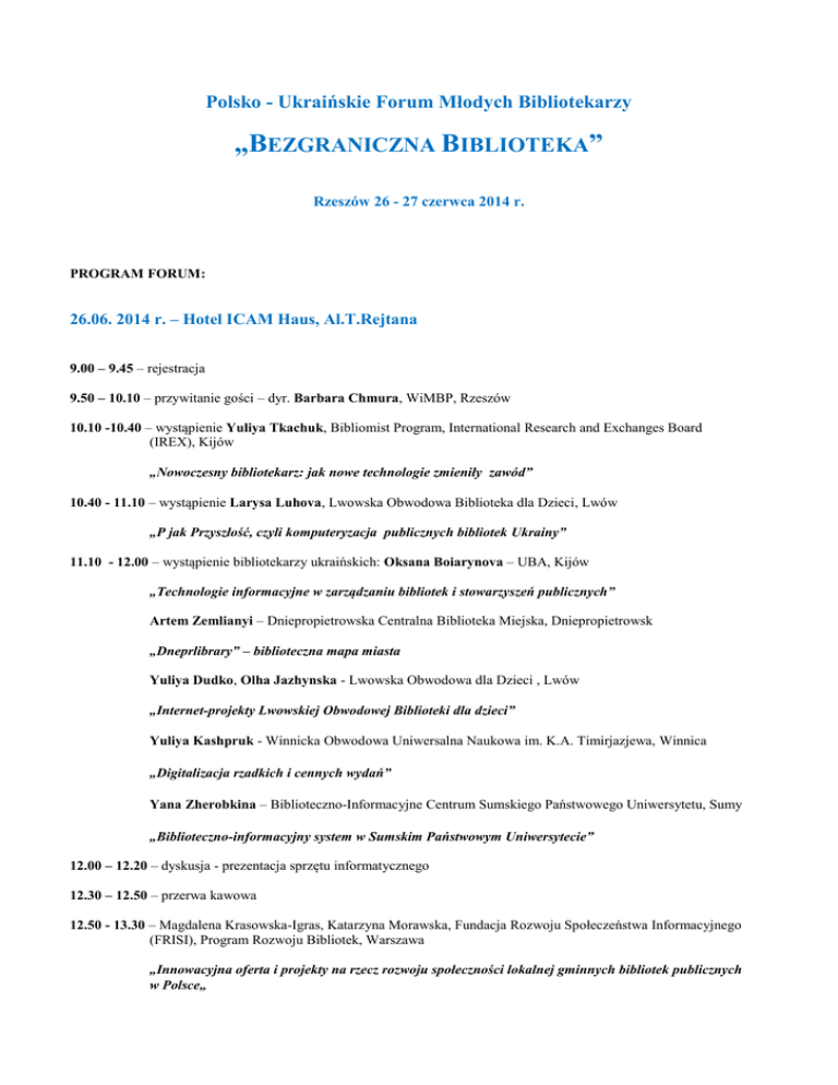 Polsko - Ukraińskie Forum Młodych Bibliotekarzy „BEZGRANICZNA BIBLIOTEKA” Rzeszów 26 - 27 czerwca 2014 r. PROGRAM FORUM: 26.06. 2014 r. – Hotel ICAM Haus, Al.T.Rejtana 9.00 – 9.45 – rejestracja 9.50 – 10.10 – przywitanie gości – dyr. Barbara Chmura, WiMBP, Rzeszów 10.10 -10.40 – wystąpienie Yuliya Tkachuk, Bibliomist Program, International Research and Exchanges Board (IREX), Kijów „Nowoczesny bibliotekarz: jak nowe technologie zmieniły zawód” 10.40 - 11.10 – wystąpienie Larysa Luhova, Lwowska Obwodowa Biblioteka dla Dzieci, Lwów „P jak Przyszłość, czyli komputeryzacja publicznych bibliotek Ukrainy” 11.10 - 12.00 – wystąpienie bibliotekarzy ukraińskich: Oksana Boiarynova – UBA, Kijów „Technologie informacyjne w zarządzaniu bibliotek i stowarzyszeń publicznych” Artem Zemlianyi – Dniepropietrowska Centralna Biblioteka Miejska, Dniepropietrowsk „Dneprlibrary” – biblioteczna mapa miasta Yuliya Dudko, Olha Jazhynska - Lwowska Obwodowa dla Dzieci , Lwów „Internet-projekty Lwowskiej Obwodowej Biblioteki dla dzieci” Yuliya Kashpruk - Winnicka Obwodowa Uniwersalna Naukowa im. K.A. Timirjazjewa, Winnica „Digitalizacja rzadkich i cennych wydań” Yana Zherobkina – Biblioteczno-Informacyjne Centrum Sumskiego Państwowego Uniwersytetu, Sumy „Biblioteczno-informacyjny system w Sumskim Państwowym Uniwersytecie” 12.00 – 12.20 – dyskusja - prezentacja sprzętu informatycznego 12.30 – 12.50 – przerwa kawowa 12.50 - 13.30 – Magdalena Krasowska-Igras, Katarzyna Morawska, Fundacja Rozwoju Społeczeństwa Informacyjnego (FRISI), Program Rozwoju Bibliotek, Warszawa „Innowacyjna oferta i projekty na rzecz rozwoju społeczności lokalnej gminnych bibliotek publicznych w Polsce„ 13.30 – 14.00 – wystąpienie dyr. Teresa Leśniak, KBP, Krosno „Współpraca Krośnieńskiej Biblioteki Publicznej z bibliotekami Euroregionu Karpaty” 14.00 – 14.30 – wystąpienie Bożena Janda, WiMBP, Rzeszów „Nowoczesne usługi online dla społeczności miasta i regionu w Wojewódzkiej i Miejskiej Bibliotece Publicznej w Rzeszowie.” 14.30 – 15.00 – podsumowanie dyr. Barbara Chmura - dyskusja 15.00 – 16.00 – obiad 16.40 – 16.50 – Rynek: Flash mob - czytanie polskiej i ukraińskiej poezji 17.10 – 18.00 - WiMBP, Rzeszów: Otwarcie wystawy literatury polskiej i ukraińskiej „Literatura ponad granicami” 27.06.2014 - Warsztaty dla bibliotekarzy ukraińskich 10.00 – 12.00 – Pracownia Digitalizacji ul. Dąbrowskiego 58a 12.15 – 12.50 – Wypożyczalnia Główna ul. Dąbrowskiego 33a 13.10 – 13.40 – Oddział dla Dzieci ul. Słowackiego 11 14.00 – 14.30 – Wypożyczalnia Muzyczna ul. Żeromskiego 2 15.00 – 16.00 - Obiad