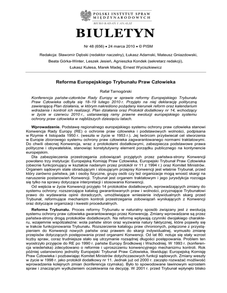 BIURO BADAŃ I ANALIZ BIULETYN Nr 48 (656) 24 marca 2010 © PISM Redakcja: Sławomir Dębski (redaktor naczelny), Łukasz Adamski, Mateusz Gniazdowski, Beata Górka-Winter, Leszek Jesień, Agnieszka Kondek (sekretarz redakcji), Łukasz Kulesa, Marek Madej, Ernest Wyciszkiewicz Reforma Europejskiego Trybunału Praw Człowieka Rafał Tarnogórski Konferencja państw-członków Rady Europy w sprawie reformy Europejskiego Trybunału Praw Człowieka odbyła się 18–19 lutego 2010 r. Przyjęto na niej deklarację polityczną zawierającą Plan działania, w którym nakreślono pożądany kierunek reform oraz kalendarium wdrażania i kontroli ich realizacji. Plan działania oraz Protokół dodatkowy nr 14, wchodzący w życie w czerwcu 2010 r., ustanawiają ramy prawne ewolucji europejskiego systemu ochrony praw człowieka w najbliższych dziesięciu latach. Wprowadzenie. Podstawę regionalnego europejskiego systemu ochrony praw człowieka stanowi Konwencja Rady Europy (RE) o ochronie praw człowieka i podstawowych wolności, podpisana w Rzymie 4 listopada 1950 r. (weszła w życie w 1953 r.). Jej twórcom przyświecał cel stworzenia w Europie zbiorowego systemu ochrony praw człowieka zagwarantowanego normami traktatowymi. Do chwili obecnej Konwencja, wraz z protokołami dodatkowymi, zabezpiecza podstawowe prawa polityczne i obywatelskie, stanowiąc konstytutywny element porządku publicznego na kontynencie europejskim. Dla zabezpieczenia przestrzegania zobowiązań przyjętych przez państwa-strony Konwencji powołano trzy instytucje: Europejską Komisję Praw Człowieka, Europejski Trybunał Praw Człowieka (obecnie funkcjonujący w kształcie nadanym przez protokół nr 11 z 1994 r.) oraz Komitet Ministrów. Organem sądowym stale obradującym i stosującym przepisy Konwencji jest właśnie Trybunał, przed który zarówno państwa, jak i osoby fizyczne, grupy osób czy też organizacje mogą wnosić skargi na naruszenie postanowień Konwencji. Trybunał jest organem traktatowym i jego jurysdykcja rozciąga się tylko na sprawy dotyczące interpretacji i stosowania Konwencji. Od wejścia w życie Konwencji przyjęto 14 protokołów dodatkowych, wprowadzających zmiany do systemu ochrony: rozszerzające katalog gwarantowanych praw i wolności, przyznające Trybunałowi prawo do wydawania opinii doradczych, umożliwiające wniesienie indywidualnych skarg przed Trybunał, reformujące mechanizm kontroli przestrzegania zobowiązań wynikających z Konwencji oraz dotyczące organizacji i kwestii proceduralnych. Reforma Trybunału. Proces reformy Trybunału w naturalny sposób związany jest z ewolucją systemu ochrony praw człowieka gwarantowanego przez Konwencję. Zmiany wprowadzane są przez państwa-strony drogą protokołów dodatkowych. Na reformę wpływają czynniki dwojakiego charakteru, wzajemnie współzależne: wola państw stron oraz wyzwania natury faktycznej, które pojawiły się w trakcie funkcjonowania Trybunału. Rozszerzenie katalogu praw chronionych, połączone z przystąpieniem do Konwencji nowych państw oraz prawem do skargi indywidualnej, wymusiło zmianę przepisów dotyczących postępowania przed organami Konwencji. Od lat 80. notuje się stały wzrost liczby spraw, coraz trudniejsze stało się utrzymanie rozsądnej długości postępowania. Problem ten wyostrzyło przyjęcie do RE po 1990 r. państw Europy Środkowej i Wschodniej. W 1993 r. (konferencja wiedeńska) zdecydowano o reformie i uproszczeniu konwencyjnego mechanizmu kontroli. Rok później ustanowiono jednolity Europejski Trybunał Praw Człowieka, likwidując Europejską Komisję Praw Człowieka i pozbawiając Komitet Ministrów dotychczasowych funkcji sądowych. Zmiany weszły w życie w 1998 r. jako protokół dodatkowy nr 11. Jednak już od 2000 r. zaczęto rozważać możliwość wprowadzenia kolejnych zmian (konferencja rzymska). Było to spowodowane lawinowym wzrostem spraw i znaczącym wydłużeniem oczekiwania na decyzję. W 2001 r. przed Trybunał wpłynęło blisko 2181 Polski Instytut Spraw Międzynarodowych 14 tys. skarg. W 2005 r. do rozpoznania pozostawało 63 tys. skarg, a w 2010 r. liczba ta przekroczyła 100 tys. Kiedy problemy z wydolnością i skutecznością systemu stawały się coraz bardziej widoczne, Komitet Ministrów postanowił powołać grupę ewaluacyjną. Przedstawiła ona rekomendację wyposażenia Trybunału w mechanizm filtracyjny – prawo odmowy przyjęcia do rozpoznania określonej kategorii skarg. W 2004 r. przyjęto protokół dodatkowy nr 14. Zawiera on grupę przepisów racjonalizujących procedurę i umożliwiających proces wstępnej selekcji skarg. Do odrzucenia tych w sposób oczywisty niedopuszczalnych wystarczy decyzja jednego sędziego; powtarzające się sprawy, zamiast izby siedmioosobowej, będą rozpatrywane przez komitety trzech sędziów; wprowadzona została dodatkowa przesłanka dopuszczalności – odrzucane mają być sprawy, w których skarżący nie odniósł „istotnej szkody”. Komitet będzie mógł jednomyślnie uznać skargę za niedopuszczalną bądź skreślić ją z listy skarg albo też uznać za dopuszczalną i wydać orzeczenie, jeżeli zagadnienie, które wymaga interpretacji Konwencji lub jej protokołów było wcześniej przedmiotem orzecznictwa Trybunału. Wprowadzono dodatkowe kryteria niedopuszczalności skargi, gdy jest ona w sposób oczywisty nieuzasadniona lub stanowi nadużycie prawa do skargi oraz gdy skarżący nie poniósł istotnego uszczerbku. Jednak na sześć lat reforma została zawieszona z powodu braku ratyfikacji protokołu nr 14 przez Rosję. Państwo to krytykowało orzecznictwo w sprawach przeciwko sobie. Jako oficjalny powód wstrzymania ratyfikacji Rosja podała niezgodność niektórych postanowień z rosyjskim prawem. Warunkiem zmiany jej stanowiska było zapewnienie, iż w rozpatrywaniu spraw dotyczących Rosji będzie uczestniczyć jej przedstawiciel. Prawdopodobnie jednak decyzję tę przyśpieszył