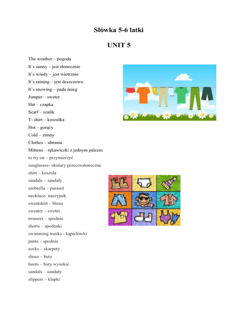Słówka 5-6 latki UNIT 5 The weather – pogoda It`s sunny – jest słonecznie It`s windy – jest wietrznie It`s raining – jest deszczowo It`s snowing – pada śnieg Jumper – sweter Hat – czapka Scarf – szalik T- shirt – koszulka Hot – gorący Cold – zimny Clothes – ubrania Mittens – rękawiczki z jednym palcem to try on – przymierzyć sunglasses- okulary przeciwsłoneczne shirt – koszula sandale – sandały umbrella – parasol necklace- naszyjnik sweatshirt – bluza sweater – sweter trousers – spodnie shorts – spodenki swimming trunks - kąpielówki pants – spodnie socks – skarpety shoes – buty boots – buty wysokie sandals – sandały slippers – klapki dress – sukienka jacket – marynarka skirt – spódnica, spódniczka costume – kostium nightgown – koszula nocna swimsuit – strój kąpielowy jeans – dżinsy shorts – szorty cow - krowa pig - świnka sheep - owca horse - koń duck- kaczka