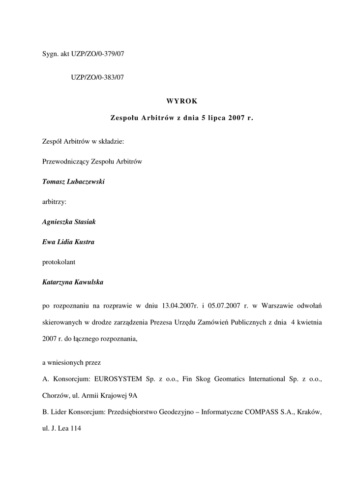 Sygn. akt UZP/ZO/0-379/07 UZP/ZO/0-383/07 WYROK Zespołu Arbitrów z dnia 5 lipca 2007 r. Zespół Arbitrów w składzie: Przewodniczący Zespołu Arbitrów Tomasz Lubaczewski arbitrzy: Agnieszka Stasiak Ewa Lidia Kustra protokolant Katarzyna Kawulska po rozpoznaniu na rozprawie w dniu 13.04.2007r. i 05.07.2007 r. w Warszawie odwołań skierowanych w drodze zarządzenia Prezesa Urzędu Zamówień Publicznych z dnia 4 kwietnia 2007 r. do łącznego rozpoznania, a wniesionych przez A. Konsorcjum: EUROSYSTEM Sp. z o.o., Fin Skog Geomatics International Sp. z o.o., Chorzów, ul. Armii Krajowej 9A B. Lider Konsorcjum: Przedsiębiorstwo Geodezyjno – Informatyczne COMPASS S.A., Kraków, ul. J. Lea 114 od oddalenia przez zamawiającego Gmina Sosnowiec, Sosnowiec, Al. Zwycięstwa 20 protestów z dnia A 29 marca 2007 r. B 30 marca 2007 r. przy udziale zgłaszającego przystąpienie do postępowania odwoławczego Konsorcjum, Którego Liderem Jest Geomat Sp. Z O.O. Z Siedzibą W Poznaniu po stronie zamawiającego, tj. Gmina Sosnowiec, Sosnowiec, Al. Zwycięstwa 20 . orzeka: 1. Uwzględnia odwołania i unieważnia postępowanie. 2. Kosztami postępowania obciąża Gmina Sosnowiec, Sosnowiec, Al. Zwycięstwa 20 i nakazuje: 1) zaliczyć na rzecz Urzędu Zamówień Publicznych koszty w wysokości 5 409 zł 89 gr (słownie: pięć tysięcy czterysta dziewięć złotych osiemdziesiąt dziewięć groszy) z kwoty wpisów uiszczonych przez odwołujących się, w tym: A koszty w wysokości 2 704 zł 95 gr (słownie: dwa tysiące siedemset cztery złote dziewięćdziesiąt pięć groszy) z kwoty wpisu uiszczonego przez Konsorcjum: EUROSYSTEM Sp. z o.o., Fin Skog Geomatics International Sp. z o.o., Chorzów, ul. Armii Krajowej 9A, B koszty w wysokości 2 704 zł 94 gr (słownie: dwa tysiące siedemset cztery złote dziewięćdziesiąt cztery grosze) z kwoty wpisu uiszczonego przez Lider Konsorcjum: Przedsiębiorstwo Geodezyjno – Informatyczne COMPASS S.A., Kraków, ul. J. Lea 114; Strona 2 z 9 2) dokonać wpłaty kwoty 12 609 zł 89 gr (słownie: dwanaście tysięcy sześćset dziewięć złotych osiemdziesiąt dziewięć groszy) stanowiącej uzasadnione koszty uczestnika postępowania odwoławczego, w tym: A kwoty 6 304 zł 95 gr (słownie: sześć tysięcy trzysta cztery złote dziewięćdziesiąt pięć groszy) przez Gmina Sosnowiec, Sosnowiec, Al. Zwycięstwa 20 na rzecz Konsorcjum: EUROSYSTEM Sp. z o.o., Fin Skog Geomatics International Sp. z o.o., Chorzów, ul. Armii Krajowej 9A, stanowiącej uzasadnione koszty uczestnika postępowania odwoławczego z tytułu kosztów postępowania i kosztów zastępstwa procesowego, B kwoty 6 304 zł 94 gr (słownie: sześć tysięcy trzysta cztery złote dziewięćdziesiąt cztery grosze) przez Gmina Sosnowiec, Sosnowiec, Al. Zwycięstwa 20 na rzecz Lider Konsorcjum: Przedsiębiorstwo Geodezyjno – Informatyczne COMPASS S.A., Kraków, ul. J. Lea 114, stanowiącej uzasadnione koszty uczestnika postępowania odwoławczego z tytułu kosztów postępowania i kosztów zastępstwa procesowego; 3) dokonać wpłaty kwoty 0 zł 0 gr (słownie: xxx) na rzecz Urzędu Zamówień Publicznych na rachunek dochodów własnych UZP, w tym A kwoty 0 zł 0 gr (słownie: xxx) przez xxx, B kwoty 0 zł 0 gr (słownie: xxx) przez xxx; 4) dokonać zwrotu kwoty 34 590 zł 11 gr (słownie: trzydzieści cztery tysiące pięćset dziewięćdziesiąt złotych jedenaście groszy) z rachunku dochodów własnych Urzędu Zamówień Publicznych na rzecz odwołujących się, w tym: Strona 3 z 9 A kwoty 17 295 zł 5 gr (słownie: siedemnaście tysięcy dwieście dziewięćdziesiąt pięć złotych pięć groszy) na rzecz Konsorcjum: EUROSYSTEM Sp. z o.o., Fin Skog Geomatics International Sp. z o.o., Chorzów, ul. Armii Krajowej 9A, B kwoty 17 295 zł 6 gr (słownie: siedemnaście tysiący dwieście dziewięćdziesiąt pięć złotych sześć groszy) na rzecz Lider Konsorcjum: Przedsiębiorstwo Geodezyjno – Informatyczne COMPASS S.A., Kraków, ul. J. Lea 114 . 3. Uzasadnienie Dnia 15.03.2007r. Konsorcjum składające się z przedsiębiorców: EUROSYSTEM z siedzibą w Chorzowie oraz Fin Skog Geometics International Sp. z o.o. z siedzibą w Gdańsku, którego liderem został EUROSYSTEM, zwany dalej EUROSYSTEM złożyło protest wobec czynności podjętych przez Gminę Sosnowiec (Zamawiający) w toku postępowania o zamówienie publiczne w trybie przetargu nieograniczonego na wykonanie usługi „Wykonanie kompleksowej modernizacji ewidencji gruntów i budynków jednostki ewidencyjnej Sosnowiec”, polegających na wykluczeniu z postępowania EUROSYSTEM, a niewykluczeniu Konsorcjum GEOMAT Sp. z o.o., P.G.K. VERTICAL Sp. z o.o., GEO-med. Mariusz Górski, SYSTHERM INFO Sp. z o.o., instytut Systemów Przestrzennych i Katastralnych S.A., zwanego dalej GEOMAT. Protestujący zarzucił Zamawiającemu naruszenie art. 7, art. 22 ust. 1 pkt 2, art. 38 ust. 1, art. 24 ust. 1 pkt 10, art. 24 ust. 1 pkt 10 i art. 24 ust. 2 pkt 2, art. 89 ust. 1 pkt 5 i art. 93 ust. 1 pkt 7 ustawy Prawo zamówień publicznych. Uwzględniając to EUROSYSTEM wniósł o powtórzenie czynności badania ofert i wyboru oraz o wykluczenie GEOMAT z postępowania. W przypadku, gdyby Zamawiający nie podzielił tych zarzutów alternatywnie wnioskował o unieważnienie postępowania ze względu na wadę uniemożliwiającą zawarcie ważnej umowy. W uzasadnieniu EUROSYSTEM podniósł, że posiada niezbędną wiedzę i doświadczenie ku temu, Strona 4 z 9 by zrealizować zamówienie oraz, że jego zdaniem zapisy SIWZ spowodowały, że żaden z wykonawców – w tym także konsorcjum GEOMAT nie spełnił warunków opisanych w SIWZ, w szczególności wymogów pkt 5.2.1. Powyższe błędy po stronie Zamawiającego powodują, że postępowanie obarczone jest wadą uniemożliwiającą zawarcie ważnej umowy. Rozstrzygając protest dnia 22.03.2007r. Zamawiający oddalił go uzasadniając, że zapisy 5.2.1 SIWZ są jednoznaczne, a EUROSYSTEM nie spełni