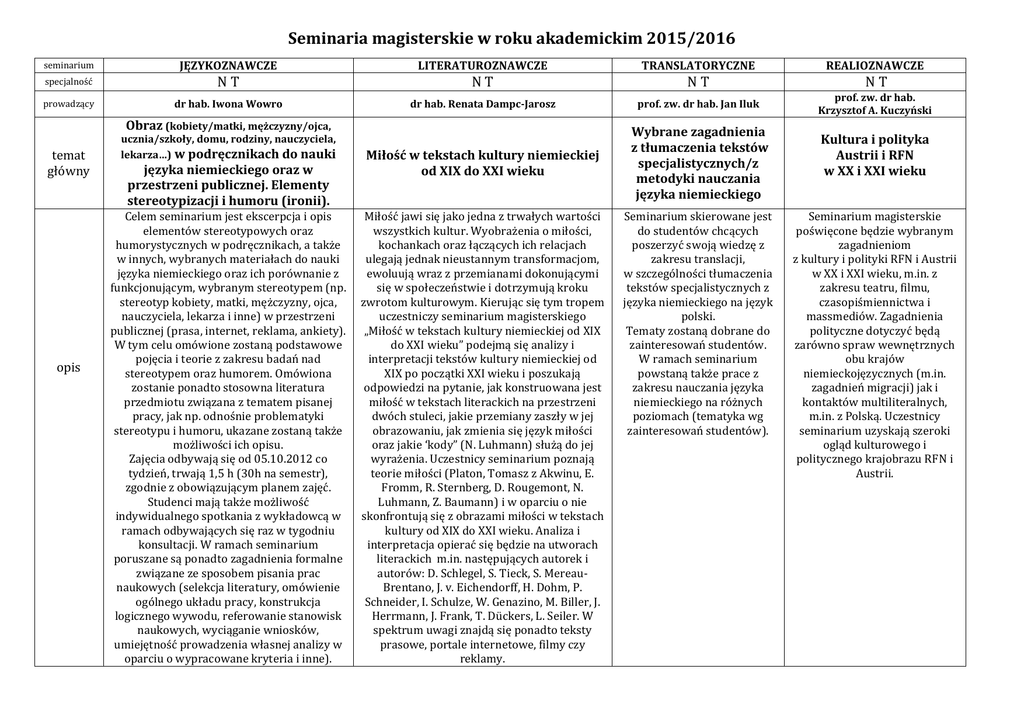 Seminaria magisterskie w roku akademickim 2015/2016 seminarium JĘZYKOZNAWCZE LITERATUROZNAWCZE TRANSLATORYCZNE specjalność NT NT NT NT dr hab. Renata Dampc-Jarosz prof. zw. dr hab. Jan Iluk prof. zw. dr hab. Krzysztof A. Kuczyński Miłość w tekstach kultury niemieckiej od XIX do XXI wieku Wybrane zagadnienia z tłumaczenia tekstów specjalistycznych/z metodyki nauczania języka niemieckiego prowadzący temat główny opis dr hab. Iwona Wowro Obraz (kobiety/matki, mężczyzny/ojca, ucznia/szkoły, domu, rodziny, nauczyciela, lekarza…) w podręcznikach do nauki języka niemieckiego oraz w przestrzeni publicznej. Elementy stereotypizacji i humoru (ironii). Celem seminarium jest ekscerpcja i opis elementów stereotypowych oraz humorystycznych w podręcznikach, a także w innych, wybranych materiałach do nauki języka niemieckiego oraz ich porównanie z funkcjonującym, wybranym stereotypem (np. stereotyp kobiety, matki, mężczyzny, ojca, nauczyciela, lekarza i inne) w przestrzeni publicznej (prasa, internet, reklama, ankiety). W tym celu omówione zostaną podstawowe pojęcia i teorie z zakresu badań nad stereotypem oraz humorem. Omówiona zostanie ponadto stosowna literatura przedmiotu związana z tematem pisanej pracy, jak np. odnośnie problematyki stereotypu i humoru, ukazane zostaną także możliwości ich opisu. Zajęcia odbywają się od 05.10.2012 co tydzień, trwają 1,5 h (30h na semestr), zgodnie z obowiązującym planem zajęć. Studenci mają także możliwość indywidualnego spotkania z wykładowcą w ramach odbywających się raz w tygodniu konsultacji. W ramach seminarium poruszane są ponadto zagadnienia formalne związane ze sposobem pisania prac naukowych (selekcja literatury, omówienie ogólnego układu pracy, konstrukcja logicznego wywodu, referowanie stanowisk naukowych, wyciąganie wniosków, umiejętność prowadzenia własnej analizy w oparciu o wypracowane kryteria i inne). Miłość jawi się jako jedna z trwałych wartości wszystkich kultur. Wyobrażenia o miłości, kochankach oraz łączących ich relacjach ulegają jednak nieustannym transformacjom, ewoluują wraz z przemianami dokonującymi się w społeczeństwie i dotrzymują kroku zwrotom kulturowym. Kierując się tym tropem uczestniczy seminarium magisterskiego „Miłość w tekstach kultury niemieckiej od XIX do XXI wieku” podejmą się analizy i interpretacji tekstów kultury niemieckiej od XIX po początki XXI wieku i poszukają odpowiedzi na pytanie, jak konstruowana jest miłość w tekstach literackich na przestrzeni dwóch stuleci, jakie przemiany zaszły w jej obrazowaniu, jak zmienia się język miłości oraz jakie ‘kody” (N. Luhmann) służą do jej wyrażenia. Uczestnicy seminarium poznają teorie miłości (Platon, Tomasz z Akwinu, E. Fromm, R. Sternberg, D. Rougemont, N. Luhmann, Z. Baumann) i w oparciu o nie skonfrontują się z obrazami miłości w tekstach kultury od XIX do XXI wieku. Analiza i interpretacja opierać się będzie na utworach literackich m.in. następujących autorek i autorów: D. Schlegel, S. Tieck, S. MereauBrentano, J. v. Eichendorff, H. Dohm, P. Schneider, I. Schulze, W. Genazino, M. Biller, J. Herrmann, J. Frank, T. Dückers, L. Seiler. W spektrum uwagi znajdą się ponadto teksty prasowe, portale internetowe, filmy czy reklamy. Seminarium skierowane jest do studentów chcących poszerzyć swoją wiedzę z zakresu translacji, w szczególności tłumaczenia tekstów specjalistycznych z języka niemieckiego na język polski. Tematy zostaną dobrane do zainteresowań studentów. W ramach seminarium powstaną także prace z zakresu nauczania języka niemieckiego na różnych poziomach (tematyka wg zainteresowań studentów). REALIOZNAWCZE Kultura i polityka Austrii i RFN w XX i XXI wieku Seminarium magisterskie poświęcone będzie wybranym zagadnieniom z kultury i polityki RFN i Austrii w XX i XXI wieku, m.in. z zakresu teatru, filmu, czasopiśmiennictwa i massmediów. Zagadnienia polityczne dotyczyć będą zarówno spraw wewnętrznych obu krajów niemieckojęzycznych (m.in. zagadnień migracji) jak i kontaktów multiliteralnych, m.in. z Polską. Uczestnicy seminarium uzyskają szeroki ogląd kulturowego i politycznego krajobrazu RFN i Austrii.