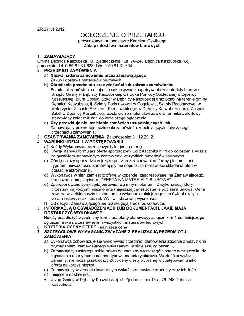 ZR.271.4.2012 OGŁOSZENIE O PRZETARGU prowadzonym na podstawie Kodeksu Cywilnego Zakup i dostawa materiałów biurowych 1. ZAMAWIAJĄCY Gmina Dębnica Kaszubska , ul. Zjednoczenia 16a, 76-248 Dębnica Kaszubska, woj. pomorskie, tel. 0-59 81-31-623, faks 0-59 81 31 634. 2. PRZEDMIOT ZAMÓWIENIA a) Nazwa nadana zamówieniu przez zamawiającego: Zakup i dostawa materiałów biurowych b) Określenie przedmiotu oraz wielkości lub zakresu zamówienia: Przedmiot zamówienia obejmuje sukcesywne zaopatrywanie w materiały biurowe Urządu Gminy w Dębnicy Kaszubskiej, Ośrodka Pomocy Społecznej w Dębnicy Kaszubskiej, Biura Obsługi Szkół w Dębnicy Kaszubskiej oraz Szkół na terenie gminy Dębnica Kaszubska, tj. Szkoły Podstawowej w Gogolewie, Szkoły Podstawowej w Motarzynie, Zespołu Szkolno - Przedszkolnego w Dębnicy Kaszubskiej oraz Zespołu Szkół w Dębnicy Kaszubskiej. Zestawienie materiałów zawiera formularz ofertowy stanowiący załącznik nr 1 do niniejszego ogłoszenia. c) Czy przewiduje się udzielenie zamówień uzupełniających: tak Zamawiający przewiduje udzielenie zamówień uzupełniających dotyczącego przedmiotu zamówienia. 3. CZAS TRWANIA ZAMÓWIENIA: Zakończenie: 31.12.2012. 4. WARUNKI UDZIAŁU W POSTĘPOWANIU a) Każdy Wykonawca może złożyć tylko jedną ofertę. b) Ofertę stanowi formularz oferty sporządzony wg załącznika Nr 1 do ogłoszenia wraz z załącznikiem stanowiącym zestawienie wszystkich materiałów biurowych. c) Ofertę należy sporządzić w języku polskim z zachowaniem formy pisemnej pod rygorem nieważności. Zamawiający nie dopuszcza możliwości składania ofert w postaci elektronicznej. d) Wykonawca winien zamieścić ofertę w kopercie, zaadresowanej na Zamawiającego, oraz oznaczonej zapisem „OFERTA NA MATERIAŁY BIUROWE” e) Zaproponowane ceny będą porównane z innymi ofertami. Z wykonawcą, który przestawi najkorzystniejszą ofertę (najniższą cenę) zostanie popisana umowa. Cena zawiera wszelkie koszty niezbędne do wykonania niniejszego zamówienia w tym koszt dostawy oraz podatek VAT w ustawowej wysokości. f) Od decyzji Zamawiającego nie przysługują środki odwoławcze. 5. INFORMACJA O OŚWIADCZENIACH LUB DOKUMENTACH, JAKIE MAJĄ DOSTARCZYĆ WYKONAWCY Należy przedłożyć wypełniony formularz oferty stanowiący załącznik nr 1 do niniejszego ogłoszenia wraz z zestawieniem wszystkich materiałów biurowych. 6. KRYTERIA OCENY OFERT - najniższa cena. 7. SZCZEGÓŁOWE WYMAGANIA ZWIĄZANE Z REALIZACJĄ PRZEDMIOTU ZAMÓWIENIA: a) wykonawca zobowiązuje się wykonywać przedmiot zamówienia zgodnie z wszystkimi wymaganiami zamawiającego wskazanymi w niniejszej ogłoszeniu, b) Zamawiający zastrzega sobie prawo do zamiany wyszczególnionego w załączniku do ogłoszenia asortymentu na inne typowe materiały biurowe. Wartość powyższej zamiany, nie może przekroczyć 20% ceny oferty wybranej w postępowaniu jako oferta najkorzystniejsza, c) Zamawiający w zleceniu kwartalnym wskaże zamawiane produkty oraz ich ilość, d) miejscem dostaw jest: • Urząd Gminy w Dębnicy Kaszubskiej, ul. Zjednoczenia 16 a, 76-248 Dębnica Kaszubska • • • • • Ośrodek Pomocy Społecznej, ul. Zjednoczenia 76-248 Dębnica Kaszubska Biuro Obsługi Szkół ul. Zjednoczenia 16 a, 76-248 Dębnica Kaszubska Szkoła Podstawowa w Gogolewie, Gogolewo 40, 76-248 Dębnica Kaszubska Szkoła Podstawowa w Motarzynie, Motarzyno 9a, 76-248 Dębnica Kaszubska Zespół Szkolno - Przedszkolny w Dębnicy Kaszubskiej, ul. Zjednoczenia 28, 76-248 Dębnica Kaszubska • Zespołu Szkół w Dębnicy Kaszubskiej, ul. Jana III Sobieskiego 3, 76-248 Dębnica Kaszubska, e) przedmiot konkretnego zlecenia zostanie wydany Zamawiającemu w terminie 7 dni od otrzymania przez wykonawcę kwartalnego zlecenia. f) rozliczenia pomiędzy Zamawiającym a Wykonawcą będą następowały po każdym zrealizowanym prawidłowo zleceniu, według cen jednostkowych przedstawionych w ofercie, na podstawie faktycznie zrealizowanych dostaw, g) zapłata wynagrodzenia za dostarczony przedmiot umowy następować będzie po zrealizowaniu każdej z dostaw, na podstawie częściowych faktur wystawionych na poszczególne jednostki, h) Zamawiający zastrzega sobie prawo do dokonania przesunięć ilościowych pomiędzy pozycjami wyszczególnionymi w załączniku do umowy. Wartość dokonanych przesunięć nie może przekroczyć 20% ceny oferty wybranej w postępowaniu jako oferta najkorzystniejsza, i) Zamawiający zastrzega sobie prawo do zamiany wyszczególnionego w załączniku do umowy asortymentu na inne typowe materiały biurowe. j) Zamawiający zastrzega sobie prawo ograniczenia przedmiotu umowy w zakresie ilościowym w przypadku, gdy z powodów ekonomicznych, bieżących potrzeb lub innych, nie będzie to leżało w interesie Zamawiającego. 8. INFORMACJE ADMINISTRACYJNE a) Adres strony internetowej, na której jest dostępna specyfikacja istotnych warunków zamówienia: ug.debnicakaszubska.ibip.pl b) Termin składania wniosków o dopuszczenie do udziału w postępowaniu lub ofert: 27.02.2012, miejsce: Urząd Gminy w Dębnicy Kaszubskiej ul. Zjednoczenia 16a 76-248 Dębnica Kaszubska. c) Termin związania ofertą: 30 dni od ostatecznego terminu składania ofert 9. POZOSTAŁE INFORMACJE a) W uzasadnionych przypadkach Zamawiający może przed upływem terminu składania ofert zmienić treść zapisów niniejszego ogłoszenia. Dokonaną w ten sposób zmianę przekazuje się niezwłocznie wszystkim Wykonawcom, którym przekazano informację oraz umieszcza je na stronie internetowej Zamawiającego. b) Jeżeli w wyniku zmiany treści ogłoszenia jest niezbędny dodatkowy czas na wprowadzenie zmian w ofertach, zamawiający przedłuża termin składania ofert i informuje o tym wykonawców oraz zamieszcza informację na stronie internetowej. c) Osobami uprawnionymi do porozumiewania się z Wykonawcami są: Joanna Krajewska, tel 059/813 16 23 e-mail: [email protected] d) Zamawiający z