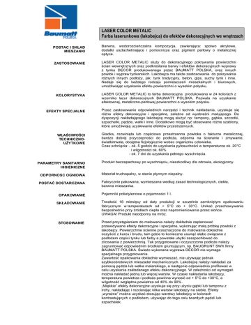 LASER COLOR METALIC Farba laserunkowa (lakobejca) do efektów dekoracyjnych we wnętrzach POSTAC I SKŁAD MIESZANKI Barwna, wodorozcieńczalna kompozycja, zawierająca: spoiwo akrylowe, dodatki uszlachetniające i pomocnicze oraz pigment perłowy o metalicznej optyce. ZASTOSOWANIE LASER COLOR METALIC służy do dekoracyjnego pokrywania powierzchni ścian wewnętrznych oraz podkreślania barwy i efektów dekoracyjnych wyprawy z tynku DECOR produkowanego przez BAUMATT POLSKA, oraz innych powłok i wypraw tynkarskich. Lakobejca ma także zastosowanie do pokrywania różnych innych podłoży, jak: tynk tradycyjny, beton, gips, suchy tynk i inne. Nadaje się do każdego rodzaju pomieszczeń mieszkalnych i biurowych, umożliwiając uzyskanie efektu powierzchni o wysokim połysku. KOLORYSTYKA LASER COLOR METALIC to farba dekoracyjna produkowana w 24 kolorach z wzornika lazur dekoracyjnych BAUMATT POLSKA. Pozwala na uzyskanie efektownej, metaliczno-perłowej powierzchni o wysokim połysku. EFEKTY SPECJALNE WŁAŚCIWOŚCI TECHNICZNOUŻYTKOWE PARAMETRY SANITARNO HIGIENICZNE ODPORNOSC OGNIOWA POSTAĆ DOSTARCZANA OPAKOWANIE SKŁADOWANIE STOSOWANIE Przez zastosowanie odpowiednich narzędzi i technik nakładania, uzyskuje się różne efekty dekoracyjne i specjalne, zależne od wyobraźni malującego. Do dyspozycji nakładającego lakobejcę mogą służyć np: tampony, gąbka, szczotki, szpachelki, pędzle, wałki i inne. Dodatkowo mogą być stosowane różne szablony, które umożliwiają uzyskiwanie efektów przestrzennych. Gładka, rozwinięta lub częściowo przestrzenna powłoka o fakturze metalicznej, bardzo dobrej przyczepności do podłoża, odporna na ścieranie i zmywanie, światłotrwała, obojętna fizjologicznie wobec organizmu człowieka. Czas schnięcia: - ok. 5 godzin do uzyskania pyłosuchości w temperaturze ok. 20°C i wilgotności ok. 60% - ok. 7 dni do uzyskania pełnego wyschnięcia. Produkt bezzapachowy po wyschnięciu, nieszkodliwy dla zdrowia, ekologiczny. Materiał trudnopalny, w stanie płynnym niepalny. Fabrycznie pakowana, wymieszana według zasad technologicznych, ciekła, barwna mieszanka. Pojemniki polietylenowe o pojemności 1 l. Trwałość 18 miesięcy od daty produkcji w szczelnie zamkniętym opakowaniu fabrycznym w temperaturach od + 5°C do + 30°C. Unikać przechowywania bezpośrednio przy źródłach ciepła oraz napromieniowania przez słońce. UWAGA! Produkt nieodporny na mróz. Przed przystąpieniem do malowania należy dokładnie zaplanować przewidywane efekty dekoracyjne i specjalne, wykonując małą próbkę powłoki z lakobejcy. Powierzchnie ścienne przeznaczone do malowania dokładnie oczyścić z kurzu i brudu, tam gdzie to konieczne usunąć słabo związane z podłożem części tynku lub farby a powstałe ubytki zaszpachlować do zlicowania z powierzchnią. Tak przygotowane i oczyszczone podłoże należy zagruntować odpowiednim środkiem gruntującym, np. BAUGRUNT SWX firmy BAUMATT POLSKA. Świeżo wykonana wyprawa DECOR nie wymaga specjalnego przygotowania. Zawartość opakowania dokładnie wymieszać, nie używając jednak szybkoobrotowych mieszadeł mechanicznych. Lakobejcę należy nakładać za pomocą pędzla lub wałka malarskiego, a następnie odpowiednio profilować w celu uzyskania zakładanego efektu dekoracyjnego. W zależności od wymagań można nakładać jedną lub więcej warstw. W czasie nakładania lakobejcy, temperatura powietrza i podłoża powinna wynosić od + 5°C do +30°C, a wilgotność względna powietrza od 40% do 90%. „Miękkie” efekty dekoracyjne uzyskuje się przy użyciu gąbki lub tamponu z irchy, nakładając i rozcierając kilka warstw lakobejcy na siebie. Efekty „wyraźne” można uzyskać stosując warstwy lakobejcy w kolorach kontrastujących z podłożem, używając do tego celu twardych pędzli lub szpachelek. LASER COLOR METALIC Farba laserunkowa (lakobejca) do efektów dekoracyjnych we wnętrzach ZUŻYCIE W zależności od techniki nakładania oraz ukształtowania i rozwinięcia powierzchni, jak również od chłonności podłoża, zużycie wynosi 1 litr na 2 8-16 m , przy jednokrotnym nakładaniu lakobejcy. CZYSZCZENIE NARZĘDZI Narzędzia należy myć czystą, bieżącą wodą, bezpośrednio po zakończeniu pracy. OCHRONA ŚRODOWISKA Puste opakowania oraz resztki lakobejcy powinny być poddane utylizacji lub usunięciu zgodnie z obowiązującymi przepisami. PODSTAWY FORMALNO-PRAWNE UWAGA PRODUCENTA 1. PN-C-81914:2002. Dane zawarte w niniejszej ulotce odpowiadają aktualnemu stanowi wiedzy w tej dziedzinie. Nasze instrukcje oparte są na próbach i doświadczeniu praktycznym. Sądzimy, że powyższe informacje oddadzą dobre usługi użytkownikom, jednak mogą one być tylko wskazówkami ogólnymi, ponieważ warunki wykonawstwa pozostają poza naszą kontrolą.