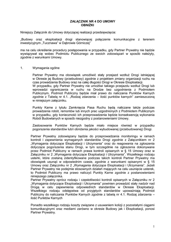 ZAŁĄCZNIK NR 4 DO UMOWY OBNIŻKI Niniejszy Załącznik do Umowy dotyczącej realizacji przedsięwzięcia: „Budowy oraz eksploatacji drogi stanowiącej inwestycyjnym „Tucznawa” w Dąbrowie Górniczej” połączenie komunikacyjne z terenem ma na celu określenie procedury postępowania w przypadku, gdy Partner Prywatny nie będzie wywiązywał się wobec Podmiotu Publicznego ze swoich zobowiązań w sposób należyty, zgodnie z warunkami Umowy. 1. Wymagania ogólne Partner Prywatny ma obowiązek umożliwić stały przejazd wzdłuż Drogi istniejącej w Okresie jej Budowy (przebudowy) zgodnie z projektem zmiany organizacji ruchu na czas prowadzenia Budowy oraz na całej długości Drogi w Okresie Eksploatacji. W przypadku, gdy Partner Prywatny nie umożliwi takiego przejazdu wzdłuż Drogi lub wprowadzi ograniczenia w ruchu na Drodze bez uzgodnienia z Podmiotem Publicznym, Podmiot Publiczny będzie miał prawo do naliczania Punktów Karnych zgodnie z Tabelą nr 4.1. „Rodzaj zdarzenia – ilość punktów karnych” zamieszczoną w niniejszym załączniku. Punkty Karne z tytułu Zamknięcia Pasa Ruchu będą naliczane także podczas prowadzenia robót, remontów lub innych prac uzgodnionych z Podmiotem Publicznym w przypadku, gdy konieczność ich przeprowadzenia będzie konsekwencją wykonania Robót Budowlanych w sposób niezgodny z postanowieniami Umowy. Zastosowanie Punktów Karnych będzie miało miejsce również w przypadku pogorszenia standardów lub/i obniżenia jakości wybudowanej (przebudowanej) Drogi. Partner Prywatny zobowiązany będzie do przeprowadzania monitoringu w ramach kontroli i zapewnienia wymaganych standardów Drogi zgodnie z Załącznikiem nr 2 „Wymagania dotyczące Eksploatacji i Utrzymania” oraz do reagowania na zgłoszenia dotyczące pogorszenia stanu Drogi, w tym szczególnie na zgłoszenia dokonywane przez Podmiot Publiczny w ramach prawa kontroli opisanych w § 15 Umowy oraz w Załączniku nr 2 „Wymagania dotyczące Eksploatacji i Utrzymania”. Wszelkiego rodzaju usterki, które zostaną zidentyfikowane podczas takich kontroli Partner Prywatny ma obowiązek usunąć w odpowiednim czasie, zgodnie z warunkami opisanymi w § 15 Umowy oraz Załączniku nr 2 „Wymagania dotyczące Eksploatacji i Utrzymania”. Jeżeli Partner Prywatny nie podejmie stosownych działań mających na celu usunięcie usterek, to Podmiot Publiczny ma prawo naliczyć Punkty Karne zgodnie z postanowieniami niniejszego załącznika. Partner Prywatny oprócz rodzaju i częstotliwości kontroli opisanych w Załączniku nr 2 „Wymagania dotyczące Eksploatacji i Utrzymania” powinien prowadzić stały nadzór nad Drogą w celu zapewnienia odpowiednich standardów w Okresie Eksploatacji. Wszelkiego rodzaju odstępstwa od przyjętych standardów upoważniają Podmiot Publiczny do naliczania Punktów Karnych zgodnie z tabelą nr 4.1. Rodzaj zdarzenia – ilość Punktów Karnych Ponadto wszelkiego rodzaju koszty związane z usuwaniem kolizji z pozostałymi ciągami komunikacyjnymi oraz mediami zarówno w okresie Budowy jak i Eksploatacji, ponosi Partner Prywatny. 1 2. Algorytm naliczania Punktów Karnych z tytułu Zamknięcia Pasa Ruchu i innych Przypadków nałożenia Punktów Karnych Zakłada się następujące zasady postępowania w przypadku konieczności zastosowania Obniżek dla Partnera Prywatnego związanych z niedotrzymaniem warunków utrzymania i eksploatacji w okresie budowy Drogi i podczas jej użytkowania. Przyjmuje się, że 100 Punktów Karnych stanowi równowartość 100 % Maksymalnego Wynagrodzenia Miesięcznego (MWM) należnego Partnerowi Prywatnemu w Okresie Eksploatacji. W przypadku, gdy Partner Prywatny nie zapewni przejezdności Drogi w trakcie jej Budowy zgodnie z obowiązującym projektem organizacji ruchu na czas prowadzenia budowy, za każdorazowe naruszenie tego obowiązku Podmiot Publiczny będzie miał prawo nałożyć 2 Punkty Karne za każdy dzień. Punkty Karne naliczone w trakcie prowadzenia Prac zostaną uwzględnione przy korygowaniu MWM za pierwszy lub następne okresy rozliczeniowe (miesiące) w przypadku przekroczenia przez Partnera Prywatnego 100 Punktów Karnych. Obniżki dokonywane będą miesięcznie. W przypadku, gdy Obniżka za dany miesiąc przekraczać będzie wartość MWM (pomniejszoną o kwotę ewentualnych Obniżek, które nie znalazły pokrycia w MWM za poprzedni okres rozliczeniowy) pozostała część Obniżki zostanie uwzględniona w następnym okresie rozliczeniowym (kolejny miesiąc). Niezależnie od zastosowania Obniżek przez Podmiot Publiczny, Partner Prywatny będzie zobowiązany do pokrycia wszelkiego rodzaju kosztów wynikających z uzasadnionych roszczeń osób trzecich związanych z eksploatacją i utrzymaniem przedmiotowego odcinka Drogi. Tabela nr 4.1. Rodzaj zdarzenia – ilość Punktów Karnych L.p. Opis zdarzenia powodującego naliczenie punktów karnych Ilość punktów Ilość punkt ów 1. Brak całkowitego przejazdu wzdłuż odcinka Drogi lub ograniczenie możliwości tego przejazdu bez zgody Podmiotu Publicznego, („Zamknięcie Pasa Ruchu”) spowodowany działaniami Partnera Prywatnego z wyjątkiem usuwania skutków Siły Wyższej – za każdy dzień. 2 2. Stan spękań i stan powierzchni nawierzchni w przedziale Klasy (SOSN) pomiędzy B i C utrzymujący się w okresie dłuższym niż 9 miesięcy. 10 3. Stan spękań i stan powierzchni nawierzchni w przedziale Klasy (SOSN) pomiędzy C i D utrzymujący się w okresie dłuższym niż 9 miesięcy. 20 4. Stan spękań i stan powierzchni nawierzchni niższy od Klasy (SOSN) D utrzymujący się w okresie dłuższym niż 9 miesięcy. 30 5. Stan równości podłużnej podłoża – IRI w przedziale Klasy (SOSN) pomiędzy B i C utrzymujący się w okresie dłuższym niż 9 miesięcy. 10 6. Stan równości podłużnej podłoża – IRI w przedziale Klasy (SOSN) pomiędzy C i D utrzymujący się w okresie dłuższym niż 9 miesięcy. 20 2 7. Stan równości po