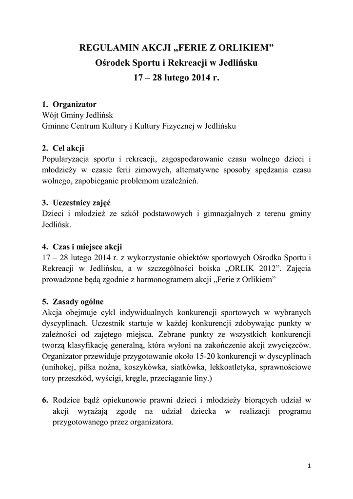 REGULAMIN AKCJI „FERIE Z ORLIKIEM” Ośrodek Sportu i Rekreacji w Jedlińsku 17 – 28 lutego 2014 r. 1. Organizator Wójt Gminy Jedlińsk Gminne Centrum Kultury i Kultury Fizycznej w Jedlińsku 2. Cel akcji Popularyzacja sportu i rekreacji, zagospodarowanie czasu wolnego dzieci i młodzieży w czasie ferii zimowych, alternatywne sposoby spędzania czasu wolnego, zapobieganie problemom uzależnień. 3. Uczestnicy zajęć Dzieci i młodzież ze szkół podstawowych i gimnazjalnych z terenu gminy Jedlińsk. 4. Czas i miejsce akcji 17 – 28 lutego 2014 r. z wykorzystanie obiektów sportowych Ośrodka Sportu i Rekreacji w Jedlińsku, a w szczególności boiska „ORLIK 2012”. Zajęcia prowadzone będą zgodnie z harmonogramem akcji „Ferie z Orlikiem” 5. Zasady ogólne Akcja obejmuje cykl indywidualnych konkurencji sportowych w wybranych dyscyplinach. Uczestnik startuje w każdej konkurencji zdobywając punkty w zależności od zajętego miejsca. Zebrane punkty ze wszystkich konkurencji tworzą klasyfikację generalną, która wyłoni na zakończenie akcji zwycięzców. Organizator przewiduje przygotowanie około 15-20 konkurencji w dyscyplinach (unihokej, piłka nożna, koszykówka, siatkówka, lekkoatletyka, sprawnościowe tory przeszkód, wyścigi, kręgle, przeciąganie liny.) 6. Rodzice bądź opiekunowie prawni dzieci i młodzieży biorących udział w akcji wyrażają zgodę na udział dziecka w realizacji programu przygotowanego przez organizatora. 1 7. Program jest określony w sposób ramowy i przybliżony. Organizator zastrzega sobie prawo do wprowadzenia zmian wynikających z zainteresowań uczestników, pogody oraz przyczyn technicznych. 8. Uczestników akcji obowiązuje strój sportowy lub dres oraz obuwie sportowe bez kolców i kołków. 9. Wszyscy uczestnicy akcji zobowiązani są do przestrzegania regulaminów określających zasady korzystania z obiektów sportowych znajdujących się na terenie Ośrodka Sportu i Rekreacji. 10.W sprawach nieujętych niniejszym regulaminem decyzję podejmuje organizator. 11.Zgłoszenia przyjmujemy do 18 lutego (wtorek) do godz. 18: 00. Po zgłoszeniu się uczestników zostaną utworzone grupy uczestników ze względu na płeć oraz wiek. Gminne Centrum Kultury i Kultury Fizycznej w Jedlińsku Ul. Krótka 1 26 – 660 Jedlińsk Tel. (48) 32-13-052, email: [email protected] Osoba do kontaktu: Łukasz Kurek 2