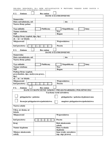 WKŁADKA DODATKOWA, DLA OSÓB AKTUALIZUJĄCYCH WYKSZTAŁCENIU, ZATRUDNIENIU I SPECJALIZACJI. E 2. Zmiana W DANYCH Inny Fax Regon Województwo Poczta - Zmiana Niepubliczny Bez zmian DANE O ZATRUDNIENIU Stanowisko Data zatrudnienia, od: Nazwa firmy pełna: do: Typ zakładu Publiczny Numer telefonu NIP Podtyp firmy (szpital, przychodnie, dps, medycyna pracy, itp.) ul. / nr / nr lokalu Miejscowość kod pocztowy F 2. ILOŚCI do: Typ zakładu Publiczny Numer telefonu NIP Podtyp firmy (szpital, dps, itp.) ul. / nr / nr lokalu Miejscowość E 2. WIĘKSZEJ Bez zmian DANE O ZATRUDNIENIU Stanowisko Data zatrudnienia, od: Nazwa firmy pełna: kod pocztowy PRZYPADKU Niepubliczny Inny Fax Regon Województwo Poczta Zmiana Bez zmian DANE O UKOŃCZENIU SZKOŁY PIELĘGNIARSKIEJ, POŁOŻNICZEJ Uzyskany tytuł zawodowy pielęgniarka / położna pielęgniarka / położna dyplomowana licencjat pielęgniarstwa/położnictwa magister pielęgniarstwa/położnictwa Nazwa szkoły Ulica, nr domu, nr lokalu Miejscowość kod pocztowy Kraj Numer dyplomu Miejsce ukończenia szkoły Województwo - Poczta Rok ukończenia szkoły Data wydania dyplomu Inne tytuły zawodowe (np. mgr prawa) O F 2. Zmiana Bez zmian DANE O UKOŃCZENIU SZKOŁY PIELĘGNIARSKIEJ, POŁOŻNICZEJ Uzyskany tytuł zawodowy pielęgniarka / położna pielęgniarka / położna dyplomowana licencjat pielęgniarstwa/położnictwa magister pielęgniarstwa/położnictwa Nazwa szkoły Ulica, nr domu, nr lokalu Miejscowość kod pocztowy Województwo Poczta - Kraj Rok ukończenia szkoły Data wydania dyplomu Inne tytuły zawodowe (np. mgr prawa) Numer dyplomu Miejsce ukończenia szkoły F 2. Zmiana Bez zmian DANE O UKOŃCZENIU SZKOŁY PIELĘGNIARSKIEJ, POŁOŻNICZEJ Uzyskany tytuł zawodowy pielęgniarka / położna pielęgniarka / położna dyplomowana licencjat pielęgniarstwa/położnictwa magister pielęgniarstwa/położnictwa Nazwa szkoły Ulica, nr domu, nr lokalu Miejscowość kod pocztowy Województwo Poczta - Kraj Rok ukończenia szkoły Data wydania dyplomu Inne tytuły zawodowe (np. mgr prawa) Numer dyplomu Miejsce ukończenia szkoły G 2. Zmiana Bez zmian DANE O SPECJALIZACJI Dziedzina specjalizacji Nazwa organizatora Data ukończenia Numer dyplomu Dziedzina specjalizacji Nazwa organizatora Data ukończenia Numer dyplomu Data wystawiania Data wystawiania ……………………………………………. Data i podpis