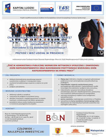 Projekt współfinansowany ze środków Unii Europejskiej w ramach Europejskiego Funduszu Społecznego Chcesz podjąć PŁATNY STAŻ oraz znaleźć PRACĘ? Nie wiesz, jak zacząć skutecznie szukać stażu, zatrudnienia? Potrzebne Ci są dodatkowe kwalifikacje? PRZYJDŹ I WEŹ UDZIAŁ W PROJEKCIE realizowanym przez Fundację Instytut Rozwoju Regionalnego i Biuro ds. Osób Niepełnosprawnych Politechniki Łódzkiej „Staż w administracji publicznej wsparciem aktywizacji społecznej i zawodowej osób niepełnosprawnych oraz budowaniem pozytywnego wizerunku osób niepełnosprawnych na rynku pracy” CEL PROJEKTU • zdobycie doświadczenia zawodowego poprzez uczestnictwo w płatnym 3-miesięcznym stażu, • uzyskanie kompleksowego wsparcia w wejściu na rynek pracy, • podjęcie zatrudnienia. WA R U N K I U C Z E S T N I C T WA • deklaracja udziału w projekcie, • motywacja do podjęcia w przyszłości pracy, • aktualne orzeczenie o niepełnosprawności w stopniu znacznym, umiarkowanym lub lekkim sprzężonym, • posiadanie statusu osoby nieaktywnej zawodowo w momencie przystąpienia do projektu. F O R M Y W S PA R C I A • Płatny staż (1450 zł/m-c brutto) w organach administracji publicznej (w tym samorządowej) oraz jednostkach jej podległych, • indywidualne wsparcie coacha/trenera pracy, pomagającego ukierunkować i zoptymalizować wysiłki zmierzające do znalezienia i podjęcia stażu oraz pracy, • indywidualne i grupowe konsultacje doradztwa zawodowego, praw dot. niepełnosprawności, prawa pracy oraz możliwości dofinansowania do wynagrodzeń, • warsztaty kompetencji miękkich oraz umiejętności specjalistycznych, • pomoc asystenta, wspierającego uczestnictwo w Projekcie, • specjalistyczne kursy zawodowe z komercyjnego rynku, dopasowane do indywidualnych potrzeb uczestnika oraz wymogów rynku pracy. K O N TA K T Biuro ds. Osób Niepełnosprawnych PŁ ul. Żeromskiego 116, 90-924 Łódź tel./fax.: +48 42 636-23-41, wew. PŁ: 28-87 e-mail: [email protected] www.bon.p.lodz.pl CZŁOWIEK – NAJLEPSZA INWESTYCJA! Fundacja Instytut Rozwoju Regionalnego ul. Wybickiego 3A, 31-261 Kraków tel. 12 629 85 14, faks: 12 629 85 15 e-mail: [email protected] www.firr.org.pl PATRONI HONOROWI Marszałek Województwa Małopolskiego Marek Sowa