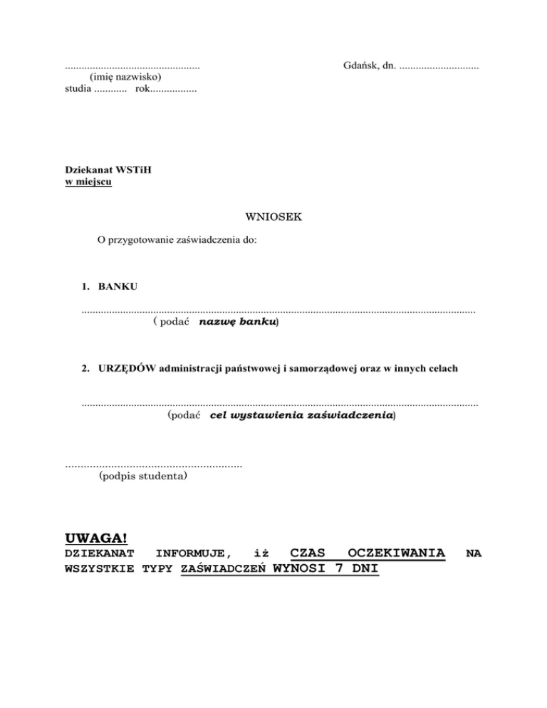 ................................................. (imię nazwisko) studia ............ rok................. Gdańsk, dn. ............................. Dziekanat WSTiH w miejscu WNIOSEK O przygotowanie zaświadczenia do: 1. BANKU ............................................................................................................................................... ( podać nazwę banku) 2. URZĘDÓW administracji państwowej i samorządowej oraz w innych celach ................................................................................................................................................ (podać cel wystawienia zaświadczenia) .......................................................... (podpis studenta) UWAGA! DZIEKANAT INFORMUJE, iż CZAS OCZEKIWANIA WSZYSTKIE TYPY ZAŚWIADCZEŃ WYNOSI 7 DNI NA