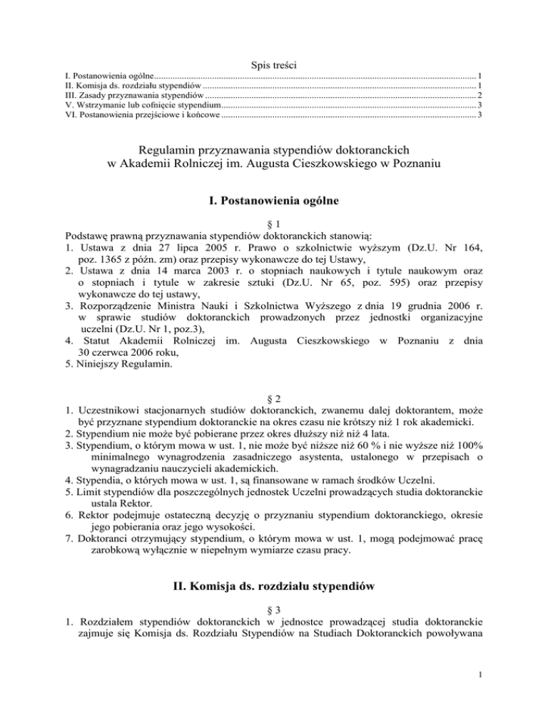 Spis treści I. Postanowienia ogólne........................................................................................................................................... 1 II. Komisja ds. rozdziału stypendiów ...................................................................................................................... 1 III. Zasady przyznawania stypendiów ..................................................................................................................... 2 V. Wstrzymanie lub cofnięcie stypendium.............................................................................................................. 3 VI. Postanowienia przejściowe i końcowe .............................................................................................................. 3 Regulamin przyznawania stypendiów doktoranckich w Akademii Rolniczej im. Augusta Cieszkowskiego w Poznaniu I. Postanowienia ogólne §1 Podstawę prawną przyznawania stypendiów doktoranckich stanowią: 1. Ustawa z dnia 27 lipca 2005 r. Prawo o szkolnictwie wyższym (Dz.U. Nr 164, poz. 1365 z późn. zm) oraz przepisy wykonawcze do tej Ustawy, 2. Ustawa z dnia 14 marca 2003 r. o stopniach naukowych i tytule naukowym oraz o stopniach i tytule w zakresie sztuki (Dz.U. Nr 65, poz. 595) oraz przepisy wykonawcze do tej ustawy, 3. Rozporządzenie Ministra Nauki i Szkolnictwa Wyższego z dnia 19 grudnia 2006 r. w sprawie studiów doktoranckich prowadzonych przez jednostki organizacyjne uczelni (Dz.U. Nr 1, poz.3), 4. Statut Akademii Rolniczej im. Augusta Cieszkowskiego w Poznaniu z dnia 30 czerwca 2006 roku, 5. Niniejszy Regulamin. §2 1. Uczestnikowi stacjonarnych studiów doktoranckich, zwanemu dalej doktorantem, może być przyznane stypendium doktoranckie na okres czasu nie krótszy niż 1 rok akademicki. 2. Stypendium nie może być pobierane przez okres dłuższy niż niż 4 lata. 3. Stypendium, o którym mowa w ust. 1, nie może być niższe niż 60 % i nie wyższe niż 100% minimalnego wynagrodzenia zasadniczego asystenta, ustalonego w przepisach o wynagradzaniu nauczycieli akademickich. 4. Stypendia, o których mowa w ust. 1, są finansowane w ramach środków Uczelni. 5. Limit stypendiów dla poszczególnych jednostek Uczelni prowadzących studia doktoranckie ustala Rektor. 6. Rektor podejmuje ostateczną decyzję o przyznaniu stypendium doktoranckiego, okresie jego pobierania oraz jego wysokości. 7. Doktoranci otrzymujący stypendium, o którym mowa w ust. 1, mogą podejmować pracę zarobkową wyłącznie w niepełnym wymiarze czasu pracy. II. Komisja ds. rozdziału stypendiów §3 1. Rozdziałem stypendiów doktoranckich w jednostce prowadzącej studia doktoranckie zajmuje się Komisja ds. Rozdziału Stypendiów na Studiach Doktoranckich powoływana 1 przez kierownika jednostki na czas kadencji organów tej jednostki. 2. W skład Komisji wymienionej w punkcie 1 wchodzi między innymi Kierownik Studium Doktoranckiego i przedstawiciel właściwego organu samorządu doktorantów. §4 Szczegółowe kryteria przyznawania stypendiów opracowują Komisje ds. Rozdziału Stypendiów na Studiach Doktoranckich w poszczególnych jednostkach Uczelni. §5 Komisja rozpatruje wnioski o przyznanie stypendium w ciągu 14 dni licząc od dnia, w którym zakończono przyjmowanie wniosków i przedstawia propozycje rozdziału stypendiów Kierownikowi jednostki prowadzącej studia doktoranckie. III. Zasady przyznawania stypendiów §6 1. Doktorantom zakwalifikowanym na pierwszy rok studiów doktoranckich Komisja ds. Rozdziału Stypendiów na Studiach Doktoranckich przyznaje stypendia według liczby punktów uzyskanych w trakcie postępowania rekrutacyjnego na Studia Doktoranckie w danej jednostce. 2. Doktorantom na dalszych latach studiów przyznaje się stypendia w oparciu o ranking wynikający ze szczegółowych kryteriów przyznawania stypendiów, o których mowa w § 4 i uwzględniający: a/ ocenę osiągnięć w pracy naukowej, dydaktycznej, wdrożeniowej, popularyzatorskiej i organizacyjnej, b/ opinię opiekuna naukowego/promotora o całokształcie działalności doktoranta, c/ opinię kierownika katedry/zakładu o działalności doktoranta i wywiązywaniu się z obowiązków dydaktycznych, d/ opinię kierownika studium doktoranckiego o wywiązywaniu się doktoranta z obowiązków w ramach Studium Doktoranckiego. §7 Stypendium może być przyznane na wniosek doktoranta, który dostarczył następujące dokumenty: a/ indeks doktoranta z zaliczonym ostatnim rokiem studiów i opinią kierownika studium doktoranckiego o wywiązywaniu się doktoranta z obowiązków w ramach Studium Doktoranckiego, b/ wykaz osiągnięć naukowych, dydaktycznych, wdrożeniowych, organizacyjnych i innych wraz z załączonym spisem publikacji i wdrożeń, zaopiniowany przez opiekuna naukowego/promotora, c/ pozytywną opinię kierownika zakładu/katedry o działalności doktoranta i wywiązywaniu się z obowiązków dydaktycznych oraz zapewnienie kierownika o realizowaniu zajęć dydaktycznych w liczbie godzin ustalonej przez radę jednostki prowadzącej studia doktoranckie w okresie, na który ma być przyznane stypendium, d/ zaświadczenie o otwarciu przewodu doktorskiego w przypadku ubiegania się o otrzymanie stypendium doktoranckiego na czwartym roku studiów doktoranckich, e/ oświadczenie o niewykonywaniu pracy zawodowej w pełnym wymiarze czasu pracy z chwilą uzyskania stypendium doktoranckiego, f/ zaświadczenie o wysokości uzyskiwanych dochodów w związku z wykonywaniem 2 pracy zawodowej w niepełnym wymiarze czasu pracy. §8 Doktorantowi, któremu nie przyznano stypendium przysługuje odwołanie do Rektora w terminie 14 dni od dnia uzyskania decyzji. V. Wstrzymanie lub cofnięcie stypendium §9 Stypendium doktoranckie może być wstrzymane lub cofnięte w dowolnym momencie w przypadku: a/ skreślenia z listy doktorantów, b/ wykroczeń uchybiających godności doktoranta, c/ nie wywiązywania się doktoranta z obowiązk