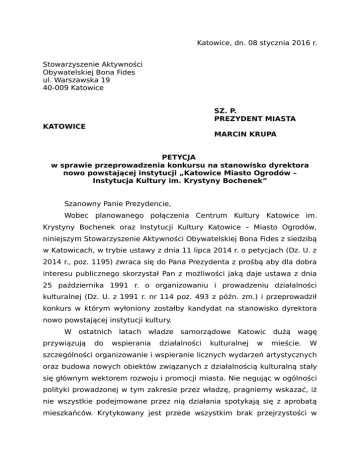 Katowice, dn. 08 stycznia 2016 r. Stowarzyszenie Aktywności Obywatelskiej Bona Fides ul. Warszawska 19 40-009 Katowice SZ. P. PREZYDENT MIASTA KATOWICE MARCIN KRUPA PETYCJA w sprawie przeprowadzenia konkursu na stanowisko dyrektora nowo powstającej instytucji „Katowice Miasto Ogrodów – Instytucja Kultury im. Krystyny Bochenek” Szanowny Panie Prezydencie, Wobec planowanego połączenia Centrum Kultury Katowice im. Krystyny Bochenek oraz Instytucji Kultury Katowice – Miasto Ogrodów, niniejszym Stowarzyszenie Aktywności Obywatelskiej Bona Fides z siedzibą w Katowicach, w trybie ustawy z dnia 11 lipca 2014 r. o petycjach (Dz. U. z 2014 r., poz. 1195) zwraca się do Pana Prezydenta z prośbą aby dla dobra interesu publicznego skorzystał Pan z możliwości jaką daje ustawa z dnia 25 października 1991 r. o organizowaniu i prowadzeniu działalności kulturalnej (Dz. U. z 1991 r. nr 114 poz. 493 z późn. zm.) i przeprowadził konkurs w którym wyłoniony zostałby kandydat na stanowisko dyrektora nowo powstającej instytucji kultury. W ostatnich latach władze samorządowe Katowic dużą wagę przywiązują do wspierania działalności kulturalnej w mieście. W szczególności organizowanie i wspieranie licznych wydarzeń artystycznych oraz budowa nowych obiektów związanych z działalnością kulturalną stały się głównym wektorem rozwoju i promocji miasta. Nie negując w ogólności polityki prowadzonej w tym zakresie przez władzę, pragniemy wskazać, iż nie wszystkie podejmowane przez nią działania spotykają się z aprobatą mieszkańców. Krytykowany jest przede wszystkim brak przejrzystości w sposobie finansowania miejskich instytucji kultury, dysponowania przez nie publicznymi środkami oraz celowość wspierania przez nie określonych inicjatyw. Również wybór osób zarządzających instytucjami kultury budzi spore kontrowersje. Jako, że transparentność i uczciwość życia publicznego stanowi jeden z podstawowych filarów demokratycznego państwa prawa, zwracamy się z niniejszą petycją, aby w interesie publicznym stanowisko dyrektora nowo powstającej instytucji nieprzecenione kultury, znaczenie w która będzie prowadzonej mieć przez z miasto pewnością polityce, obsadzone zostało w drodze otwartego konkursu, który zapewniłby szanse na zaprezentowanie się wielu kandydatom i jednoznacznie przesądziłby o wyborze najlepszego. Naszym zdaniem konkurs przyczyniłby się również do zwiększenia przejrzystości działań władz Katowic jak i poprzez element konkurencji pozwoliłby na starcie się różnych wizji zarządzania tak ważną dla miasta instytucją. Mając na względzie powyższe uwagi i licząc na przychylność Pana Prezydenta, wnosimy jak we wstępie. Jednocześnie Stowarzyszenie Aktywności Obywatelskiej Bona Fides z siedzibą w Katowicach, w trybie art. 4 ust. 3 wskazanej powyżej ustawy o petycjach wyraża zgodę na upublicznienie jego nazwy na stronach internetowych, jako podmiotu wnoszącego niniejszą petycję. Z poważaniem,