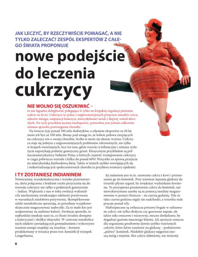 Jak leczyć, by rzeczywiście pomagać, a nie tylko zaleczać? Zespół ekspertów z całego świata proponuje nowe podejście do leczenia cukrzycy Nie wolno się oszukiwać – to nie łagodna dolegliwość polegająca li tylko na kiepskiej regulacji poziomu cukru we krwi. Cukrzyca to jedna z najpoważniejszych przyczyn zawałów serca, udarów mózgu, amputacji kończyn, niewydolności nerek i ślepoty wśród doro słych. Do tych powikłań można niedopuścić, potrzebna jest jednak całkowita zmiana sposobu postrzegania choroby. Na świecie żyje ponad 190 mln diabetyków, a zdaniem ekspertów za 20 lat może ich być aż 330 mln. Biorąc pod uwagę to, że ledwie połowa cierpiących na cukrzycę wie o swojej chorobie, liczba ta może się okazać wyższa. Cukrzy ca staje się jednym z najpoważniejszych problemów zdrowotnych, nie tylko w krajach rozwiniętych, lecz też tam, gdzie rozwój cywilizacyjny i zmiany stylu życia napotykają podatny genetyczny grunt. Klasycznym przykładem są pół nocnoamerykańscy Indianie Pima, u których częstość występowania cukrzycy w ciągu półwiecza wzrosła z kilku do ponad 60%! Wszystko za sprawą przejścia na amerykańską fastfoodową dietę. Także w innych szybko rozwijających się i industrializujących społeczeństwach choroba ta przybiera rozmiary epidemii. I ty zostaniesz Indianinem Nowoczesna, wysokokaloryczna i wysoko przetworzo na, dieta połączona z brakiem ruchu przyczynia się do rozwoju cukrzycy nie tylko u podatnych genetycznie – Indian. Większość z nas w toku ewolucji wykształ ciła mechanizmy zwiększające zdolność przetrwania w warunkach niedoboru pożywienia. Skomplikowane szlaki metaboliczne sprawiają, że potrafimy wyjątkowo skutecznie magazynować nadwyżki. Za to mało kto jest uodporniony na nadmiar kalorii. Ewolucja sprawiła, że najbardziej smakuje nam to, co tłuste (trudno dostępne a kaloryczne) i słodkie (dojrzałe). W centrum metabolicz nych szlaków zawiadujących gromadzeniem i wykorzysty waniem energii znajduje się insulina – hormon produkowany w trzustce przez tzw. komórki β wysepek Langerhansa. Jej zadaniem jest m.in. usuwanie cukru z krwi i przeno szenie go do komórek. Przy wzroście stężenia glukozy do trzustki płynie sygnał, by zwiększyć wydzielanie hormo nu. To przyspiesza przenoszenie cukru do komórek, zaś niewykorzystane zasoby są za pomocą insuliny magazy nowane w postaci tłuszczu – na czarną godzinę. Tyle że taka czarna godzina nigdy nie nadchodzi, a trzustka stale pracuje ponad siły. Niebezpieczne są zwłaszcza potrawy bogate w rafinowa ne cukry: nie tylko słodycze czy gazowane napoje, ale także soki owocowe i warzywne, mocno dosładzane, by dogadzać gustom masowego klienta. Ich spożycie oznacza dla organizmu gwałtowny dowóz szybko trawionych cukrów, które łatwo zamienić na glukozę – podstawowe „paliwo” komórek. Niedobór glukozy najgorzej zno szą mózg i mięśnie. Bez cukru słabniemy, nie możemy się skupić, oblewa nas zimny pot, mięśnie drżą, mamy mroczki przed oczyma, a w skrajnych przypadkach zapa damy w śpiączkę, która może prowadzić nawet do zgonu. Nadmiar glukozy jest równie groźny. Gwałtowny skok jej poziomu może zatruć mózg, doprowadzając do śpiączki. Jeśli takie epizody się powtarzają, dochodzi do uszkodze nia nerek, serca czy siatkówki oka. Błędne koło Im gwałtowniejszy wzrost stężenia cukru we krwi – taki jak np. po zjedzeniu czekoladowego batona czy wypiciu szklanki oranżady – tym większy wyrzut insuliny. Jej zadaniem jest przecież nie dopuścić do tego, by krążąca we krwi glukoza uszkadzała narządy wewnętrzne. Jeśli jednak trzustka musi sprostać takim wyzwaniom kilka krotnie w ciągu dnia, dochodzi do rozchwiania równo wagi. Gdy wzrośnie poziom cukru, insuliny wydziela się „trochę” za dużo. Jego stężenie spada zatem nieco zbyt szybko i zbyt gwałtownie. Niedobór glukozy we krwi jest zaś jednym z istotnych czynników uruchamiających uczucie głodu. Zjadamy zatem coś, co ma podnieść jej poziom. Dobrze, jeśli jest to jajko czy kromka chleba. Jeśli jednak czekoladowy batonik – do trzustki znowu płynie nadmiernie silny sygnał, insuliny wydziela się zbyt dużo i cały schemat się powtarza. Tak wyglądają początki po nad 90% przypadków cukrzycy spotykanych na świecie. A koniec? Trzeba jasno powiedzieć, że cukrzyca to nie przelewki. W krajach rozwiniętych już dziś jest na czwar tym, piątym miejscu wśród przyczyn zgonów, i coraz bardziej obciąża budżety służby zdrowia. Dwie różne choroby Tylko co dziesiąty diabetyk cierpi na tzw. cukrzycę typu I, zwaną też insulinozależną. W tej chorobie z niepo znanych do końca przyczyn organizm zaczyna trakto wać komórki β trzustki niczym ciało obce i niszczyć je. Wskutek tego wydzielanie insuliny stopniowo spada i w ciągu kilkunastu lat organizm przestaje ją wytwarzać. By uchronić chorego przed śmiercią, trzeba stale dostarczać ten hormon z zewnątrz. Do niedawna jedynym sposobem były zastrzyki. Obecnie w użyciu są też pompy insulinowe, testuje się zaś m.in. insulinę w aerozolu (donosową lub doustną) i tzw. zbiorniki depot, z których może być uwalniana w zależności od zapotrzebowania przez kilka miesięcy. Ostatecznym rozwiązaniem problemu cukrzycy typu I byłoby odtworzenie produkujących insulinę komórek. Próbuje się to robić przy użyciu komórek macierzystych albo przeszczepiając zawiesinę komórek β z trzustek osób zmarłych. Ponad 90% cukrzyków choruje jednak z zupełnie innego powodu. Ich trzustki świetnie sobie radzą z wytwarzaniem insuliny. Tyle że wymagania właści cieli są zbyt wygórowane. Produkcja nie może nadążyć za zapotrzebowaniem. Powtarzające się wahania stężeń glukozy i insuliny sprawiają, że tkanki zaczynają się uod parniać na działanie hormonu. Trochę tak, jakby komórki zaczynały „głuchnąć” na pukanie in
