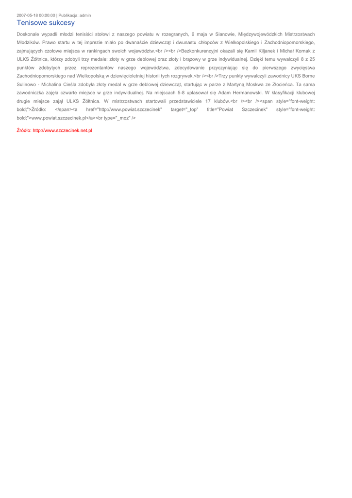 2007-05-18 00:00:00 | Publikacja: admin Tenisowe sukcesy Doskonale wypadli młodzi tenisiści stołowi z naszego powiatu w rozegranych, 6 maja w Sianowie, Międzywojewódzkich Mistrzostwach Młodzików. Prawo startu w tej imprezie miało po dwanaście dziewcząt i dwunastu chłopców z Wielkopolskiego i Zachodniopomorskiego, zajmujących czołowe miejsca w rankingach swoich województw.<br /><br />Bezkonkurencyjni okazali się Kamil Kiljanek i Michał Kornak z ULKS Żółtnica, którzy zdobyli trzy medale: złoty w grze deblowej oraz złoty i brązowy w grze indywidualnej. Dzięki temu wywalczyli 8 z 25 punktów zdobytych przez reprezentantów naszego województwa, zdecydowanie przyczyniając się do pierwszego zwycięstwa Zachodniopomorskiego nad Wielkopolską w dziewięcioletniej historii tych rozgrywek.<br /><br />Trzy punkty wywalczyli zawodnicy UKS Borne Sulinowo - Michalina Cieśla zdobyła złoty medal w grze deblowej dziewcząt, startując w parze z Martyną Moskwa ze Złocieńca. Ta sama zawodniczka zajęła czwarte miejsce w grze indywidualnej. Na miejscach 5-8 uplasował się Adam Hermanowski. W klasyfikacji klubowej drugie miejsce zajął ULKS Żółtnica. W mistrzostwach startowali przedstawiciele 17 klubów.<br /><br /><span style="font-weight: bold;">Źródło: </span><a href="http://www.powiat.szczecinek" bold;">www.powiat.szczecinek.pl</a><br type="_moz" /> Źródło: http://www.szczecinek.net.pl target="_top" title="Powiat Szczecinek" style="font-weight: