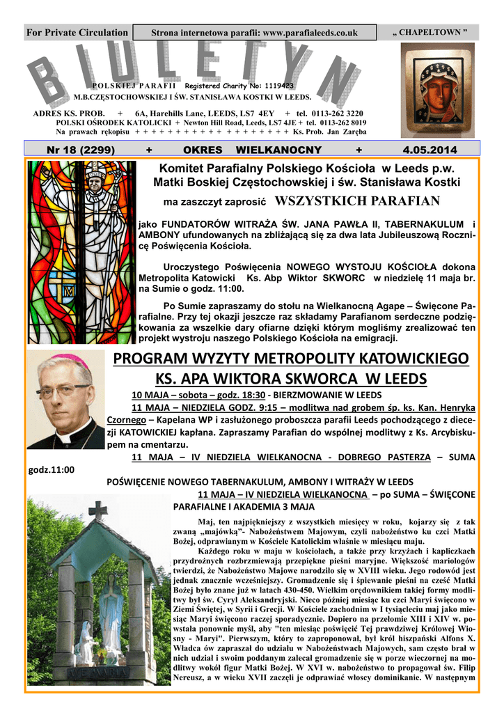 For Private Circulation Strona internetowa parafii: www.parafialeeds.co.uk P O L SK I E J P A R A F I I „ CHAPELTOWN ” Registered Charity No: 1119423 M.B.CZĘSTOCHOWSKIEJ I ŚW. STANISŁAWA KOSTKI W LEEDS. ADRES KS. PROB. + 6A, Harehills Lane, LEEDS, LS7 4EY + tel. 0113-262 3220 POLSKI OŚRODEK KATOLICKI + Newton Hill Road, Leeds, LS7 4JE + tel. 0113-262 8019 Na prawach rękopisu + + + + + + + + + + + + + + + + + + + Ks. Prob. Jan Zaręba Nr 18 (2299) + OKRES WIELKANOCNY + 4.05.2014 Komitet Parafialny Polskiego Kościoła w Leeds p.w. Matki Boskiej Częstochowskiej i św. Stanisława Kostki ma zaszczyt zaprosić WSZYSTKICH PARAFIAN jako FUNDATORÓW WITRAŻA ŚW. JANA PAWŁA II, TABERNAKULUM i AMBONY ufundowanych na zbliżającą się za dwa lata Jubileuszową Rocznicę Poświęcenia Kościoła. Uroczystego Poświęcenia NOWEGO WYSTOJU KOŚCIOŁA dokona Metropolita Katowicki Ks. Abp Wiktor SKWORC w niedzielę 11 maja br. na Sumie o godz. 11:00. Po Sumie zapraszamy do stołu na Wielkanocną Agape – Święcone Parafialne. Przy tej okazji jeszcze raz składamy Parafianom serdeczne podziękowania za wszelkie dary ofiarne dzięki którym mogliśmy zrealizować ten projekt wystroju naszego Polskiego Kościoła na emigracji. PROGRAM WYZYTY METROPOLITY KATOWICKIEGO KS. APA WIKTORA SKWORCA W LEEDS 10 MAJA – sobota – godz. 18:30 - BIERZMOWANIE W LEEDS 11 MAJA – NIEDZIELA GODZ. 9:15 – modlitwa nad grobem śp. ks. Kan. Henryka Czornego – Kapelana WP i zasłużonego proboszcza parafii Leeds pochodzącego z diecezji KATOWICKIEJ kapłana. Zapraszamy Parafian do wspólnej modlitwy z Ks. Arcybiskupem na cmentarzu. 11 MAJA – IV NIEDZIELA WIELKANOCNA - DOBREGO PASTERZA – SUMA godz.11:00 POŚWIĘCENIE NOWEGO TABERNAKULUM, AMBONY I WITRAŻY W LEEDS 11 MAJA – IV NIEDZIELA WIELKANOCNA – po SUMA – ŚWIĘCONE PARAFIALNE I AKADEMIA 3 MAJA Maj, ten najpiękniejszy z wszystkich miesięcy w roku, kojarzy się z tak zwaną „majówką”- Nabożeństwem Majowym, czyli nabożeństwo ku czci Matki Bożej, odprawianym w Kościele Katolickim właśnie w miesiącu maju. Każdego roku w maju w kościołach, a także przy krzyżach i kapliczkach przydrożnych rozbrzmiewają przepiękne pieśni maryjne. Większość mariologów twierdzi, że Nabożeństwo Majowe narodziło się w XVIII wieku. Jego rodowód jest jednak znacznie wcześniejszy. Gromadzenie się i śpiewanie pieśni na cześć Matki Bożej było znane już w latach 430-450. Wielkim orędownikiem takiej formy modlitwy był św. Cyryl Aleksandryjski. Nieco później miesiąc ku czci Maryi święcono w Ziemi Świętej, w Syrii i Grecji. W Kościele zachodnim w I tysiącleciu maj jako miesiąc Maryi święcono raczej sporadycznie. Dopiero na przełomie XIII i XIV w. powstała ponownie myśl, aby "ten miesiąc poświęcić Tej prawdziwej Królowej Wiosny - Maryi". Pierwszym, który to zaproponował, był król hiszpański Alfons X. Władca ów zapraszał do udziału w Nabożeństwach Majowych, sam często brał w nich udział i swoim poddanym zalecał gromadzenie się w porze wieczornej na modlitwy wokół figur Matki Bożej. W XVI w. nabożeństwo to propagował św. Filip Nereusz, a w wieku XVII zaczęli je odprawiać włoscy dominikanie. W następnym PORZĄDEK MSZY ŚWIĘTYCH I NABOŻEŃSTW NIEDZIELA, 4 MAJA 2014; 3 WIELKANOCNA; 9:30 – Do Miłosierdzia Bożego z podziękowaniem za otrzymane łaski i prośbą o dalsze Błogosławieństwo Boże oraz potrzebne łaski i zdrowie dla małżonków Jarosława i Pauliny Grzechynka z okazji rocznicy Ślubu (int. z 22.03.br.) 10.30 – NABOŻEŃSTWO MAJOWE 11:00 – Do Bożej Opatrzności z wstawiennictwem Królowej Polski w intencji Ojczyzny Polski i wszystkich Polaków żyjących na emigracji z prośbą o Błogosławieństwo Boże i zdrowie dla Członków Koła Żywego Różańca i Ich rodzin oraz za zmarłych członków KŻR w Leeds 11:00 – CHRZEST - Patrick MIAZEK 11:00 – CHRZEST - Leo Gabriel MASLLARICA Harrogate 16:30 – Za śp. dziadków + Stefana i + Szymona oraz + Marię i + Bolesława - dar intencji od rodziny pp. Player 19.00 – Do Miłosierdzia Bożego z podziękowaniem za otrzymane łaski i prośbą o Boże Błogosławieństwo, potrzebne łaski i zdrowie dla małżonków i Joanny i Marcina Siczek w 15. rocznicę Ślubu dla Ich dzieci Natalii, Krystiana i rodziny w Polsce PONIEDZIAŁEK, 5 MAJA 2014; Dzień powszedni; 10:00 – Do Chrystusa Zmartwychwstałego z prośbą o Błogosławieństwo Boże i zdrowie dla mamusi Janiny Jagielskiej - dar intencji syna Waldemara 10:30 – NABOŻEŃSTWO MAJOWE WTOREK, 6 MAJA 2014; Święto św. apostołów Filipa i Jakuba; 10:00 – Za śp. siostrę + Krystynę Stanisławczuk w rocznicę śmierci - dar intencji od brata Marcina z rodziną 10:30 – NABOŻEŃSTWO MAJOWE ŚRODA, 7 MAJA 2014; Dzień powszedni; 10:30 – NABOŻEŃSTWO MAJOWE 11:00 – Za śp. męża + Jana Płygawko, rodziców + Sabinę i + Michała Leszczyńskich, oraz + Jana i + Julię Płygawko, szwagra Wiktora - dar int. p. Płygawko z rodziną CZWARTEK, 8 MAJA 2014; UROCZYSTOŚĆ ŚW. STANISŁAWA, BPA - PATRONA POLSKI; 10:00 – Do Chrystusa Zmartwychwstałego z prośbą o Błogosławieństwo Boże i zdrowie dla Ks. Prałata Józefa Matysika - dar intencji od pp. Filarowskich 19:00 – Za śp. dziadka + Stanisława Adamka w 1. rocznicę śmierci - dar intencji od wnuczki Elizy z mężem Szymonem 19:30 – NABOŻEŃSTWO MAJOWE PIĄTEK, 9 MAJA 2014; Dzień powszzedni; 10:00 – Do Bożej Opatrzności z prośbą o Błogosławieństwo Boże, potrzebne łaski i zdrowie dla dzieci i wnuków - dar intencji od pp. Marii i Józefa Filarowskich 10:30 – NABOŻEŃSTWO MAJOWE 19:00 – - - - - - - - - - - - - - nie ma Mszy Świętej - - - - - - - - - - - - - - 19:00 – NABOŻEŃSTWO DO DUCHA ŚWIĘTEGO DLA BIERZMOWAŃCÓW SOBOTA, 10 MAJA; Dzień powszedni; 8:30 – Do Bożej Opatrzności z podziękowaniem za otrzymane łaski i prośbą o Boże Błogosławieństwo dla małżonków Norber
