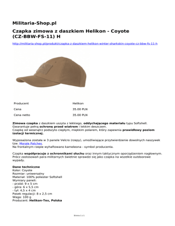 Militaria-Shop.pl Czapka zimowa z daszkiem Helikon - Coyote (CZ-BBW-FS-11) H http://militaria-shop.pl/produkt/czapka-z-daszkiem-helikon-winter-sharkskin-coyote-cz-bbw-fs-11-h Producent Helikon Cena 35.00 PLN Cena netto 35.00 PLN Zimowa czapka z daszkiem uszyta z lekkiego, oddychającego materiału typu Softshell. Gwarantuje pełną ochronę przed wiatrem i lekkim deszczem. Czapkę od wewnątrz podszyto ciepłym, miękkim polarem, który zapewnia prawidłowy poziom izolacji termicznej. Wyposażona została w 3 panele Velcro (rzepy), umożliwiające przytwierdzenie dowolnych naszywek tzw. Morale Patches. Na frontalnym rzepie wyhaftowano kameleona - symbol producenta. Czapka współpracuje z ochronnikami słuchu oraz innym taktycznym oporządzeniem nagłownym. Prócz zastosowań para-militarnych świetnie sprawdzi się jako czapka na wszelkie outdoorowe wypady. Dane techniczne Kolor: Coyote Rozmiar: uniwersalny Materiał: 100% poliester Softshell Wymiary paneli: - przód: 9 x 5 cm - góra: 6 x 5,5 cm - tył: 4,5 x 4 cm Pasek regulacji: 8 x 2,5 cm Waga: 100 g Producent: Helikon-Tex, Polska Strona 1 z 1