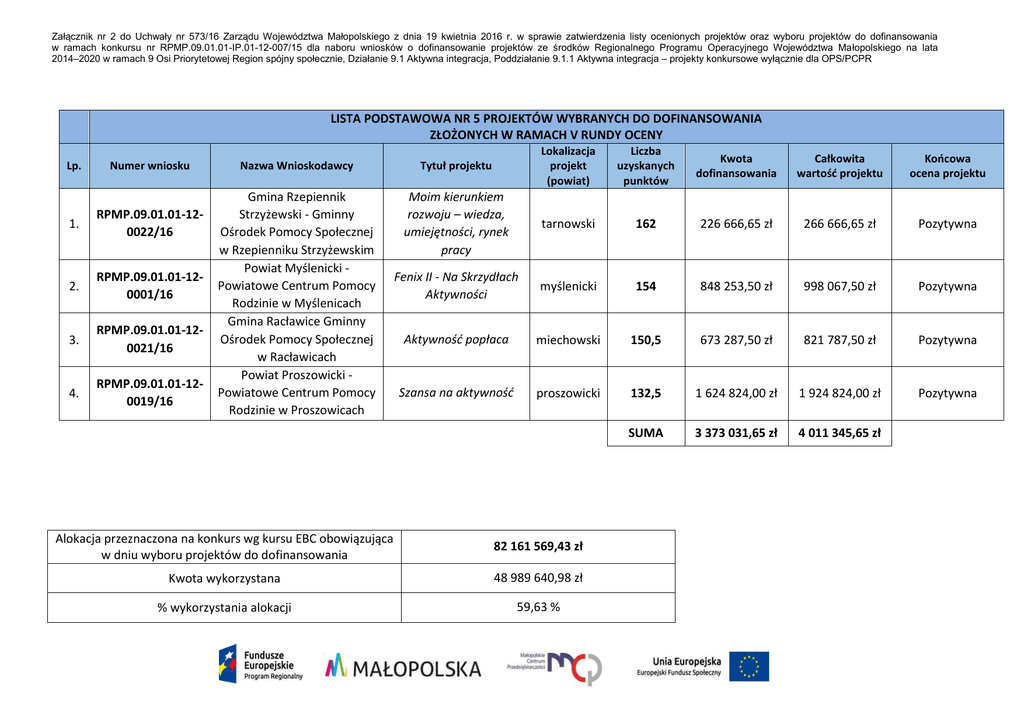 Załącznik nr 2 do Uchwały nr 573/16 Zarządu Województwa Małopolskiego z dnia 19 kwietnia 2016 r. w sprawie zatwierdzenia listy ocenionych projektów oraz wyboru projektów do dofinansowania w ramach konkursu nr RPMP.09.01.01-IP.01-12-007/15 dla naboru wniosków o dofinansowanie projektów ze środków Regionalnego Programu Operacyjnego Województwa Małopolskiego na lata 2014–2020 w ramach 9 Osi Priorytetowej Region spójny społecznie, Działanie 9.1 Aktywna integracja, Poddziałanie 9.1.1 Aktywna integracja – projekty konkursowe wyłącznie dla OPS/PCPR LISTA PODSTAWOWA NR 5 PROJEKTÓW WYBRANYCH DO DOFINANSOWANIA ZŁOŻONYCH W RAMACH V RUNDY OCENY Lp. Numer wniosku 1. RPMP.09.01.01-120022/16 2. RPMP.09.01.01-120001/16 3. RPMP.09.01.01-120021/16 4. RPMP.09.01.01-120019/16 Nazwa Wnioskodawcy Tytuł projektu Lokalizacja projekt (powiat) Liczba uzyskanych punktów Kwota dofinansowania Całkowita wartość projektu Końcowa ocena projektu Gmina Rzepiennik Strzyżewski - Gminny Ośrodek Pomocy Społecznej w Rzepienniku Strzyżewskim Powiat Myślenicki Powiatowe Centrum Pomocy Rodzinie w Myślenicach Gmina Racławice Gminny Ośrodek Pomocy Społecznej w Racławicach Powiat Proszowicki Powiatowe Centrum Pomocy Rodzinie w Proszowicach Moim kierunkiem rozwoju – wiedza, umiejętności, rynek pracy tarnowski 162 226 666,65 zł 266 666,65 zł Pozytywna Fenix II - Na Skrzydłach Aktywności myślenicki 154 848 253,50 zł 998 067,50 zł Pozytywna Aktywność popłaca miechowski 150,5 673 287,50 zł 821 787,50 zł Pozytywna Szansa na aktywność proszowicki 132,5 1 624 824,00 zł 1 924 824,00 zł Pozytywna SUMA 3 373 031,65 zł 4 011 345,65 zł Alokacja przeznaczona na konkurs wg kursu EBC obowiązująca w dniu wyboru projektów do dofinansowania 82 161 569,43 zł Kwota wykorzystana 48 989 640,98 zł % wykorzystania alokacji 59,63 %