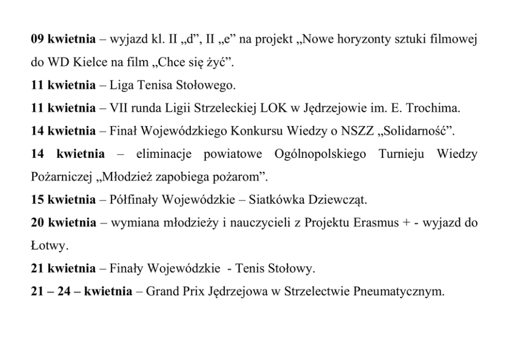 09 kwietnia – wyjazd kl. II „d”, II „e” na projekt „Nowe horyzonty sztuki filmowej do WD Kielce na film „Chce się żyć”. 11 kwietnia – Liga Tenisa Stołowego. 11 kwietnia – VII runda Ligii Strzeleckiej LOK w Jędrzejowie im. E. Trochima. 14 kwietnia – Finał Wojewódzkiego Konkursu Wiedzy o NSZZ „Solidarność”. 14 kwietnia – eliminacje powiatowe Ogólnopolskiego Turnieju Wiedzy Pożarniczej „Młodzież zapobiega pożarom”. 15 kwietnia – Półfinały Wojewódzkie – Siatkówka Dziewcząt. 20 kwietnia – wymiana młodzieży i nauczycieli z Projektu Erasmus + - wyjazd do Łotwy. 21 kwietnia – Finały Wojewódzkie - Tenis Stołowy. 21 – 24 – kwietnia – Grand Prix Jędrzejowa w Strzelectwie Pneumatycznym. 23 kwietnia – warsztaty dla kl. II „e” poświęcone edukacji prawnej, prowadzone przez studentów Uczelni Łazarskiego w Warszawie. 24 kwietnia – Konkurs Piosenki w Języku Obcym – Starachowice. 25 kwietnia - VIII runda Ligii Strzeleckiej LOK w Jędrzejowie im. E. Trochima. 27 kwietnia – Finał VI Wojewódzkiego Konkursu Literackiego „ Moje fascynacje twórczością W. Szymborskiej”. Zaproszenie pracownika ZUS – u na zajęcia z podstaw przedsiębiorczości. Wybory Młodzieżowe na Prezydenta RP. Półfinały Wojewódzkie – Koszykówka Chłopców. Akcje Promujące Zdrowy Styl Życia. Realizacja Programu „Kodeks walki z rakiem”.