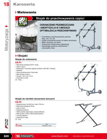18 Karoseria u Malowanie Stojak do przechowywania części Motoryzacja OGRANICZENIE PRZEMIESZCZANIA I AMORTYZACJA W 3 MIESIĄCE OPTYMALIZACJA PRZECHOWYWANIA • U możliwia przechowywanie pokryw, klap, kół, rur, itd. • Łatwe przemieszczanie (4 kółka obrotowe). • Małe rozmiary na ziemi. • Gwarancja skutecznej organizacji. • Zapobiega gubieniu elementów i oszczędza czas. u u Stojaki Stojak do malowania CR.P1 • Maksymalne obciążenie CR.P1: 50 kg. • Łatwy w użyciu. • Modułowość: 16 punktów regulacji wysokości, obrót 360° z blokadą. • Solidność. • Łatwe przemieszczanie (2 duże koła). • Małe rozmiary na ziemi. • Wymiary: 130 x 120 x 70 cm. • Gwarancja na 3 lata. D : 19 kg. Stojak do obróbki elementów karoserii CR.P2 • Wysokość pracy: mini 800 mm i maks 1100 mm. • Maksymalne obciążenie: 80 kg. • Łatwy w użyciu. • Regulacja wysokości. • Solidny produkt zapewniający wysoką stabilność. • Małe wymiary na ziemi, łatwe przechowywanie. • 3 punkty podparcia. • Gwarancja na 3 lata. D : 8 kg. F CR.S7PRO 820 Opis Podkładka z pianki www.facom.com plik pobrano z www.imbth.com.pl