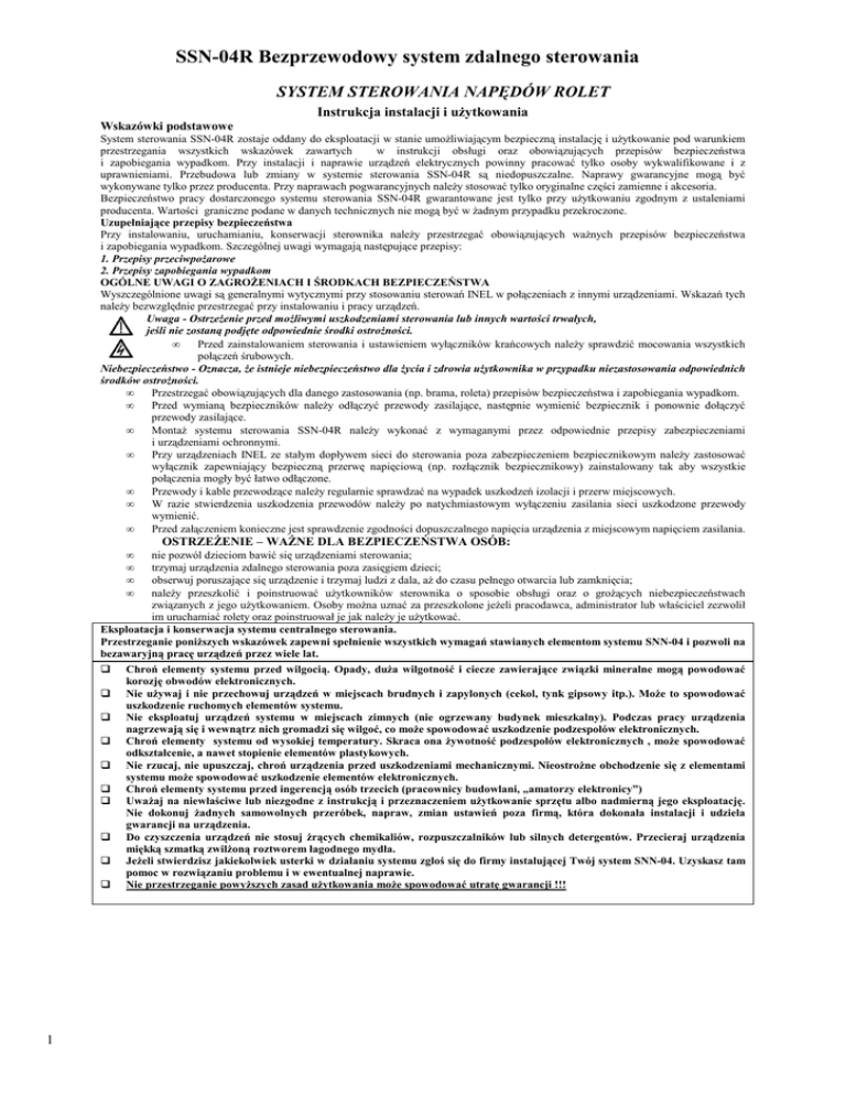 SSN-04R Bezprzewodowy system zdalnego sterowania SYSTEM STEROWANIA NAPĘDÓW ROLET Instrukcja instalacji i użytkowania Wskazówki podstawowe System sterowania SSN-04R zostaje oddany do eksploatacji w stanie umożliwiającym bezpieczną instalację i użytkowanie pod warunkiem przestrzegania wszystkich wskazówek zawartych w instrukcji obsługi oraz obowiązujących przepisów bezpieczeństwa i zapobiegania wypadkom. Przy instalacji i naprawie urządzeń elektrycznych powinny pracować tylko osoby wykwalifikowane i z uprawnieniami. Przebudowa lub zmiany w systemie sterowania SSN-04R są niedopuszczalne. Naprawy gwarancyjne mogą być wykonywane tylko przez producenta. Przy naprawach pogwarancyjnych należy stosować tylko oryginalne części zamienne i akcesoria. Bezpieczeństwo pracy dostarczonego systemu sterowania SSN-04R gwarantowane jest tylko przy użytkowaniu zgodnym z ustaleniami producenta. Wartości graniczne podane w danych technicznych nie mogą być w żadnym przypadku przekroczone. Uzupełniające przepisy bezpieczeństwa Przy instalowaniu, uruchamianiu, konserwacji sterownika należy przestrzegać obowiązujących ważnych przepisów bezpieczeństwa i zapobiegania wypadkom. Szczególnej uwagi wymagają następujące przepisy: 1. Przepisy przeciwpożarowe 2. Przepisy zapobiegania wypadkom OGÓLNE UWAGI O ZAGROŻENIACH I ŚRODKACH BEZPIECZEŃSTWA Wyszczególnione uwagi są generalnymi wytycznymi przy stosowaniu sterowań INEL w połączeniach z innymi urządzeniami. Wskazań tych należy bezwzględnie przestrzegać przy instalowaniu i pracy urządzeń. Uwaga - Ostrzeżenie przed możliwymi uszkodzeniami sterowania lub innych wartości trwałych, jeśli nie zostaną podjęte odpowiednie środki ostrożności. • Przed zainstalowaniem sterowania i ustawieniem wyłączników krańcowych należy sprawdzić mocowania wszystkich połączeń śrubowych. Niebezpieczeństwo - Oznacza, że istnieje niebezpieczeństwo dla życia i zdrowia użytkownika w przypadku niezastosowania odpowiednich środków ostrożności. • Przestrzegać obowiązujących dla danego zastosowania (np. brama, roleta) przepisów bezpieczeństwa i zapobiegania wypadkom. • Przed wymianą bezpieczników należy odłączyć przewody zasilające, następnie wymienić bezpiecznik i ponownie dołączyć przewody zasilające. • Montaż systemu sterowania SSN-04R należy wykonać z wymaganymi przez odpowiednie przepisy zabezpieczeniami i urządzeniami ochronnymi. • Przy urządzeniach INEL ze stałym dopływem sieci do sterowania poza zabezpieczeniem bezpiecznikowym należy zastosować wyłącznik zapewniający bezpieczną przerwę napięciową (np. rozłącznik bezpiecznikowy) zainstalowany tak aby wszystkie połączenia mogły być łatwo odłączone. • Przewody i kable przewodzące należy regularnie sprawdzać na wypadek uszkodzeń izolacji i przerw miejscowych. • W razie stwierdzenia uszkodzenia przewodów należy po natychmiastowym wyłączeniu zasilania sieci uszkodzone przewody wymienić. • Przed załączeniem konieczne jest sprawdzenie zgodności dopuszczalnego napięcia urządzenia z miejscowym napięciem zasilania. • • • • OSTRZEŻENIE – WAŻNE DLA BEZPIECZEŃSTWA OSÓB: nie pozwól dzieciom bawić się urządzeniami sterowania; trzymaj urządzenia zdalnego sterowania poza zasięgiem dzieci; obserwuj poruszające się urządzenie i trzymaj ludzi z dala, aż do czasu pełnego otwarcia lub zamknięcia; należy przeszkolić i poinstruować użytkowników sterownika o sposobie obsługi oraz o grożących niebezpieczeństwach związanych z jego użytkowaniem. Osoby można uznać za przeszkolone jeżeli pracodawca, administrator lub właściciel zezwolił im uruchamiać rolety oraz poinstruował je jak należy je użytkować. Eksploatacja i konserwacja systemu centralnego sterowania. Przestrzeganie poniższych wskazówek zapewni spełnienie wszystkich wymagań stawianych elementom systemu SNN-04 i pozwoli na bezawaryjną pracę urządzeń przez wiele lat. 1 Chroń elementy systemu przed wilgocią. Opady, duża wilgotność i ciecze zawierające związki mineralne mogą powodować korozję obwodów elektronicznych. Nie używaj i nie przechowuj urządzeń w miejscach brudnych i zapylonych (cekol, tynk gipsowy itp.). Może to spowodować uszkodzenie ruchomych elementów systemu. Nie eksploatuj urządzeń systemu w miejscach zimnych (nie ogrzewany budynek mieszkalny). Podczas pracy urządzenia nagrzewają się i wewnątrz nich gromadzi się wilgoć, co może spowodować uszkodzenie podzespołów elektronicznych. Chroń elementy systemu od wysokiej temperatury. Skraca ona żywotność podzespołów elektronicznych , może spowodować odkształcenie, a nawet stopienie elementów plastykowych. Nie rzucaj, nie upuszczaj, chroń urządzenia przed uszkodzeniami mechanicznymi. Nieostrożne obchodzenie się z elementami systemu może spowodować uszkodzenie elementów elektronicznych. Chroń elementy systemu przed ingerencją osób trzecich (pracownicy budowlani, „amatorzy elektronicy”) Uważaj na niewłaściwe lub niezgodne z instrukcją i przeznaczeniem użytkowanie sprzętu albo nadmierną jego eksploatację. Nie dokonuj żadnych samowolnych przeróbek, napraw, zmian ustawień poza firmą, która dokonała instalacji i udziela gwarancji na urządzenia. Do czyszczenia urządzeń nie stosuj żrących chemikaliów, rozpuszczalników lub silnych detergentów. Przecieraj urządzenia miękką szmatką zwilżoną roztworem łagodnego mydła. Jeżeli stwierdzisz jakiekolwiek usterki w działaniu systemu zgłoś się do firmy instalującej Twój system SNN-04. Uzyskasz tam pomoc w rozwiązaniu problemu i w ewentualnej naprawie. Nie przestrzeganie powyższych zasad użytkowania może spowodować utratę gwarancji !!! SSN-04R Bezprzewodowy system zdalnego sterowania System radiowy umożliwia zdalną, kompleksową obsługę dowolnej ilości rolet w dowolnym obiekcie. System budowany jest ze sterowników i pil