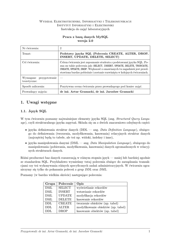 CREATE, UPDATE, DROP. Większość z omawianych tu zagadnień jest przedstawiona bardzo pobieżnie i zostanie rozwinięta w kolejnych ćwiczeniach.