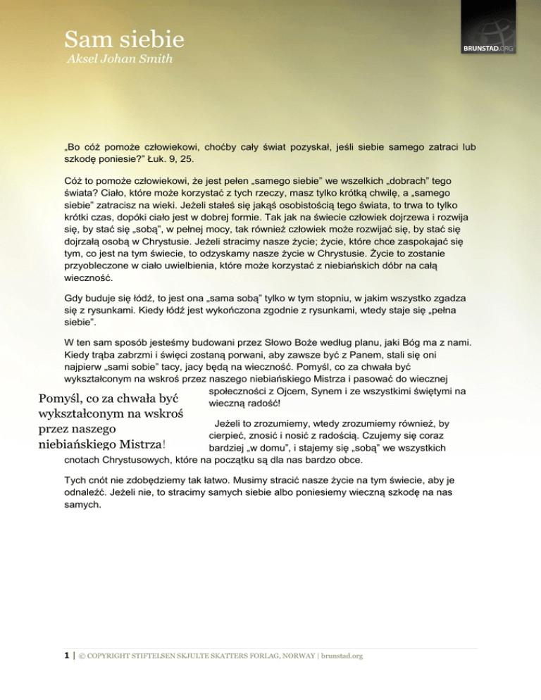 Sam siebie Aksel Johan Smith „Bo cóż pomoże człowiekowi, choćby cały świat pozyskał, jeśli siebie samego zatraci lub szkodę poniesie?” Łuk. 9, 25. Cóż to pomoże człowiekowi, że jest pełen „samego siebie” we wszelkich „dobrach” tego świata? Ciało, które może korzystać z tych rzeczy, masz tylko krótką chwilę, a „samego siebie” zatracisz na wieki. Jeżeli stałeś się jakąś osobistością tego świata, to trwa to tylko krótki czas, dopóki ciało jest w dobrej formie. Tak jak na świecie człowiek dojrzewa i rozwija się, by stać się „sobą”, w pełnej mocy, tak również człowiek może rozwijać się, by stać się dojrzałą osobą w Chrystusie. Jeżeli stracimy nasze życie; życie, które chce zaspokajać się tym, co jest na tym świecie, to odzyskamy nasze życie w Chrystusie. Życie to zostanie przyobleczone w ciało uwielbienia, które może korzystać z niebiańskich dóbr na całą wieczność. Gdy buduje się łódź, to jest ona „sama sobą” tylko w tym stopniu, w jakim wszystko zgadza się z rysunkami. Kiedy łódź jest wykończona zgodnie z rysunkami, wtedy staje się „pełna siebie”. W ten sam sposób jesteśmy budowani przez Słowo Boże według planu, jaki Bóg ma z nami. Kiedy trąba zabrzmi i święci zostaną porwani, aby zawsze być z Panem, stali się oni najpierw „sami sobie” tacy, jacy będą na wieczność. Pomyśl, co za chwała być wykształconym na wskroś przez naszego niebiańskiego Mistrza i pasować do wiecznej społeczności z Ojcem, Synem i ze wszystkimi świętymi na Pomyśl, co za chwała być wieczną radość! wykształconym na wskroś przez naszego niebiańskiego Mistrza! Jeżeli to zrozumiemy, wtedy zrozumiemy również, by cierpieć, znosić i nosić z radością. Czujemy się coraz bardziej „w domu”, i stajemy się „sobą” we wszystkich cnotach Chrystusowych, które na początku są dla nas bardzo obce. Tych cnót nie zdobędziemy tak łatwo. Musimy stracić nasze życie na tym świecie, aby je odnaleźć. Jeżeli nie, to stracimy samych siebie albo poniesiemy wieczną szkodę na nas samych. 1 | © COPYRIGHT STIFTELSEN SKJULTE SKATTERS FORLAG, NORWAY | brunstad.org