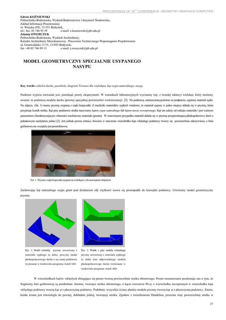 PROCEEDINGS OF 19TH CONFERENCE GEOMETRY GRAPHICS COMPUTER Edwin KOŹNIEWSKI Politechnika Białostocka, Wydział Budownictwa i Inżynierii Środowiska, Zakład Informacji Przestrzennej ul. Wiejska 45E, 15-351 Białystok, tel./ fax: 85 746 95 59 e-mail: [email protected] Jolanta OWERCZUK Politechnika Białostocka, Wydział Architektury, Katedra Architektury Mieszkaniowej - Pracownia Technicznego Wspomagania Projektowania ul. Grunwaldzka 11/15, 15-893 Białystok, fax +48 85 746 99 13 e-mail: [email protected] MODEL GEOMETRYCZNY SPECJALNIE USYPANEGO NASYPU Key words: szkielet dachu, parabola, diagram Voronoi dla wielokąta, kąt zsypu naturalnego, nasyp Punktem wyjścia rozważań jest, poniekąd, prosty eksperyment. W warunkach laboratoryjnych wycinamy (np. z twardej tektury) wielokąt, który możemy uważać za podstawę modelu dachu (pewnej specjalnej powierzchni wielościennej) [2]. Na podstawę, umieszczoną poziomo na podparciu, sypiemy materiał sypki. Na zdjęciu (fot. 1) mamy pryzmę usypaną z mąki krupczatki. Z mechniki materiałów sypkich wiadomo, że materiał sypany w jedno miejsce układa się w pryzmę, która przyjmuje kształt stożka. Kąt przy podstawie stożka nazywamy kątem zsypu naturalnego lub kątem tarcia wewnętrznego. Kąt ten zależy od rodzaju materiału i jest ważnym parametrem charakteryzujacym własności mechniczne materiału (gruntu). W omawianym przypadku materiał układa się w pryzmę przypominajacą płaskopołaciowy dach o jednakowym nachyleniu połaci [2]. Jest jednak pewna różnica, bowiem w otoczeniu wierzchołka kąta wklęsłego podstawy tworzy się powierzchnia zakrzywiona, a linia grzbietowa nie wszędzie jest prostoliniowa. Fot. 1: Pryzma z mąki krupczatki usypana na wielokącie z dwoma kątami wklęsłymi Zachowując kąt naturalnego zsypu grunt pod działaniem siły ciężkości zsuwa się prostopadle do krawędzi podstawy. Utwórzmy model geometryczny pryzmy. Rys. 1: Model wirtualny pryzmy utworzonej z Rys. 2: Widok z góry modelu wirtualnego materiału sypkiego (u dołu), powyżej model pryzmy utworzonej z materiału sypkiego płaskopołaciowego dachu o tej samej podstawie (u dołu) oraz odpowiedniego modelu (wykonane w środowisku programu AutoCAD) płaskopołaciowego dachu (wykonane w środowisku programu AutoCAD) W wierzchołkach kątów wklęsłych zbiegające się proste tworzą powierzchnie stożka obrotowego. Proste rozumowanie przekonuje nas o tym, że fragmenty linii grzbietowej są parabolami. Istotnie, tworzące stożka obrotowego, o kącie rozwarcia 90-ϕ, o wierzchołku zaczepionym w wierzchołku kąta wklęsłego podstawy tworzą kąt ϕ z płaszczyzną podstawy. Podobnie, wszystkie ściany płaskie modelu pryzmy tworzą kąt ϕ z płaszczyzną podstawy. Zatem, każda ściana jest równoległa do pewnej, dokładnie jednej, tworzącej stożka. Zgodnie z twierdzeniem Dandelina, przecina więc powierzchnię stożka w 27 PROCEEDINGS OF 19TH CONFERENCE GEOMETRY GRAPHICS COMPUTER paraboli lub (jeśli ściana przechodzi przez wierzchołek) w jednej prostej. Na rysunkach 1 i 2 mamy, wykonane w środowisku CAD, modele geometryczne pryzmy materiału sypkiego otrzymanej w przeprowadzonym doświadczeniu. Rys. 3: Szkielet dachu i diagram Voronoja: a) rzut prostokątny dachu; b) przekształcenie dachu w diagram Voronoja dla wielokąta; c) zaznaczone części parabol w rzucie szkieletu; d) diagram Voronoja dla wielokąta podstawy z zakreskowanymi obszarami o brzegu krzywoliniowym Rzuty prostokątne modelu dachu i modelu pryzmy materiału sypkiego tworzą znane w literaturze obiekty geometryczne: tzw. prosty szkielet (szkielet dachu lub krótko dach) oraz diagram Voronoja dla wielokąta [1, 2]. References: [1] [2] 28 Aichholzer O. i in.: A Novel Type of Skeleton for Polygons. Journal of Universal Computer Science, Vol. 1, No. 12, 1995, 752-761. Koźniewski E.: Geometria dachów. Teoria i zastosowanie. Wydawnictwo Politechniki Białostockiej, Białystok 2007.