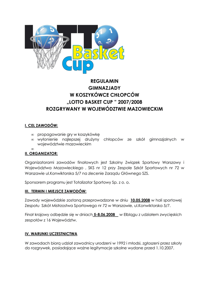 REGULAMIN GIMNAZJADY W KOSZYKÓWCE CHŁOPCÓW „LOTTO BASKET CUP ” 2007/2008 ROZGRYWANY W WOJEWÓDZTWIE MAZOWIECKIM I. CEL ZAWODÓW: • • propagowanie gry w koszykówkę wyłonienie najlepszej druŜyny chłopców województwie mazowieckim ze szkół gimnazjalnych w • II. ORGANIZATOR: Organizatorami zawodów finałowych jest Szkolny Związek Sportowy Warszawy i Województwa Mazowieckiego , SKS nr 12 przy Zespole Szkół Sportowych nr 72 w Warszawie ul.Konwiktorska 5/7 na zlecenie Zarządu Głównego SZS. Sponsorem programu jest Totalizator Sportowy Sp. z o. o. III. TERMIN I MIEJSCE ZAWODÓW: Zawody wojewódzkie zostaną przeprowadzone w dniu 10.05.2008 w hali sportowej Zespołu Szkół Mistrzostwa Sportowego nr 72 w Warszawie, ul.Konwiktorska 5/7. Finał krajowy odbędzie się w dniach 5-8.06.2008 zespołów z 16 Województw. w Elblągu z udziałem zwycięskich IV. WARUNKI UCZESTNICTWA W zawodach biorą udział zawodnicy urodzeni w 1992 i młodsi, zgłoszeni przez szkoły do rozgrywek, posiadające waŜne legitymacje szkolne wydane przed 1.10.2007. Podział rejonów: 1. 2. 3. 4. 5. 6. 7. 8. Warszawa Ciechanów Ostrołęka Płock Radom Siedlce Sochaczew Legionowo UWAGA! Przedstawiciele w.w. rejonów prześlą w nieprzekraczalnym terminie do dnia 10 kwietnia br. zgłoszenia zwycięskich zespołów do zawodów wojewódzkich na adres Szkolnego Związku Sportowego Warszawy i Województwa Mazowieckiego 00-031 Warszawa, ul.Szpitalna 5m2. W zgłoszeniu naleŜy podać wykaz zespołów grających w zawodach powiatowych danego regionu oraz zespoły grające w finałach zawodów rejonowych. V. SPOSÓB ROZGRYWANIA ZAWODÓW: • • • Zespół składa się z zawodników jednego gimnazjum Zespoły liczą 12 zawodników + trener System rozgrywek – pucharowy Zestawienie par rozgrywek: 1. Ostrołęka - Sochaczew - godz. 10.00 2. Warszawa - Ciechanów – godz. 11.00 3. Radom - Siedlce - godz. 12.00 4. Płock - Legionowo – godz. 13.00 4 zwycięskie zespoły grają półfinał. Zwycięscy grają o 1,2 miejsce, przegrani o 3,4. VI. PRZEPISY GRY : • czas gry: 4 x 10 minut z przerwami między I i II kwartą 2 min., a między II i III kwartą 10 min., a między III i IV 2 minuty. • • • • • • • zawody nie mogą się rozpocząć jeŜeli zespół nie liczy 8 zawodników. w razie remisu zarządza się 5 minutowe dogrywki. czas akcji – 24 sekundy. Piłkę trzeba wprowadzić na pole przeciwnika w ciągu 8 sekund. nowe 24 sekundy zostają przyznane dopiero, gdy piłka dotyka obręczy. Zablokowany rzut nie daje prawa do nowej akcji. rzuty wolne są wykonywane za kaŜdy faul obrońców po czwartym faulu druŜyny w kaŜdej kwarcie. w kaŜdej kwarcie zespół ma prawo do 1-minutowej przerwy. W czwartej kwarcie dodatkowo jeszcze jedną. rozgrywki odbywać się będą piłka nr 7. Punktacja - dotyczy zawodów ogólnopolskich. Zawody wojewódzkie rozegrane zostaną systemem pucharowym Za wygrane spotkanie druŜyna otrzymuje 2 punkty, za przegrane 1 punkt, za walkower - 0 punktów O kolejności zespołów decydują kolejno: 1. większa liczba zdobytych punktów 2. jeŜeli dwie lub więcej druŜyn uzyska tę samą liczbę punktów. a. większa liczba zdobytych punktów w zawodach pomiędzy zainteresowanymi zespołami (bezpośredni mecz /-e), b. lepszy stosunek koszy zdobytych do straconych w meczach pomiędzy zainteresowanymi druŜynami, c. lepszy stosunek koszy zdobytych do straconych w całym turnieju, d. większa liczba zdobytych koszy w całym turnieju. VII. SPRAWY SPORNE: - w sprawach spornych nie objętych regulaminem decyduje sędzia główny zawodów. VIII. NAGRODY: 1. Finały wojewódzkie (16 imprez): - kaŜdy uczestnik finału otrzyma pamiątkowy dyplom, - kaŜda druŜyna startująca w finale otrzyma pamiątkowy dyplom, - pierwsze trzy reprezentacje szkolne otrzymają medale i puchary za zajęcie I, II, III miejsca w województwie, 2. Finał Ogólnopolski: - kaŜdy uczestnik FINAŁU otrzyma pamiątkowy dyplom, oraz strój sportowy (koszulka + spodenki) z logo zawodów, - kaŜda druŜyna FINAŁU otrzyma pamiątkowy dyplom, - pierwsze trzy reprezentacje szkolne otrzymają medale i puchary za zajęcie I, II, III miejsca Miejsce DruŜyna Szkoła Tygodniowy Obóz Letni w Ośrodku Przygotowań Olimpijskich Sprzęt sportowy wartości 8 000 złotych brutto Weekendowy Obóz Letni w Ośrodku Przygotowań Olimpijskich Sprzęt sportowy wartości 6 000 złotych brutto Stroje sportowe Sprzęt sportowy wartości 4 000 złotych brutto 3. Sposób interpretacji regulaminu oraz wszystkie sprawy sporne rozstrzyga organizator poszczególnych etapów zawodów - Szkolny Związek Sportowy. BieŜące informacje na temat zawodów na stronach internetowych: www.lottobasketcup.pl lub www.szs.pl Wiceprzewodniczący Urzędujący SZSWiWM Piotr Foks Otrzymują: 1. Zarządy wiodących rejonowych SZS województwa mazowieckiego Do wiadomości: 1. Zarząd Główny SZS
