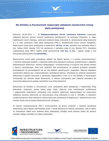 Na lotnisku w Pyrzowicach rozpoczęto układanie nawierzchni nowej płyty postojowej Katowice, 26.04.2012 r. – W Międzynarodowym Porcie Lotniczym Katowice rozpoczęto układanie górnych warstw nowych nawierzchni lotniskowych. W pierwszej kolejności, w ciągu najbliższych trzech miesięcy, wykonana zostanie droga kołowania D, skrzyżowanie dróg kołowania D z E oraz wschodnia część płyty postojowej (PPS-1) zlokalizowana przed nowym hangarem. Płaszczyzna nowej płyty postojowej o powierzchni 20 tys. m kw. pomieści trzy samoloty kodu C (np. Airbus A320, Boeing 737) lub zamiennie 2 samoloty kodu D (np. Boeing 757). Docelowo rozbudowana płyta PPS-1 będzie miała powierzchnię 110 tys. m kw. i będzie mogło z niej skorzystać jednocześnie 13 samolotów. Nawierzchnia nowej płyty postojowej składać się będzie łącznie z 4 warstw konstrukcyjnych: z warstwy stabilizacji podłoża z mieszanki betonowej popiołowo-żużlowej, produkowanej z odpadów paleniskowych elektrowni; warstwy odsączającej i mrozoochronnej z kruszywa oraz dwóch warstw z betonu cementowego. Rolą tych ostatnich jest przenoszenie na podłoże gruntowe obciążeń pochodzących od poruszających się po niej statków powietrznych i pojazdów. Obecnie układanie nawierzchni odbywa się z wykorzystaniem rozściełacza betonu. Umożliwia on ułożenie nawierzchni betonowej w pasach roboczych o szerokości odpowiednio 5 lub 15 m. Na lotnisku w Pyrzowicach funkcjonuje już również węzeł betoniarski, w którym wytwarzany jest materiał potrzebny do wykonania płaszczyzny postoju samolotów oraz dróg kołowania. Dotychczas na lotnisku w Pyrzowicach, przy rozbudowie płyty postojowej i modernizacji dróg kołowania, wykonano ponad jedną piątą robót. Obecnie trwa mechaniczne profilowanie i zagęszczanie podbudowy mineralnej oraz badania odbiorowe dopuszczające do rozpoczęcia układania warstwy betonowej na skrzyżowaniu dróg kołowania D oraz E. Ponadto, w okolicach modernizowanych dróg kołowania wykonywana jest kanalizacja energetyczna i teletechniczna oraz montaż studni pod przyszłą infrastrukturę do nawigacji. W rejonie rozbudowywanej PPS-1 kontynuowane są prace związane z budową kanalizacji deszczowej, która będzie odprowadzać wody z nowej płaszczyzny postoju samolotów. Jest to jedno ze znaczących zadań przy budowie płyty postojowej, którego koszt stanowi blisko 30 procent wartości całego kontraktu na roboty budowlane. Po zakończeniu prac budowlanych w 2013 roku, z płyty postojowej będzie mogło skorzystać dziesięć samolotów kodu C np. Airbus A320, Boeing 737 i trzy kodu D np. Boeing 757 lub zamiennie siedem kodu C i pięć kodu D. Ponadto nowa płaszczyzna postoju samolotów będzie jeszcze bezpieczniejsza, bowiem zostanie wyposażona w infrastrukturę pomagającą nawigować samoloty nawet przy widzialności wzdłuż drogi startowej nie mniejszej niż 350 m. Rozbudowa płyty postojowej oraz modernizacja dróg kołowania realizowane są w ramach największej, pod względem skali robót oraz nakładów finansowych, inwestycji pn. „Port Lotniczy w Katowicach – rozbudowa i modernizacja infrastruktury lotniskowej i portowej”. W zakresie tego projektu zostanie wybudowana także nowa droga startowa o długości 3200 m, natomiast obecny pas startowy zostanie przekształcony w drogę kołowania. Wartość inwestycji to ponad 405 mln zł netto. ### Informacje na temat Międzynarodowego Portu Lotniczego Katowice: Międzynarodowy Port Lotniczy Katowice w Pyrzowicach jest jednym z największych lotnisk w Polsce. W marcu br. w ruchu całkowitym w Katowice Airport odprawiono 155 770 pasażerów, o 9,5% więcej niż w tym samym miesiącu ubiegłego roku. Wzrost liczby podróżnych zanotowano w ruchu regularnym jak i czarterowym. W sezonie wiosna/lato 2012 siatka połączeń Katowice Airport obejmować będzie 34 połączenia do 13 europejskich państw. Aktualnie w Katowice Airport realizowany jest największy program rozbudowy infrastruktury w historii lotniska. Informacje na temat Projektu pn. „Port Lotniczy w Katowicach – rozbudowa i modernizacja infrastruktury lotniskowej i portowej”. W ramach projektu powstanie nowy pas startowy o długości 3200 m, natomiast obecna droga startowa zostanie przekształcona w drogę kołowania. Ponadto na lotnisku w Pyrzowicach zostanie wybudowana nowa płyta postojowa z piętnastoma stanowiskami dla statków powietrznych. Dzięki inwestycji wartej 405,19 mln zł netto do 2016 roku na pyrzowickim lotnisku powstanie ponad 357 tys. m² nowych nawierzchni lotniskowych, a 156,5 tys. m² zostanie przebudowanych. Projekt rozbudowy i modernizacji infrastruktury lotniska w Pyrzowicach (za wyjątkiem zadania dotyczącego przekształcenia istniejącej drogi startowej w drogę kołowania) realizowany jest przy wsparciu środków unijnych. Inwestycja współfinansowana jest z Funduszu Spójności w ramach Programu Operacyjnego Infrastruktura i Środowisko. Wartość dofinansowania to ponad 157 mln zł netto. Dodatkowych informacji udzieli: Cezary Orzech rzecznik prasowy GTL SA tel.: 600 281 798 e-mail: [email protected] Górnośląskie Towarzystwo Lotnicze SA Al. Korfantego 38 Tel.: +48 32 201 06 33 Fax: +48 32 201 06 34 www.gtl.com.pl