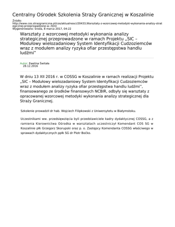 Centralny Ośrodek Szkolenia Straży Granicznej w Koszalinie Źródło: http://www.cos.strazgraniczna.pl/cos/aktualnosci/20433,Warsztaty-z-wzorcowej-metodyki-wykonania-analizy-strat egicznej-przeprowadzone-w-.html Wygenerowano: Środa, 8 marca 2017, 04:22 Warsztaty z wzorcowej metodyki wykonania analizy strategicznej przeprowadzone w ramach Projektu „SIC – Modułowy wielozadaniowy System Identyfikacji Cudzoziemców wraz z modułem analizy ryzyka ofiar przestępstwa handlu ludźmi” Autor: Ewelina Świtała 28.12.2016 W dniu 13 XII 2016 r. w COSSG w Koszalinie w ramach realizacji Projektu „SIC – Modułowy wielozadaniowy System Identyfikacji Cudzoziemców wraz z modułem analizy ryzyka ofiar przestępstwa handlu ludźmi”, finansowanego ze środków finansowych NCBIR, odbyły się warsztaty z opracowanej wzorcowej metodyki wykonania analizy strategicznej dla Straży Granicznej. Szkolenie prowadził dr hab. Wojciech Filipkowski z Uniwersytetu w Białymstoku. Uczestnikami ww. przedsięwzięcia byli przedstawiciele kadry dydaktycznej COSSG, a z ramienia Kierownictwa Ośrodka w warsztatach uczestniczył Komendant COS SG w Koszalinie płk Grzegorz Skorupski oraz p. o. Zastępcy Komendanta COSSG właściwego w sprawach dydaktycznych ppłk SG dr Piotr Boćko. Prowadzący warsztaty, dr hab. W. Filipkowski przedstawił wybrane ustrukturyzowane techniki analityczne stosowane w analizie strategicznej, kontekst i etapy analizy strategicznej (badania retrospekcyjne, ocena trendów, propozycje decyzji), rozróżnienie strategii kryminalistycznej i strategicznej analizy kryminalnej. Następnie, w odniesieniu do etapów analizy strategicznej, zostały przedstawione i scharakteryzowane ustrukturyzowane techniki analityczne opracowane przez R. J. Heuer’a i R. H. Pherson’a. Integralną częścią warsztatów w zakresie analizy strategicznej było omówienie i analiza Kazusu z odniesieniem do etapu poszukiwania alternatywnych scenariuszy.