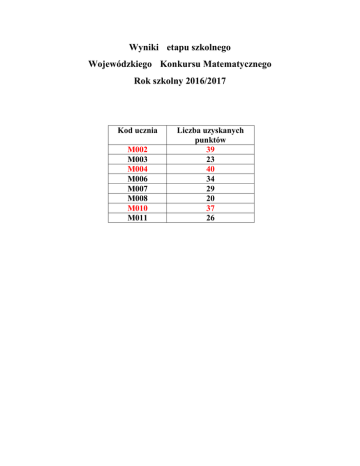 Wyniki etapu szkolnego Wojewódzkiego Konkursu Matematycznego Rok szkolny 2016/2017 Kod ucznia M002 M003 M004 M006 M007 M008 M010 M011 Liczba uzyskanych punktów 39 23 40 34 29 20 37 26 Wyniki etapu szkolnego Wojewódzkiego Konkursu Matematycznego Rok szkolny 2016/2017 Kod ucznia Liczba uzyskanych punktów M002 M003 M004 M006 39 23 40 34 Nazwisko imię/imiona ucznia Dydymski Oskar Piotr Przybylska Julia Michalak Agnieszka Anna Rogowski Hubert Krzysztof M007 M008 M010 M011 29 20 37 26 Rogalski Miłosz Piotr Antczak Kornel Leonard Urbaniak Adam Czarnecki Michał Mateusz Kl. III e III e III f III a III e III e II d III e Uczniowie zakwalifikowani do etapu rejonowego: 1. Michalak Agnieszka Anna ur. 13.11.2001 w Słupcy nauczyciel opiekun Danuta Pradelska 2. Dydymski Oskar Piotr ur. 12.06.2001 w Słupcy nauczyciel opiekun Danuta Pradelska 3. Urbaniak Adam ur. 22.01.2002 w Poznaniu nauczyciel opiekun Danuta Pradelska