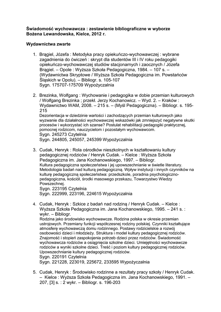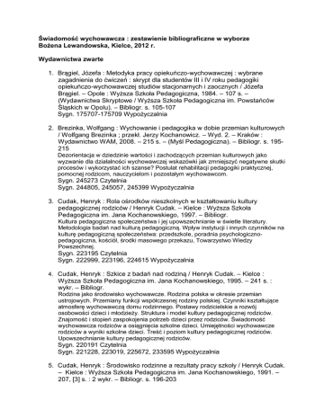 Świadomość wychowawcza : zestawienie bibliograficzne w wyborze Bożena Lewandowska, Kielce, 2012 r. Wydawnictwa zwarte 1. Brągiel, Józefa : Metodyka pracy opiekuńczo-wychowawczej : wybrane zagadnienia do ćwiczeń : skrypt dla studentów III i IV roku pedagogiki opiekuńczo-wychowawczej studiów stacjonarnych i zaocznych / Józefa Brągiel. – Opole : Wyższa Szkoła Pedagogiczna, 1984. – 107 s. – (Wydawnictwa Skryptowe / Wyższa Szkoła Pedagogiczna im. Powstańców Śląskich w Opolu). – Bibliogr. s. 105-107 Sygn. 175707-175709 Wypożyczalnia 2. Brezinka, Wolfgang : Wychowanie i pedagogika w dobie przemian kulturowych / Wolfgang Brezinka ; przekł. Jerzy Kochanowicz. – Wyd. 2. – Kraków : Wydawnictwo WAM, 2008. – 215 s. – (Myśl Pedagogiczna). – Bibliogr. s. 195215 Dezorientacja w dziedzinie wartości i zachodzących przemian kulturowych jako wyzwanie dla działalności wychowawczej wskazówki jak zmniejszyć negatywne skutki procesów i wykorzystać ich szanse? Postulat rehabilitacji pedagogiki praktycznej, pomocnej rodzicom, nauczycielom i pozostałym wychowawcom. Sygn. 245273 Czytelnia Sygn. 244805, 245057, 245399 Wypożyczalnia 3. Cudak, Henryk : Rola ośrodków nieszkolnych w kształtowaniu kultury pedagogicznej rodziców / Henryk Cudak. – Kielce : Wyższa Szkoła Pedagogiczna im. Jana Kochanowskiego, 1997. – Bibliogr. Kultura pedagogiczna społeczeństwa i jej upowszechnianie w świetle literatury. Metodologia badań nad kulturą pedagogiczną. Wpływ instytucji i innych czynników na kulturę pedagogiczną społeczeństwa: przedszkole, poradnia psychologicznopedagogiczna, kościół, środki masowego przekazu, Towarzystwo Wiedzy Powszechnej. Sygn. 223195 Czytelnia Sygn. 222999, 223196, 224615 Wypożyczalnia 4. Cudak, Henryk : Szkice z badań nad rodziną / Henryk Cudak. – Kielce : Wyższa Szkoła Pedagogiczna im. Jana Kochanowskiego, 1995. – 241 s. : wykr. – Bibliogr. Rodzina jako środowisko wychowawcze. Rodzina polska w okresie przemian ustrojowych. Przemiany funkcji współczesnej rodziny polskiej. Czynniki kształtujące atmosferę wychowawczą domu rodzinnego. Postawy rodzicielskie a rozwój osobowości dzieci i młodzieży. Struktura i model kultury pedagogicznej rodziców. Znajomość i stopień zaspokojenia potrzeb dzieci przez rodziców. Świadomość wychowawcza rodziców a osiągnięcia szkolne dzieci. Umiejętności wychowawcze rodziców a wyniki szkolne dzieci. Treść i poziom kultury pedagogicznej rodziców. Upowszechnianie kultury pedagogicznej rodziców. Sygn. 220191 Czytelnia Sygn. 221228, 223019, 225672, 233595 Wypożyczalnia 5. Cudak, Henryk : Środowisko rodzinne a rezultaty pracy szkoły / Henryk Cudak. – Kielce : Wyższa Szkoła Pedagogiczna im. Jana Kochanowskiego, 1991. – 207, [3] s. : 2 wykr. – Bibliogr. s. 196-203 Sygn. 210022 Czytelnia Sygn. 210024, 210743, 211460 Wypożyczalnia 6. Cudak, Sławomir : Świadomość wychowawcza rodziców // W: Encyklopedia pedagogiczna XXI wieku. T. 6, Su-U / red. wydawnictwa Marek Śnieciński ; red. prowadzący Encyklopedii Ewa Różycka. – Warszawa : Wydawnictwo Akademickie „Żak”, cop. 2007. – 454-456 Sygn. 244095 Czytelnia Sygn. 244096 Bibliografia 7. Dziecko w świecie rodziny : szkice o wychowaniu : praca zbiorowa / pod red. Bronisławy Dymary. – Kraków : „Impuls”, 1998. – 192 s.: rys., wykr., nuty . – (Nauczyciele Nauczycielom) Sygn. 224857 Czytelnia Sygn. 224858, 233075 Wypożyczalnia 8. Gurycka, Antonina : O sztuce wychowania dla wychowawców i nauczycieli / Antonina Gurycka. – Warszawa : Wydawnictwo Centralnego Ośrodka Doskonalenia Nauczycieli, 1997. – 156 s. : il. – Bibliogr. s.155-156 Sygn. 225212 Czytelnia Sygn. 224993 Wypożyczalnia 9. Kawula, Stanisław : Pedagogika rodziny : obszary i panorama problematyki / Stanisław Kawula, Józefa Brągiel, Andrzej W. Janke. – Toruń : Adam Marszałek, 2005 . – 470 s. : rys., tab., wykr. – Bibliogr. Spis treści: I. Polimorficzność i komplementarność badań nad współczesną rodziną. II. Rodzina jako grupa i instytucja opiekuńczo-wychowawcza. III. Pedagogika rodziny i wychowanie rodzinne. IV. Więzi społeczne w rodzinie. V. Rodzina o skumulowanych czynnikach patogennych. VI. Pedagogiczna typologizacja rodzin. VII. Rodzina a start społeczny i edukacyjny młodych pokoleń. VIII. Stosunki rodziny i szkoły. Integracja i syntonia. IX. Funkcja opiekuńcza współczesnej rodziny polskiej. X. Zagadnienie przemocy wobec dziecka w rodzinie. XI. Warunki wychowawcze bliźniąt w rodzinie. XII. Dziecko w rodzinie ryzyka - zagrożenia socjalne. XIII. Kultura pedagogiczna rodziców jako czynnik stymulacji rozwoju i wychowania młodego pokolenia. XIV. Mozaikowość i koloryt współczesnej rodziny. Sygn. 239573 Czytelnia 10. Kawula, Stanisław : Rozdroża i szanse wychowania / Stanisław Kawula ; Wyższa Szkoła Pedagogiczna w Olsztynie. – Olsztyn : Wyższa Szkoła Pedagogiczna, 1986. – 256 s. : rys., 1 wykr. Sygn. 185927 Czytelnia 11. Kawula, Stanisław : Studia z pedagogiki społecznej / Stanisław Kawula. – Olsztyn : Wyższa Szkoła Pedagogiczna, 1996. – 414 s. Zawiera m.in.: zagadnienie integracji oddziaływań wychowawczych szkoły i rodziny, funkcjonowanie systemu wychowania, rodzina jako składnik systemu wychowawczego, płaszczyzny powiązań opiekuńczo-wychowawczych rodziny i szkoły, zagadnienie wskaźników w badaniach nad współpracą wychowawczą rodziny i szkoły, zasady pedagogicznych badań systemowych (na przykładzie rodziny). Sygn. 231243 Czytelnia 12. Kawula, Stanisław : Świadomość wychowawcza rodziców : stan aktualny, niektóre uwarunkowania i skutki oraz perspektywy / Stanisław Kawula. – Toruń : Uniwersytet Mikołaja Kopernika, 1975. – 182, [1] s. Czytelnia Pedagogiczna Uniwersytetu Jana Kochanowskiego 13. Kształtowanie samoświadomości nauczycieli w procesie wychowawczym / [red. nauk. Barbara Strupczewska, Zbigniew Zaborowski] ; Instytut Kształcenia Nauczy
