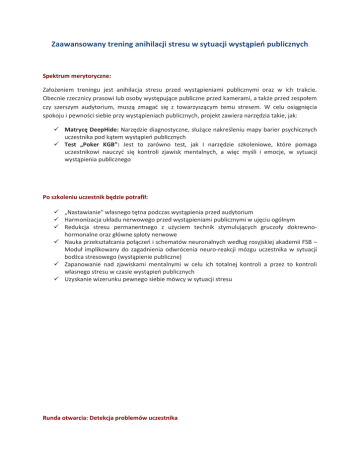Zaawansowany trening anihilacji stresu w sytuacji wystąpieo publicznych Spektrum merytoryczne: Założeniem treningu jest anihilacja stresu przed wystąpieniami publicznymi oraz w ich trakcie. Obecnie rzecznicy prasowi lub osoby występujące publiczne przed kamerami, a także przed zespołem czy szerszym audytorium, muszą zmagad się z towarzyszącym temu stresem. W celu osiągnięcia spokoju i pewności siebie przy wystąpieniach publicznych, projekt zawiera narzędzia takie, jak: Matrycę DeepHide: Narzędzie diagnostyczne, służące nakreśleniu mapy barier psychicznych uczestnika pod kątem wystąpieo publicznych Test „Poker KGB”: Jest to zarówno test, jak I narzędzie szkoleniowe, które pomaga uczestnikowi nauczyd się kontroli zjawisk mentalnych, a więc myśli i emocje, w sytuacji wystąpienia publicznego Po szkoleniu uczestnik będzie potrafił: „Nastawianie” własnego tętna podczas wystąpienia przed audytorium Harmonizacja układu nerwowego przed wystąpieniami publicznymi w ujęciu ogólnym Redukcja stresu permanentnego z użyciem technik stymulujących gruczoły dokrewnohormonalne oraz główne sploty nerwowe Nauka przekształcania połączeo i schematów neuronalnych według rosyjskiej akademii FSB – Moduł implikowany do zagadnienia odwrócenia neuro-reakcji mózgu uczestnika w sytuacji bodźca stresowego (wystąpienie publiczne) Zapanowanie nad zjawiskami mentalnymi w celu ich totalnej kontroli a przez to kontroli własnego stresu w czasie wystąpieo publicznych Uzyskanie wizerunku pewnego siebie mówcy w sytuacji stresu Runda otwarcia: Detekcja problemów uczestnika 1. Test rosyjskich dyplomatów „Poker KGB” w wersji interaktywnej, czyli detekcja ognisk lękowych uczestnika oraz głównych kanałów percepcji: Test „Poker KGB” z użyciem materiałów interaktywnych 3. Model „Matrycy DeepHide” implikowany do schematów redukcji barier interpersonalnych, aby nie tylko zredukowad stres uczestnika w sytuacji wystąpienia publicznego, ale także, aby podnieśd jego efektywnośd i skutecznośd: Detekcja własnych barier w zakresie komunikacji interpersonalnej poprzez Matrycę DeepHide („Ukryte Głęboko”) oraz wskazanie kierunku ich obejścia Runda presji: Przepracowywanie problemów uczestnika 1. Omówienie zlokalizowanych problemów pod kątem układu nerwowego, psychiki, mapy hormonalnej uczestnika, a także jego głównych warstw lękowych: Narzędzia pracy z własną psychiką w celu przepracowania własnych barier w zakresie wystąpieo publicznych Narzędzia do natychmiastowej redukcji stresu przed wystąpieniami publicznymi oraz w ich trakcie; „Nastawianie” własnego tętna podczas wystąpienia przed audytorium Harmonizacja układu nerwowego przed wystąpieniami publicznymi w ujęciu ogólnym 2. Redukcja stresu permanentnego z użyciem technik stymulujących gruczoły dokrewnohormonalne oraz harmonizujących układ nerwowy: Ćwiczenia oddechowe: Wzmaganie aktywności gruczołów dokrewnych (poziom mitochondrialny) i splotów nerwowych (poziom pola elektromagnetycznego) poprzez serię dwiczeo oddechowych Gruczoły dokrewne: Aktywacja gruczołów dokrewnych i splotów nerwowych w celu zwiększenia poziomu fal EEG mózgu do częstotliwości 42 Hz gamma Fale EEG mózgu 42 Hz gamma: Wykorzystanie fal EEG mózgu do jonizacji płynu mózgowordzeniowego dla harmonizacji całokształtu układu nerwowego uczestnika Jonizacja płynu mózgowo-rdzeniowego:Działanie poprzez trzon układu nerwowego na warstwę psychiczną uczestnika (auto-rewitalizacja konstruktu EGO i nieświadomej sfery uwarunkowao) oraz na jego ciało Oczyszczenie pamięci komórkowej i podświadomości:Oczyszczenie tkanki miękkiej ciała z nagromadzonych w nim napięd w rejonach mięśniowych Świadomośd spoglądająca sama w siebie: Uzyskanie stanu wysokiej relaksacji, który stanowi antystresowy trening dla ludzkiego mózgu Efekt koocowy: Efektem powyższych metod są m.in.: niski poziom stresu, wysoka aktywnośd obszaru mózgu odpowiedzialnego za radośd i euforię, długofalowe oraz stałe zredukowanie stresu do poziomu głębokiego komfortu. Wpływ powyższych praktyk na obszary mózgu udokumentowane są licznymi badaniami, przeprowadzanymi m.in. przez Uniwersytet Harvarda czy Oxford. 3. Nauka przekształcania połączeo i schematów neuronalnych według rosyjskiej akademii FSB – Moduł implikowany do zagadnienia odwrócenia neuro-reakcji mózgu uczestnika w sytuacji bodźca stresowego (wystąpienie publiczne): Odświeżenie ścieżek neuronalnych w sytuacji bodźca stresowego: Pobudzamy mózg do przypomnienia sobie swoich schematów reagowania w sytuacji stresu w czasie wystąpienia Zmiana ścieżek neuronalnych i mechanizmów percepcji układu nerwowego przy bodźcach stresowych: Dokonujemy przekształcenia ścieżek reagowania mózgu na bodziec stresowy przy użyciu technik oddechowych oraz technik pracy z obręczą barkową i świadomością, które oszukują mózg. W ten sposób wytwarzamy reakcję neuronalną: „Sytuacja stresowa oszukanie percepcji mózgu i pozytywna emocja na sytuacje stresową przekształcenie ścieżki neuronalnej w procesie reagowania na stres.” Neuronalne kotwiczenie stanu rozluźnienia, które można włączyd w każdej sytuacji stresowej według schematu „klucz połączenia neuronalne zmiana chemii ciała na poziomie stresogennym pozytywna emocja”: Ćwiczenie polega na kotwiczeniu mózgu w danej mapie hormonalnej, związanej z pozytywną emocją, która zostaje uwypuklona przy każdym momencie „włączenia” tejże kotwicy (ominięcie sytuacji stresowych poprzez oszukiwanie mózgu) Runda zamknięcia: Przepracowywanie problemów uczestnika 1.Zapanowanie nad zjawiskami mentalnymi w celu ich totalnej kontroli a przez to kontroli własnego stresu w czasie wystąpieo publicznych: Natychmiastowa anihilacja stresu – dwiczenie praktyczne:Wchodzenie w stan Czystej Świadomości, a więc percepcji sensorycznej poza poziomem mentalnym. 