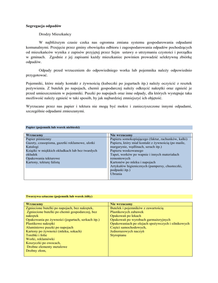 Segregacja odpadów Drodzy Mieszkańcy W najbliższym czasie