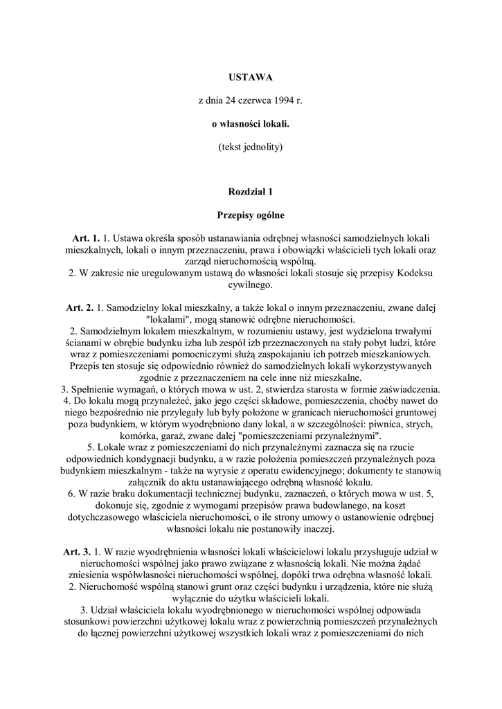 USTAWA z dnia 24 czerwca 1994 r. o własności lokali. (tekst jednolity) Rozdział 1 Przepisy ogólne Art. 1. 1. Ustawa określa sposób ustanawiania odrębnej własności samodzielnych lokali mieszkalnych, lokali o innym przeznaczeniu, prawa i obowiązki właścicieli tych lokali oraz zarząd nieruchomością wspólną. 2. W zakresie nie uregulowanym ustawą do własności lokali stosuje się przepisy Kodeksu cywilnego. Art. 2. 1. Samodzielny lokal mieszkalny, a także lokal o innym przeznaczeniu, zwane dalej "lokalami", mogą stanowić odrębne nieruchomości. 2. Samodzielnym lokalem mieszkalnym, w rozumieniu ustawy, jest wydzielona trwałymi ścianami w obrębie budynku izba lub zespół izb przeznaczonych na stały pobyt ludzi, które wraz z pomieszczeniami pomocniczymi służą zaspokajaniu ich potrzeb mieszkaniowych. Przepis ten stosuje się odpowiednio również do samodzielnych lokali wykorzystywanych zgodnie z przeznaczeniem na cele inne niż mieszkalne. 3. Spełnienie wymagań, o których mowa w ust. 2, stwierdza starosta w formie zaświadczenia. 4. Do lokalu mogą przynależeć, jako jego części składowe, pomieszczenia, choćby nawet do niego bezpośrednio nie przylegały lub były położone w granicach nieruchomości gruntowej poza budynkiem, w którym wyodrębniono dany lokal, a w szczególności: piwnica, strych, komórka, garaż, zwane dalej "pomieszczeniami przynależnymi". 5. Lokale wraz z pomieszczeniami do nich przynależnymi zaznacza się na rzucie odpowiednich kondygnacji budynku, a w razie położenia pomieszczeń przynależnych poza budynkiem mieszkalnym - także na wyrysie z operatu ewidencyjnego; dokumenty te stanowią załącznik do aktu ustanawiającego odrębną własność lokalu. 6. W razie braku dokumentacji technicznej budynku, zaznaczeń, o których mowa w ust. 5, dokonuje się, zgodnie z wymogami przepisów prawa budowlanego, na koszt dotychczasowego właściciela nieruchomości, o ile strony umowy o ustanowienie odrębnej własności lokalu nie postanowiły inaczej. Art. 3. 1. W razie wyodrębnienia własności lokali właścicielowi lokalu przysługuje udział w nieruchomości wspólnej jako prawo związane z własnością lokali. Nie można żądać zniesienia współwłasności nieruchomości wspólnej, dopóki trwa odrębna własność lokali. 2. Nieruchomość wspólną stanowi grunt oraz części budynku i urządzenia, które nie służą wyłącznie do użytku właścicieli lokali. 3. Udział właściciela lokalu wyodrębnionego w nieruchomości wspólnej odpowiada stosunkowi powierzchni użytkowej lokalu wraz z powierzchnią pomieszczeń przynależnych do łącznej powierzchni użytkowej wszystkich lokali wraz z pomieszczeniami do nich przynależnymi. Udział właściciela samodzielnych lokali niewyodrębnionych w nieruchomości wspólnej odpowiada stosunkowi powierzchni użytkowej tych lokali wraz z powierzchnią pomieszczeń przynależnych do łącznej powierzchni użytkowej wszystkich lokali wraz z pomieszczeniami do nich przynależnymi. 4. Do wyznaczenia stosunku, o którym mowa w ust. 3, niezbędne jest określenie, oddzielnie dla każdego samodzielnego lokalu, jego powierzchni użytkowej wraz z powierzchnią pomieszczeń do niego przynależnych. 5. Jeżeli nieruchomość, z której wyodrębnia się własność lokali, stanowi grunt zabudowany kilkoma budynkami, udział właściciela lokalu wyodrębnionego w nieruchomości wspólnej odpowiada stosunkowi powierzchni użytkowej lokalu wraz z powierzchnią pomieszczeń przynależnych do łącznej powierzchni użytkowej wszystkich lokali wraz z pomieszczeniami do nich przynależnymi. 6. W wypadku gdy na podstawie jednej czynności prawnej dokonanej przez właściciela lub przez wszystkich współwłaścicieli nieruchomości następuje wyodrębnienie wszystkich lokali, wysokość udziałów, o których mowa w ust. 1, określają odpowiednio w umowie właściciel lub współwłaściciele. 7. W budynkach, w których nastąpiło wyodrębnienie własności co najmniej jednego lokalu i ustalenie wysokości udziałów w nieruchomości wspólnej bez uwzględnienia powierzchni pomieszczeń przynależnych lub w sposób inny niż określony w ust. 3, a przy wyodrębnianiu kolejnych lokali ustalano wysokość udziałów w nieruchomości wspólnej w taki sam sposób, do czasu wyodrębnienia ostatniego lokalu stosuje się zasady obliczania udziału w nieruchomości wspólnej takie, jak przy wyodrębnieniu pierwszego lokalu. Przepisu zdania poprzedzającego nie stosuje się, jeżeli wszyscy właściciele lokali wyodrębnionych i dotychczasowy właściciel nieruchomości dokonają w umowie nowego ustalenia wysokości udziałów w nieruchomości wspólnej. Art. 3a. (1) 1. Przy oddawaniu w użytkowanie wieczyste ułamkowej części gruntu, jako prawa związanego z odrębną własnością lokali, stosuje się następujące zasady: 1) nie oddaje się gruntu we współużytkowanie wieczyste, jeżeli stanowi on przedmiot współwłasności związanej z własnością uprzednio wyodrębnionych lokali, 2) nie sprzedaje się udziału we współwłasności gruntu, jeżeli grunt ten stanowi przedmiot współużytkowania wieczystego związanego z własnością uprzednio wyodrębnionych lokali, 3) ustala się jeden termin trwania prawa użytkowania wieczystego w odniesieniu do wszystkich udziałów we współużytkowaniu wieczystym, niezależnie od daty wyodrębnienia lokalu, z którym jest związany udział w tym prawie. 2. Jeżeli przy ustanowieniu odrębnej własności lokali ustanowiono różne terminy trwania prawa współużytkowania wieczystego przynależnej do tych lokali działki budowlanej, właściciele wyodrębnionych lokali mogą żądać zmiany terminów przez przyjęcie jednego terminu dla wszystkich udziałów we współużytkowaniu wieczystym tej działki. Z żądaniem takim może wystąpić także właściwy organ. Termin ten ustanawia się stosownie do najdalszego terminu ustalonego dla pozostałych u