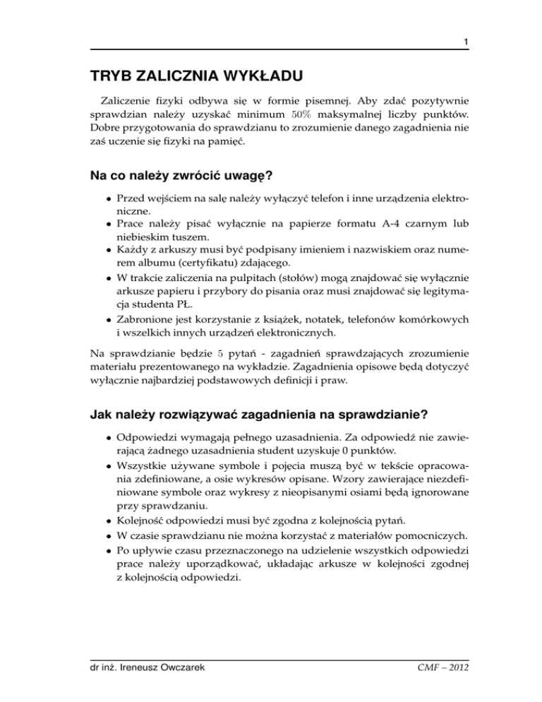 1 TRYB ZALICZNIA WYKŁADU Zaliczenie fizyki odbywa si˛e w formie pisemnej. Aby zdać pozytywnie sprawdzian należy uzyskać minimum 50% maksymalnej liczby punktów. Dobre przygotowania do sprawdzianu to zrozumienie danego zagadnienia nie zaś uczenie si˛e fizyki na pami˛eć. Na co należy zwrócić uwage? ˛ • Przed wejściem na sal˛e należy wyłaczyć ˛ telefon i inne urzadzenia ˛ elektroniczne. • Prace należy pisać wyłacznie ˛ na papierze formatu A-4 czarnym lub niebieskim tuszem. • Każdy z arkuszy musi być podpisany imieniem i nazwiskiem oraz numerem albumu (certyfikatu) zdajacego. ˛ • W trakcie zaliczenia na pulpitach (stołów) moga˛ znajdować si˛e wyłacznie ˛ arkusze papieru i przybory do pisania oraz musi znajdować si˛e legitymacja studenta PŁ. • Zabronione jest korzystanie z ksia˛żek, notatek, telefonów komórkowych i wszelkich innych urzadze ˛ ń elektronicznych. Na sprawdzianie b˛edzie 5 pytań - zagadnień sprawdzajacych ˛ zrozumienie materiału prezentowanego na wykładzie. Zagadnienia opisowe b˛eda˛ dotyczyć wyłacznie ˛ najbardziej podstawowych definicji i praw. Jak należy rozwiazywa ˛ ć zagadnienia na sprawdzianie? • Odpowiedzi wymagaja˛ pełnego uzasadnienia. Za odpowiedź nie zawierajac ˛ a˛ żadnego uzasadnienia student uzyskuje 0 punktów. • Wszystkie używane symbole i poj˛ecia musza˛ być w tekście opracowania zdefiniowane, a osie wykresów opisane. Wzory zawierajace ˛ niezdefiniowane symbole oraz wykresy z nieopisanymi osiami b˛eda˛ ignorowane przy sprawdzaniu. • Kolejność odpowiedzi musi być zgodna z kolejnościa˛ pytań. • W czasie sprawdzianu nie można korzystać z materiałów pomocniczych. • Po upływie czasu przeznaczonego na udzielenie wszystkich odpowiedzi prace należy uporzadkować, ˛ układajac ˛ arkusze w kolejności zgodnej z kolejnościa˛ odpowiedzi. dr inż. Ireneusz Owczarek CMF – 2012 2 Ocena pracy i cena końcowa • Odpowiedzi na wszystkie pytania i zagadnienia oceniane b˛eda˛ w skali 0 − 5 punktów. • Warunkiem uzyskania zaliczenia z cz˛eści pisemnej jest uzyskanie za wszystkie odpowiedzi sumarycznej liczby punktów, stanowiacej ˛ co najmniej 50% liczby punktów możliwych do zdobycia. dr inż. Ireneusz Owczarek CMF – 2012